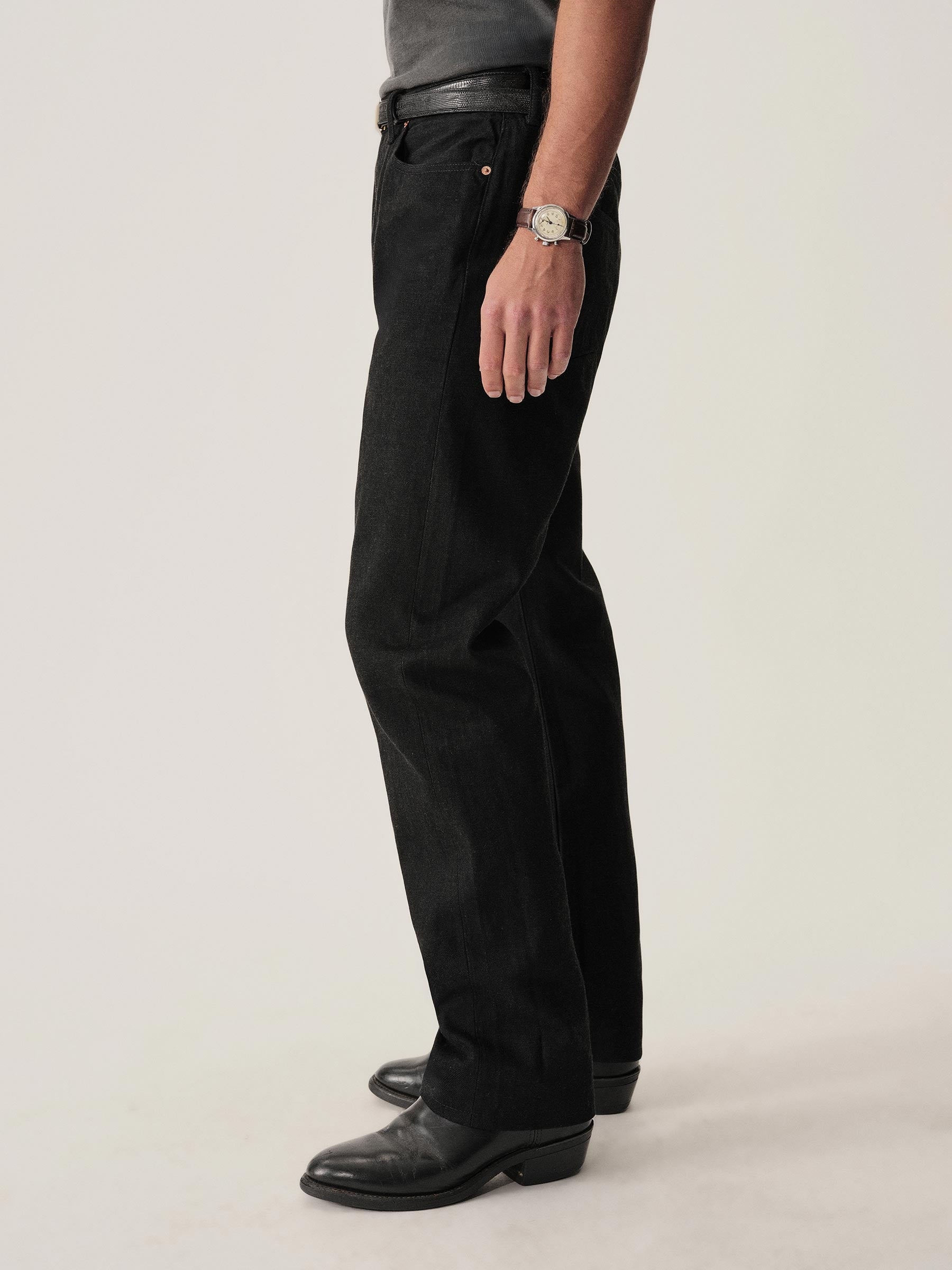 A classic 5-pocket jean in our Full Saddle fit: high-rise, straight through the thigh and leg. Inspired by blue jeans from the 1940s through the 1960s, this shuttle loomed 14 oz. selvedge denim is unsanforized, and has an organic texture that develops more character with every wear. Garment rinsed for a lived-in feel. Details include copper rivets and a metal tack button fly.