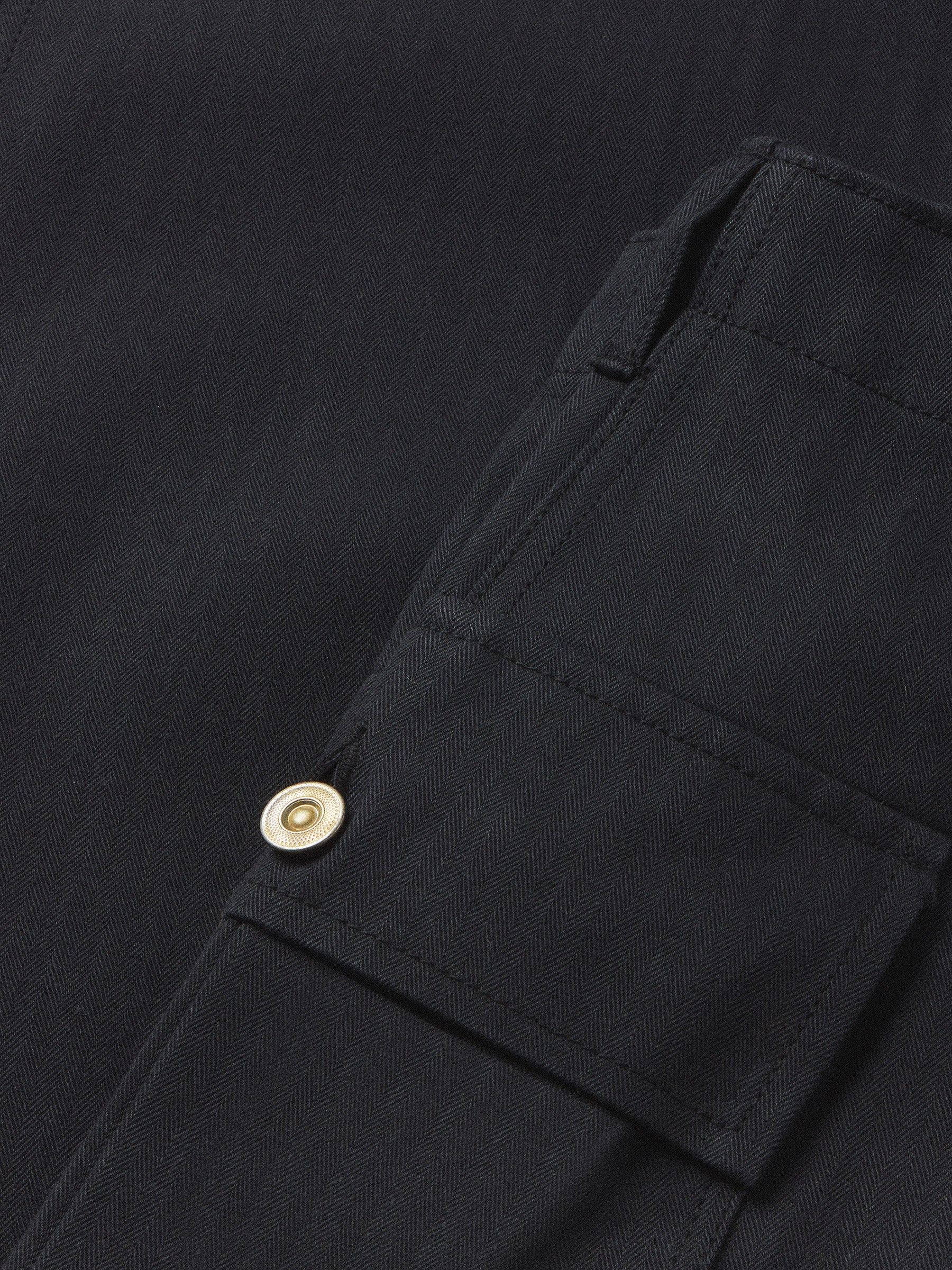 Based on the fatigue trousers of the US Army during WWII, these HBTs –– Herring Bone Twill, so called for the chevron shape of the weave –– feature a generous cut and two large hip pockets. Made from 11 oz cotton in a classic “Frog Skin” camouflage used by the US during WWII. These trousers can take any abuse; you can throw them at them and still clean them up smartly. The unfinished iron buttons will patina with wear and wash.
