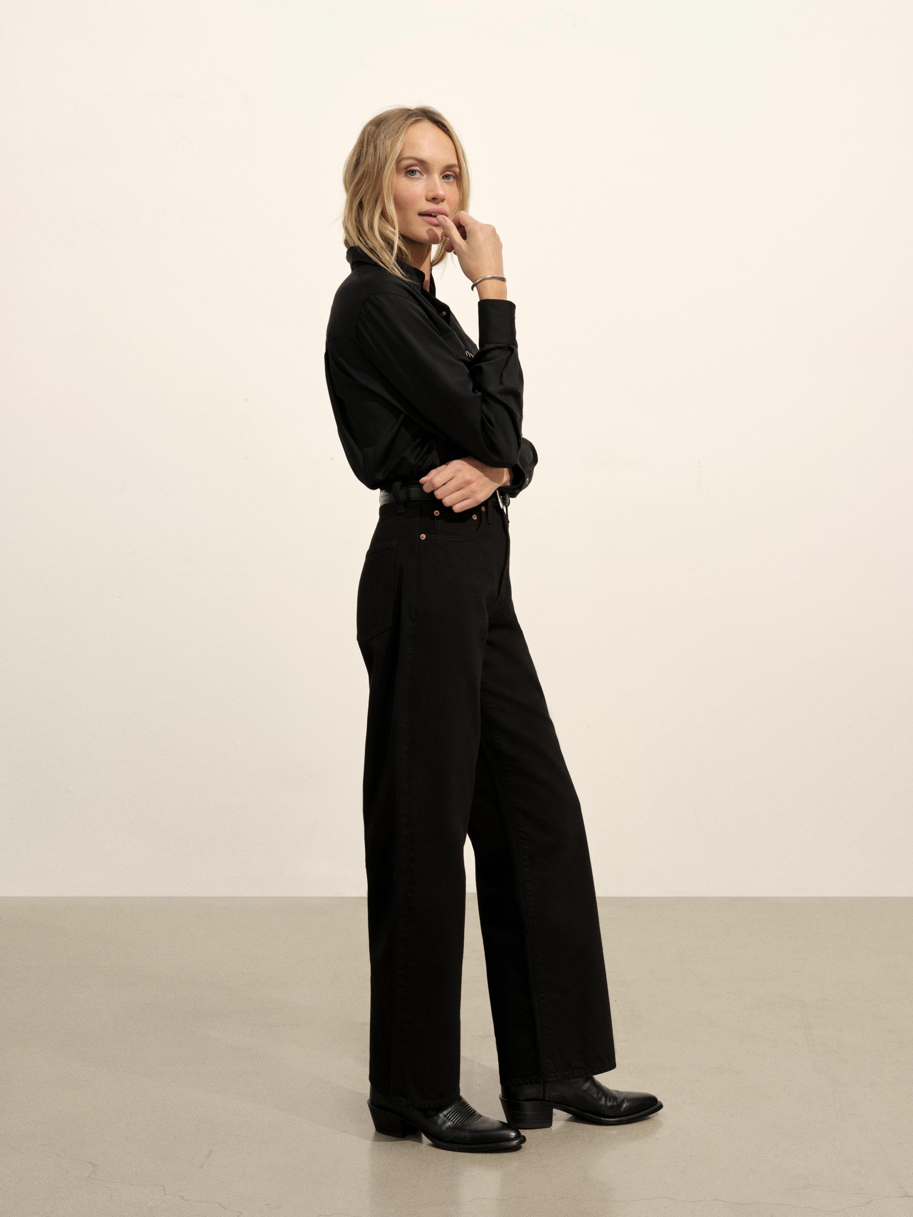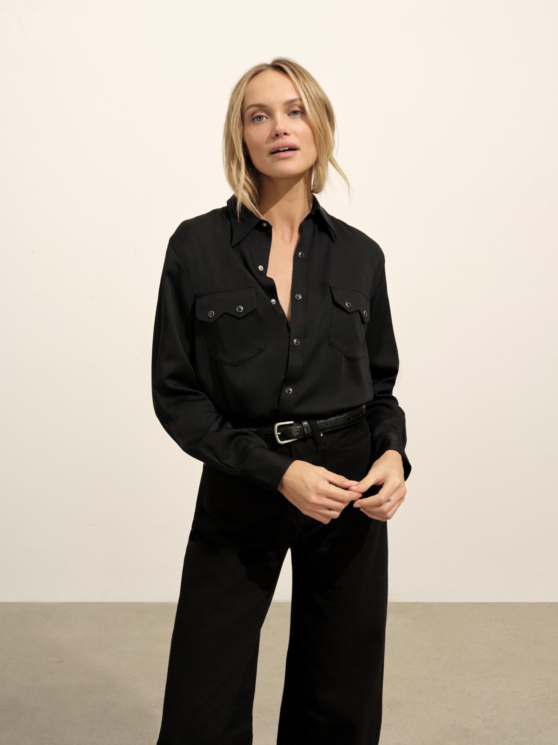 A silky, mid-century-inspired Western shirt with a relaxed body, distinct sawtooth pockets, and an arched back yoke with pleats. Cut from rayon modal and finished with French seams and pearl snaps.