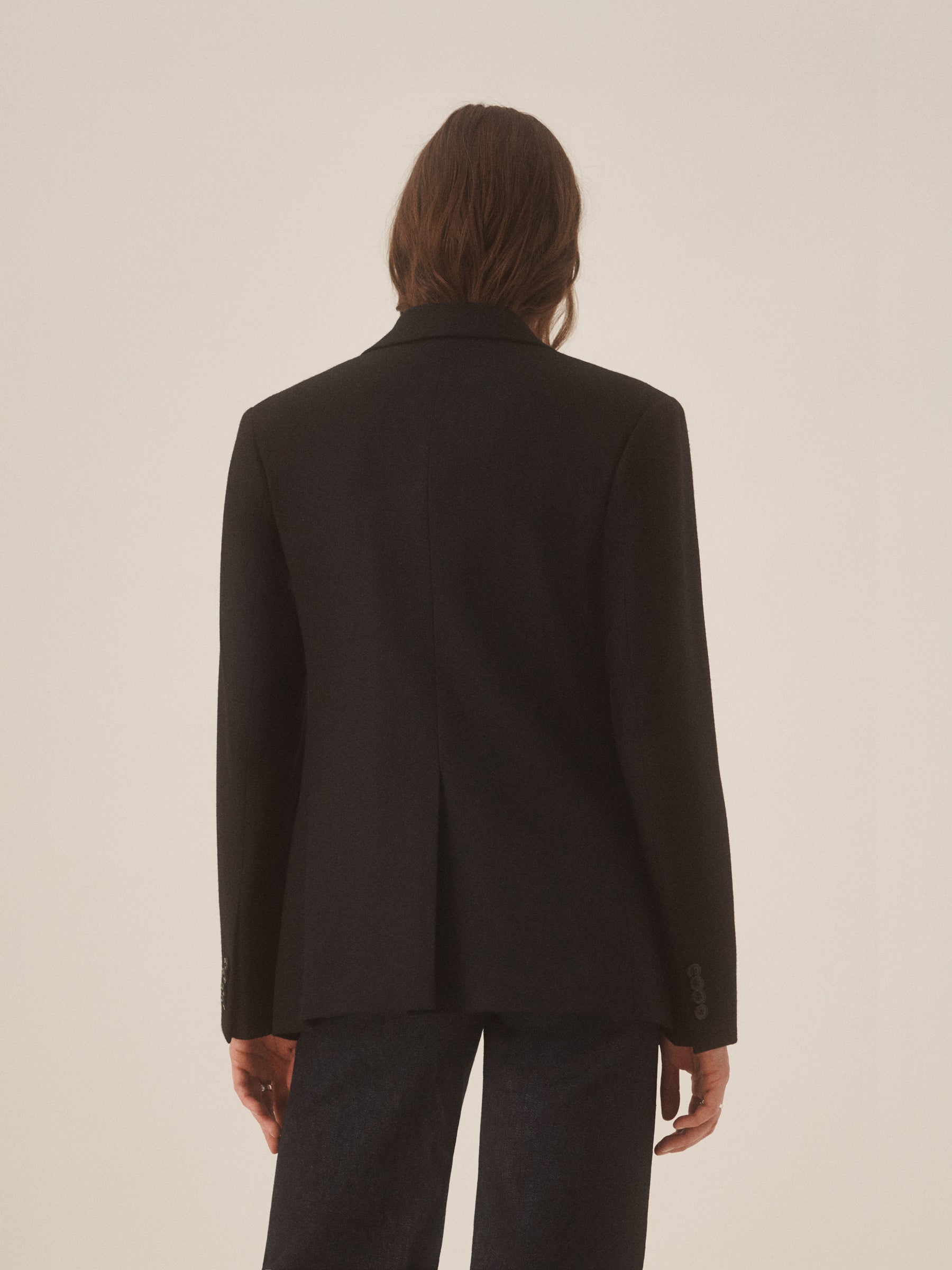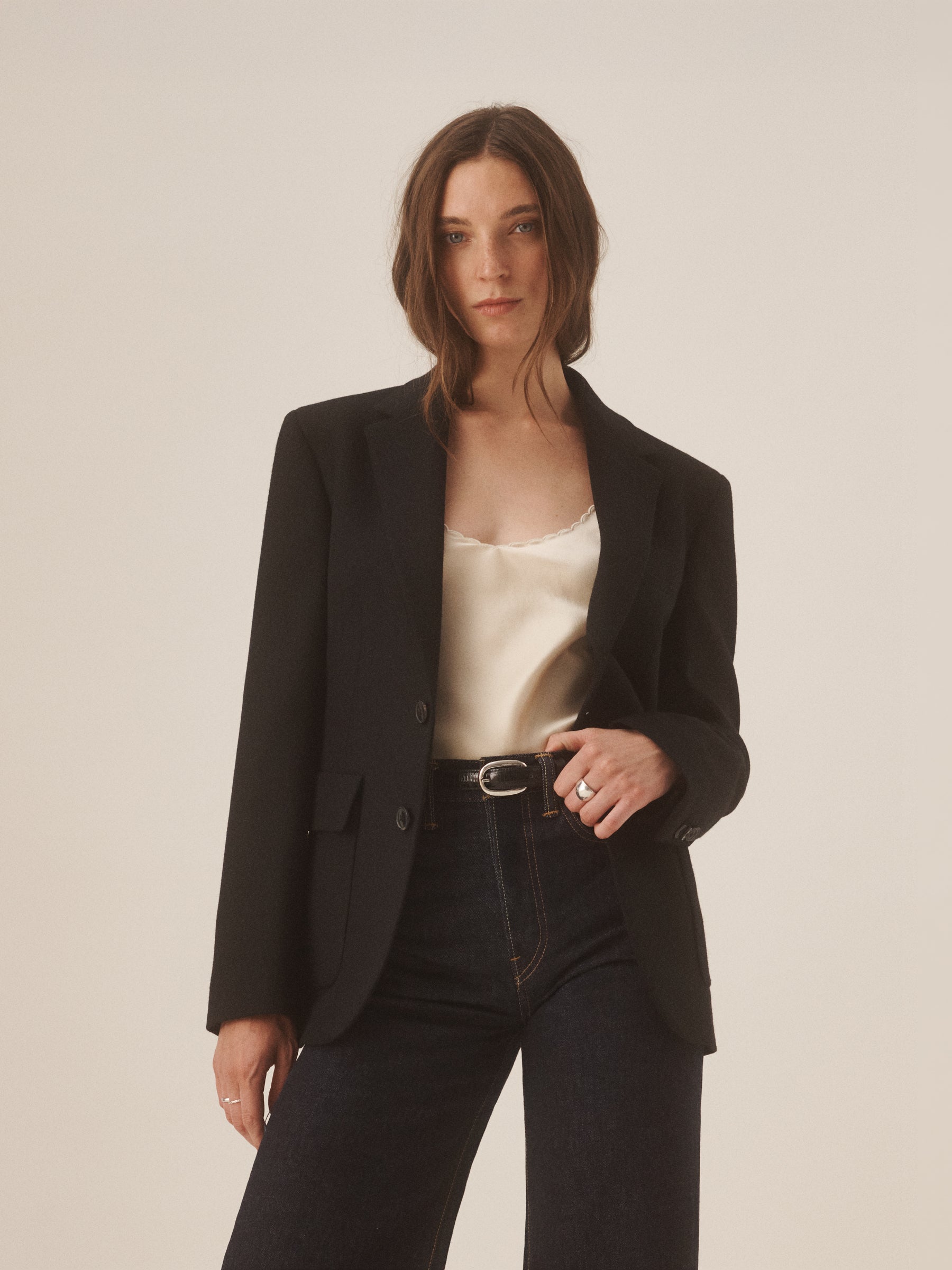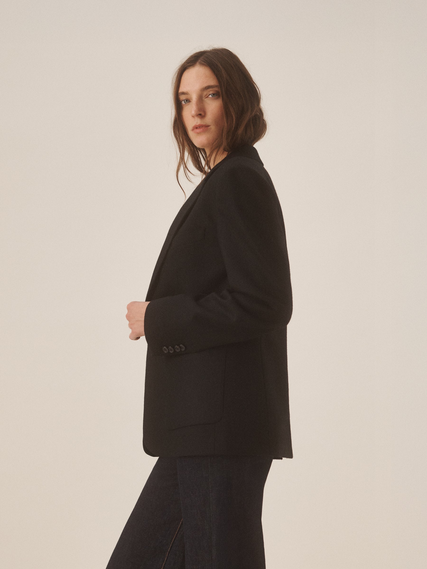 A slightly relaxed blazer cut from textured 100% wool peppered tweed. Built with a two-button front, front patch pockets with flaps, and classic vintage tailoring details. Fully lined for structure and comfort.