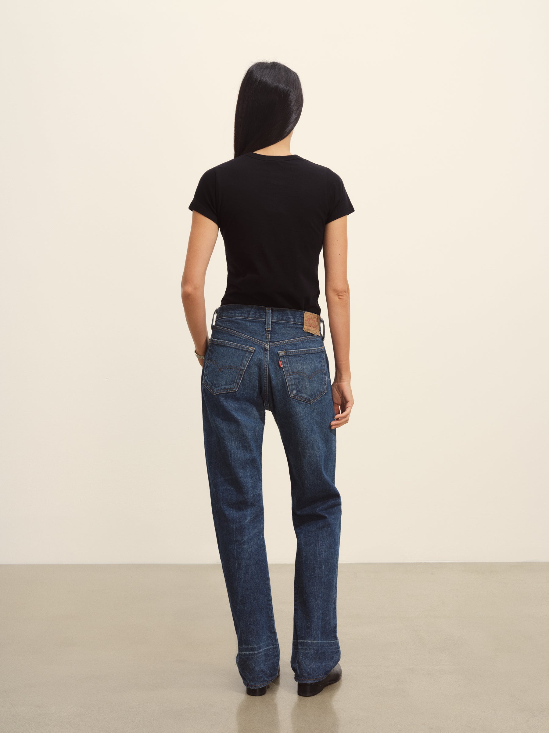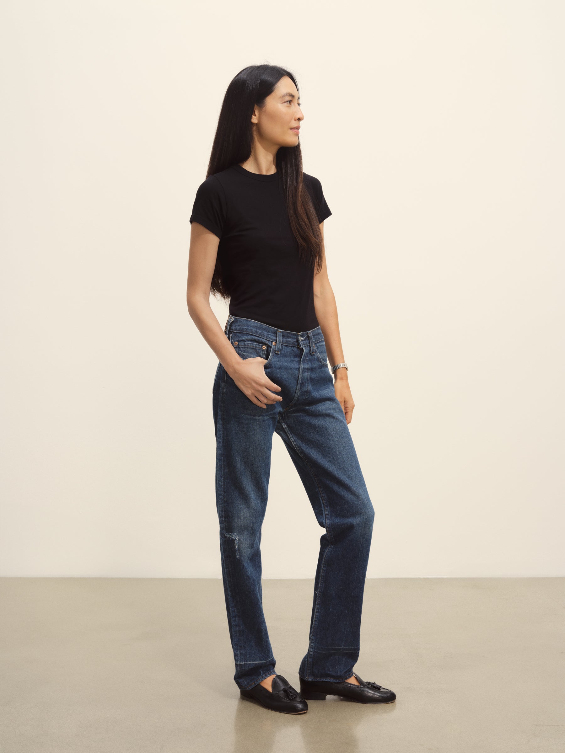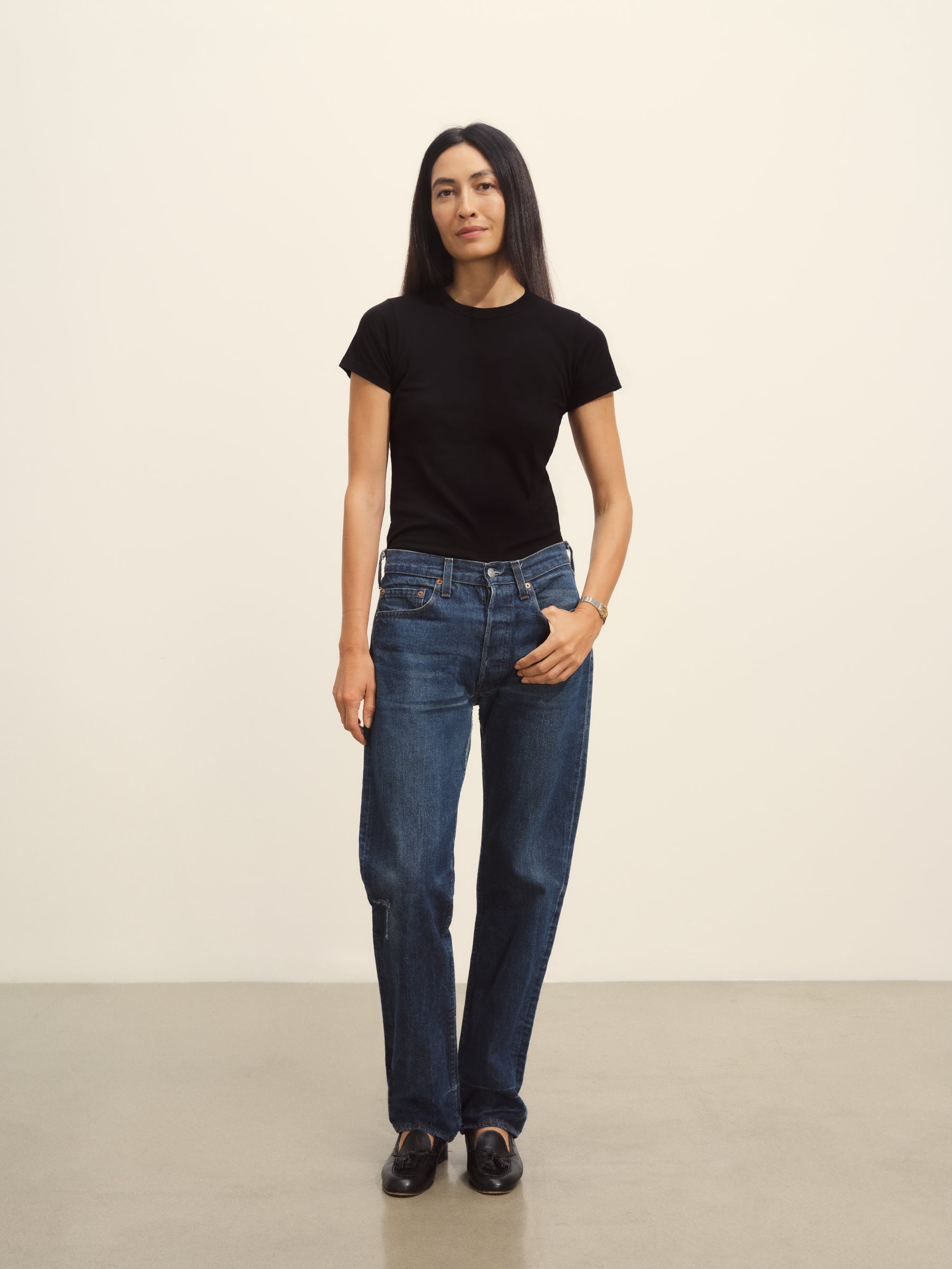 Slim fit short sleeve crewneck tee with a straight hem in 120 GSM jersey, knit from long-staple Supima cotton. Constructed with a durable rib stitch collar and double-needle cover stitch hem. Garment washed with softener for a lived-in feel.