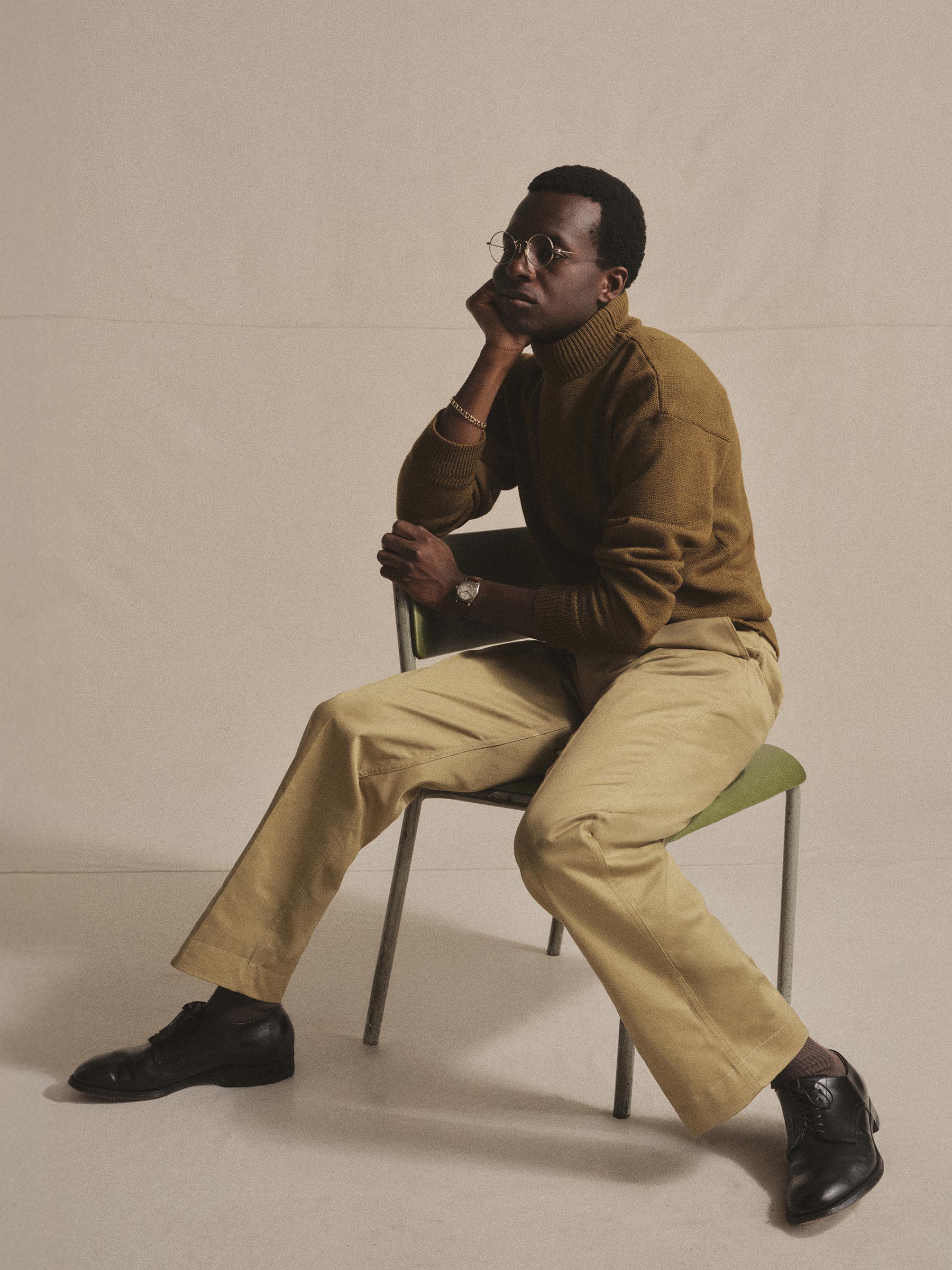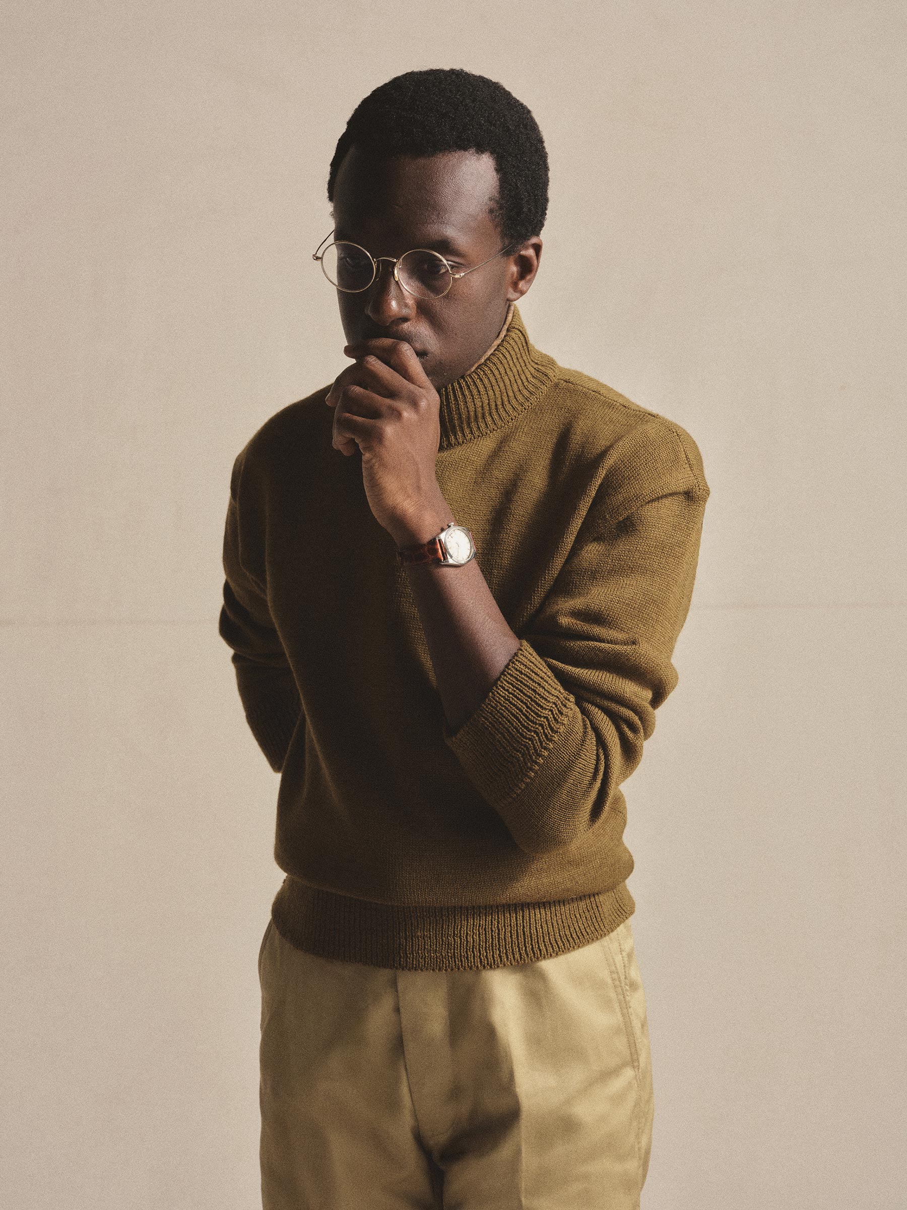 Anatomica’s Mock Neck Sweater draws from U.S. military knits of the 1940s. Made in Japan from a blend of British down wool and South American wool, it’s densely woven for warmth, durability, and texture. The mock neck sits just below the chin for a clean, classic profile, while long ribbing at the cuffs and hem faithfully reproduces the original design, enhancing fit and wind resistance.