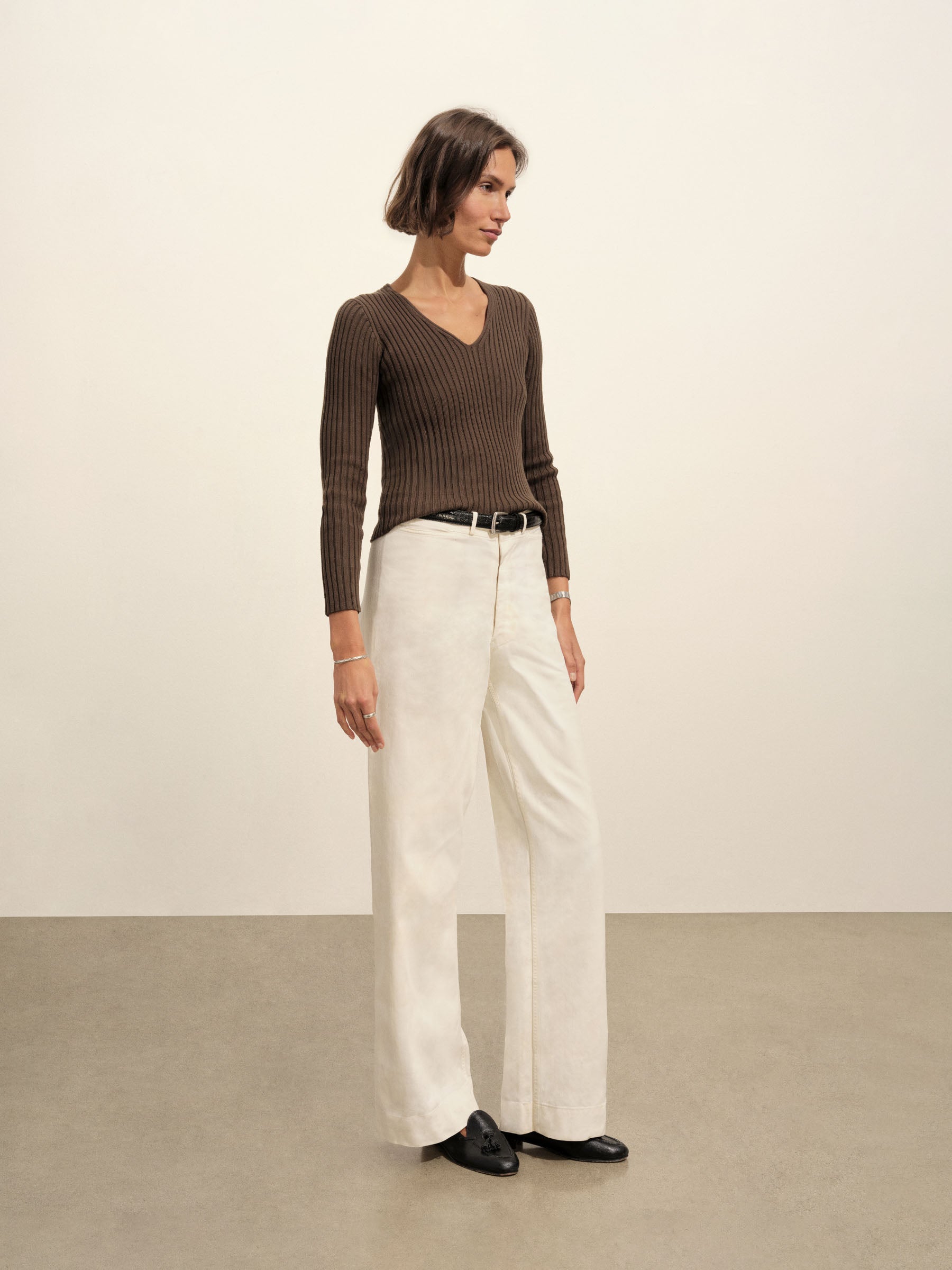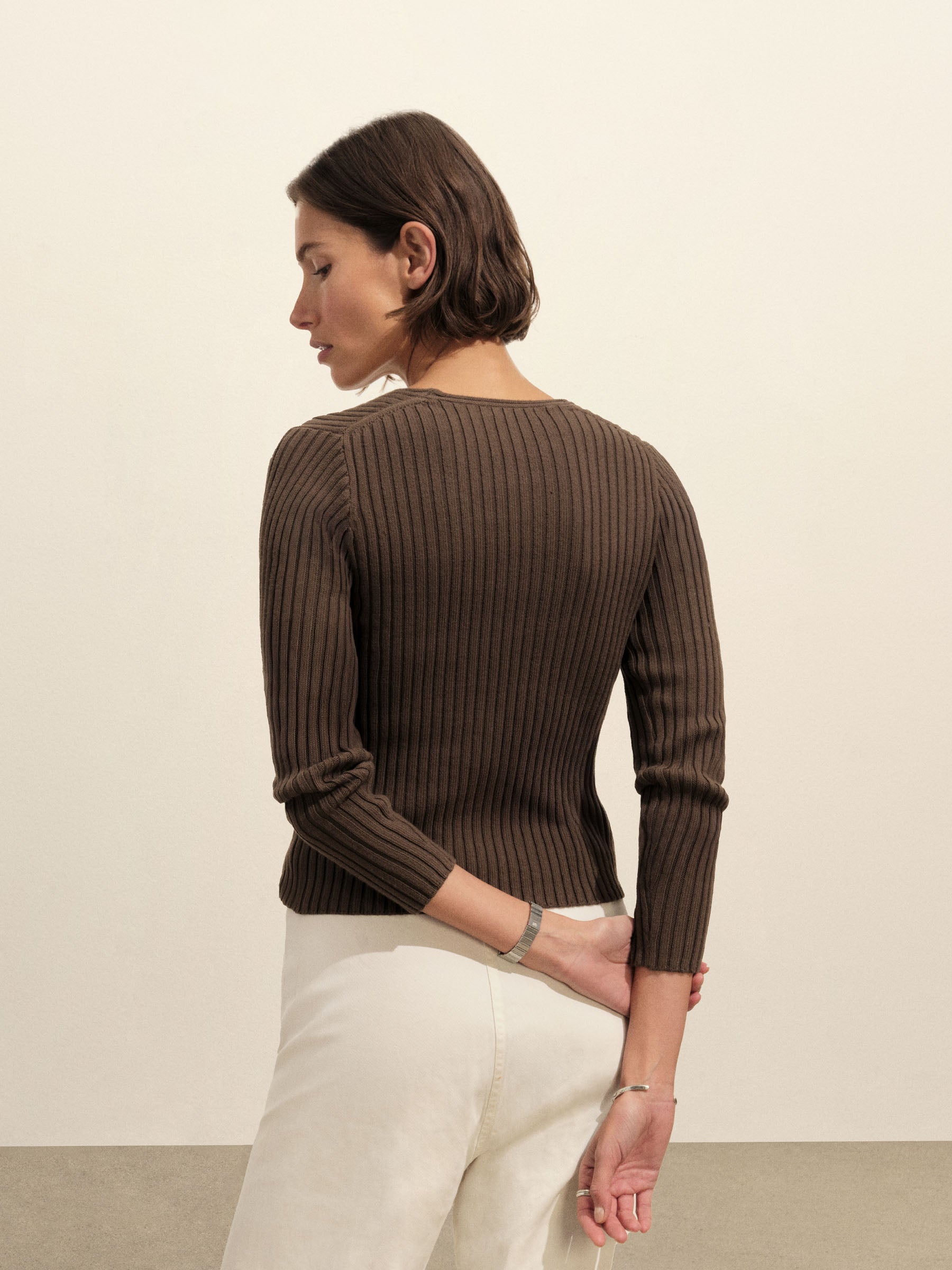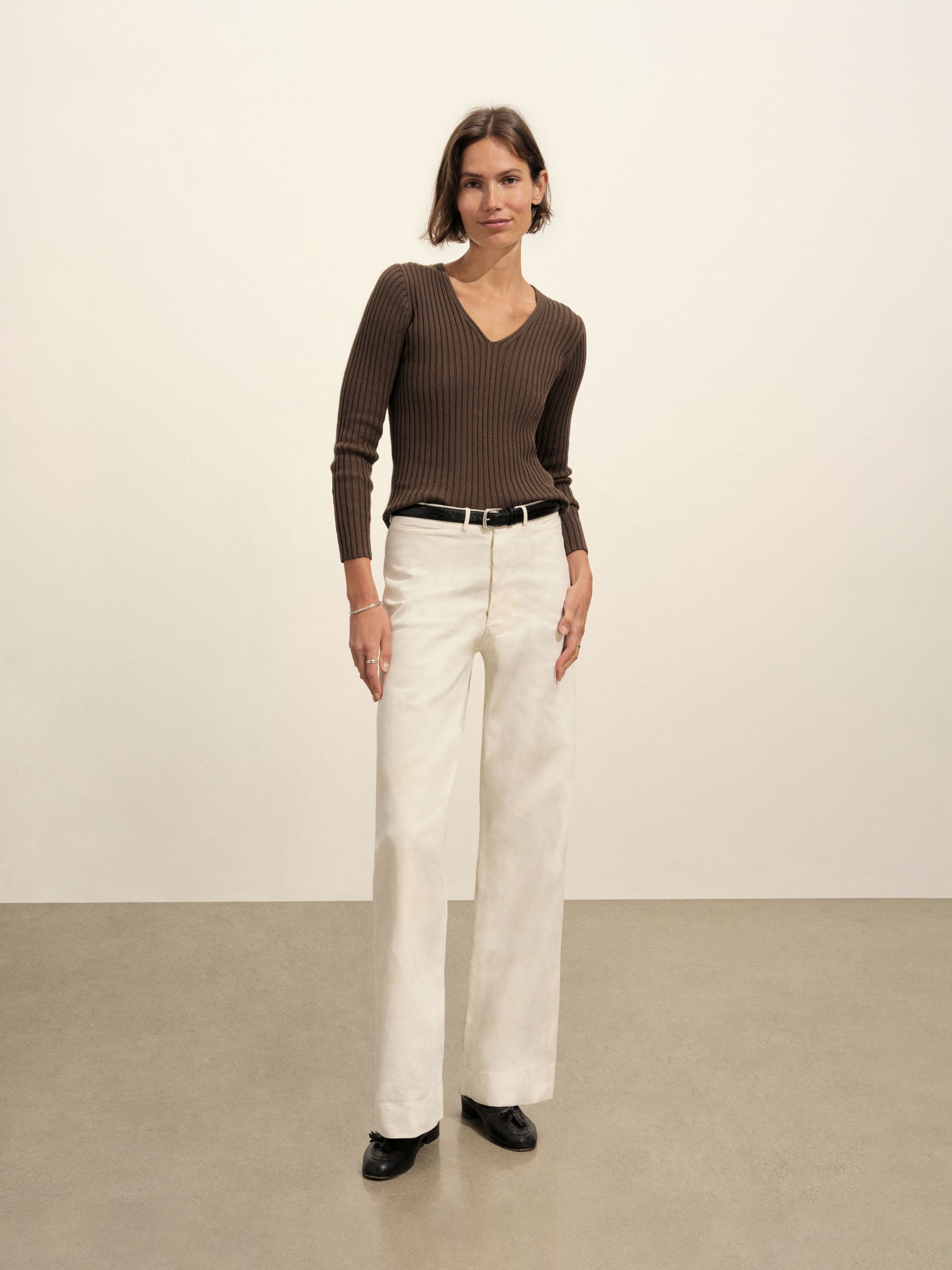 A vintage-inspired V-neck sweater with bracelet-length sleeves, crafted from premium Italian cotton yarn with a 3×3 ribbed structure for added stretch and a snug, flattering fit. Garment-washed for a truly authentic, worn-in feel.
