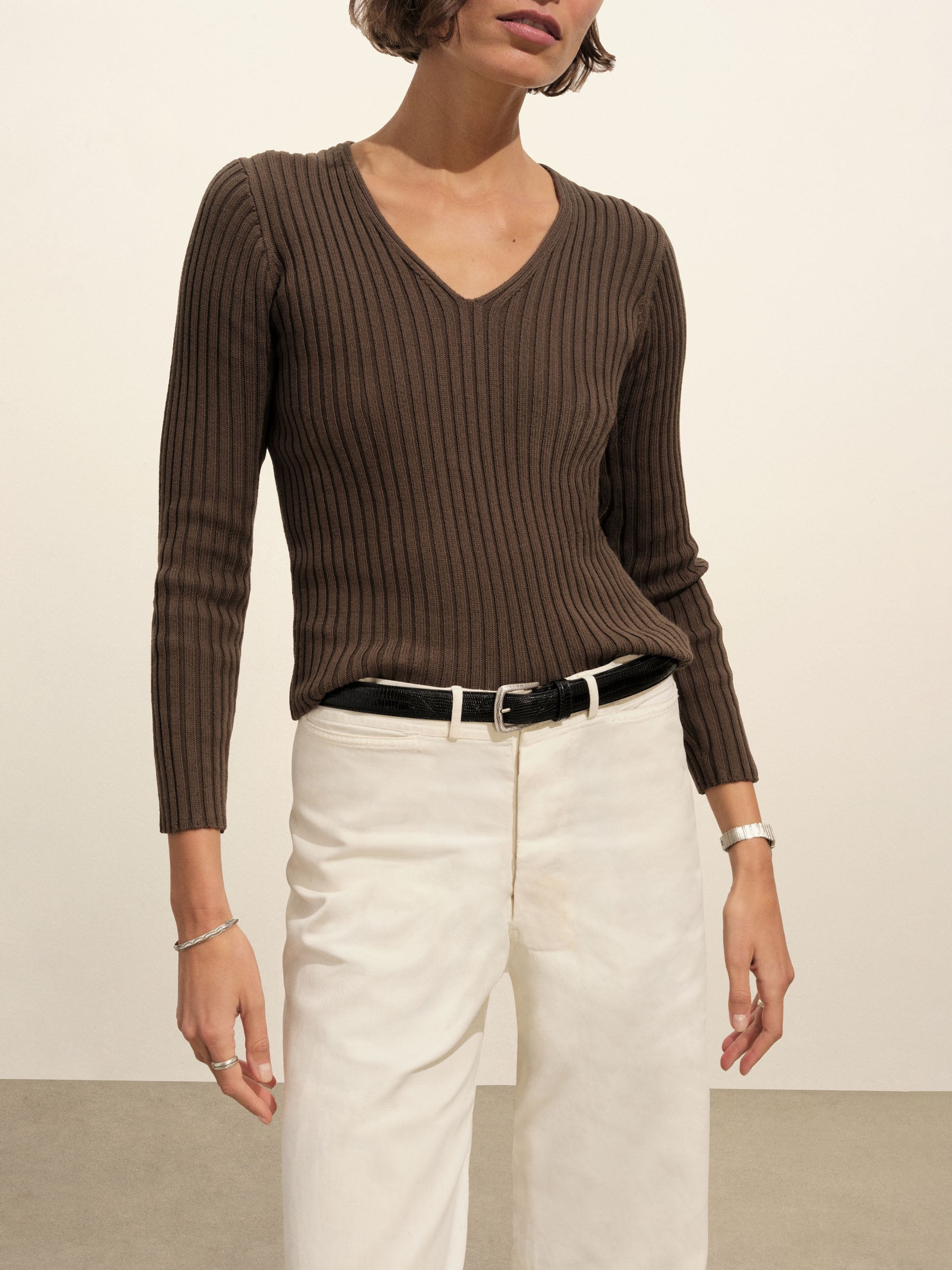 Burnt Chestnut Fluted Rib V-Neck Long Sleeve