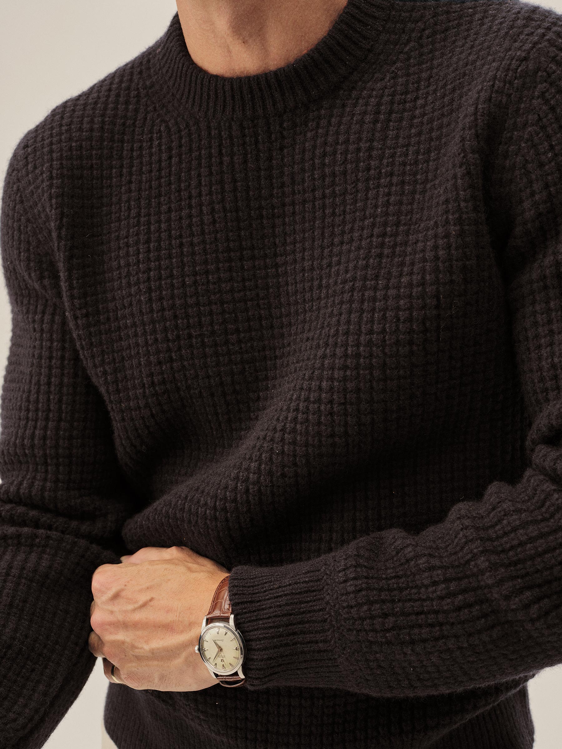 Classic crewneck waffle-knit from 5 gauge wool: a chunky, substantial yarn that’s soft to the touch. 95% Merino wool for warmth and durability, rounded out with 5% cashmere for added smoothness. The result: all the warmth, zero itch. Saddle shoulder for a comfortable fit with rib fashioning on the collar, cuffs, and hems.