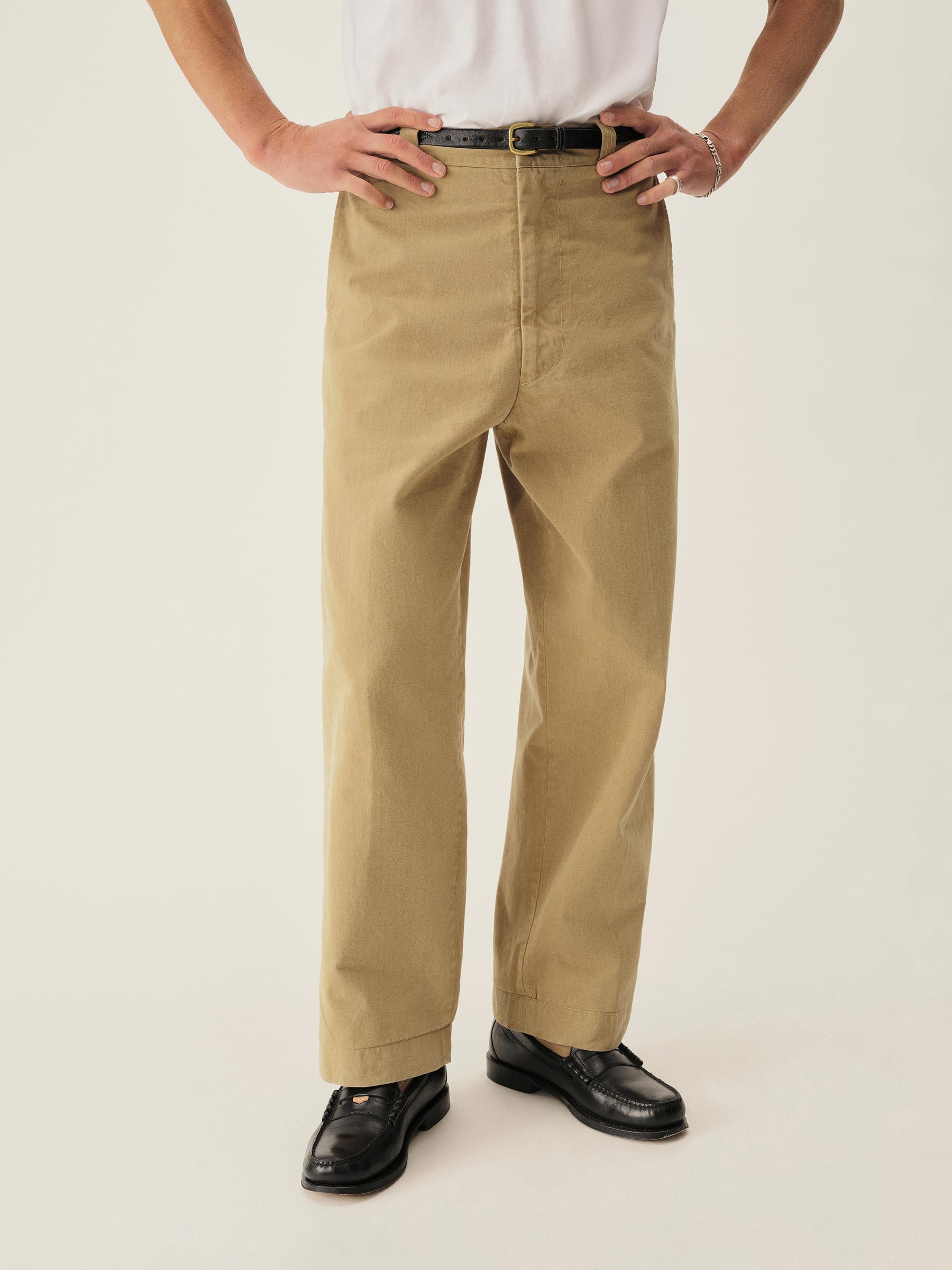 Inspired by 1960s military-issued chinos, an authentic period silhouette with a high rise, full top block, and a full leg. Cut from sulfur-dyed Japanese twill and constructed with busted seaming at the back rise, inseams, and outseams, along with tunnel belt loops and single-welt back pockets. Finished with corozo buttons, a Talon 42 zip, and a zip fly Stonewashed for a lived-in look and feel.