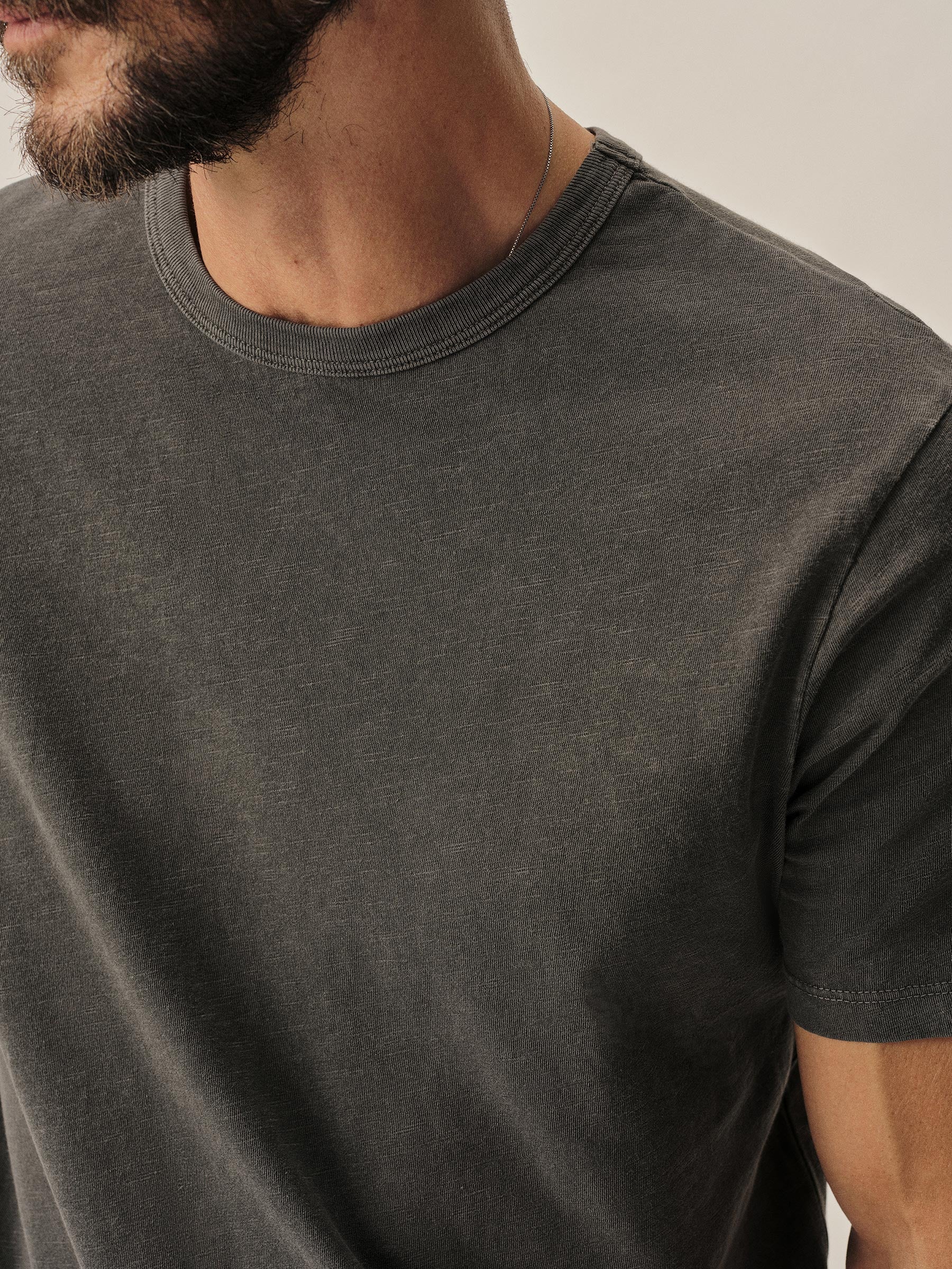 Classic fit short sleeve crewneck tee with our signature curved hem, cut from USA grown 145 GSM cotton with a light slub texture and sewn at BM Knitting Mills in Mohnton, PA. Constructed with self-neck binding and a flat stitch finish for comfort. Garment washed with enzymes and softener for a lived-in feel.