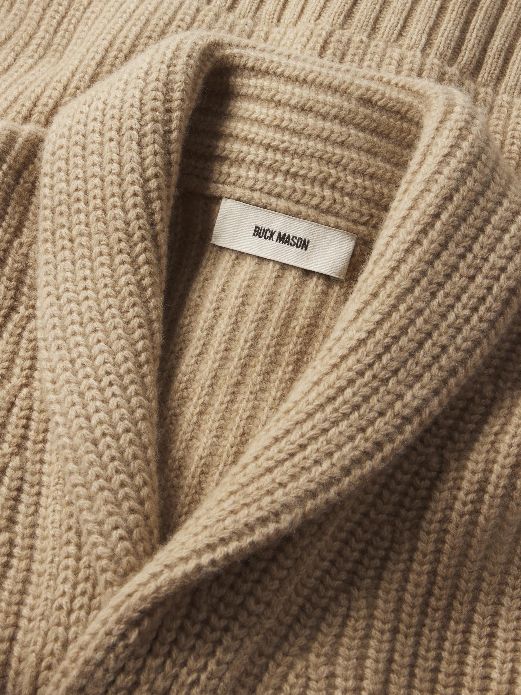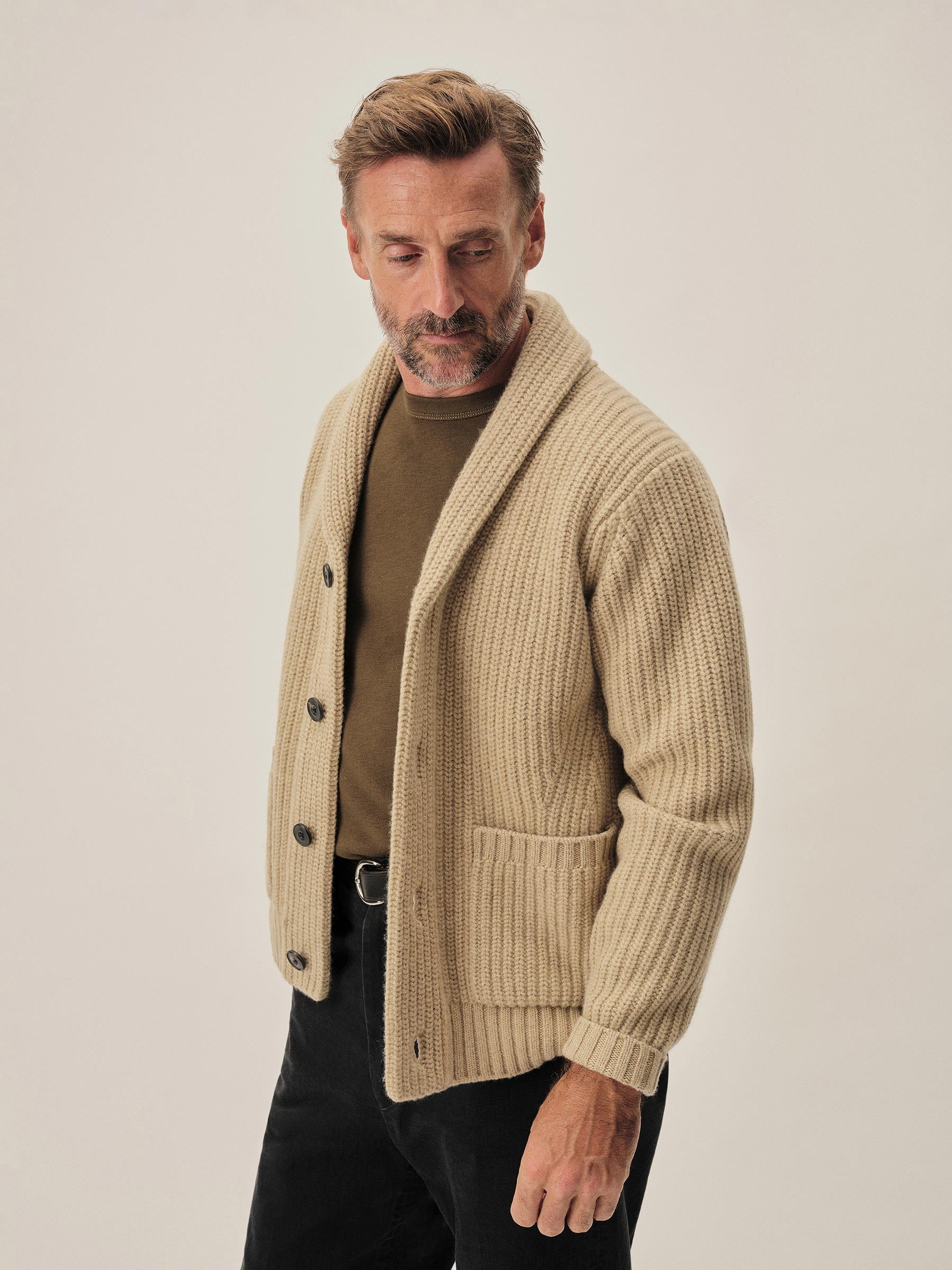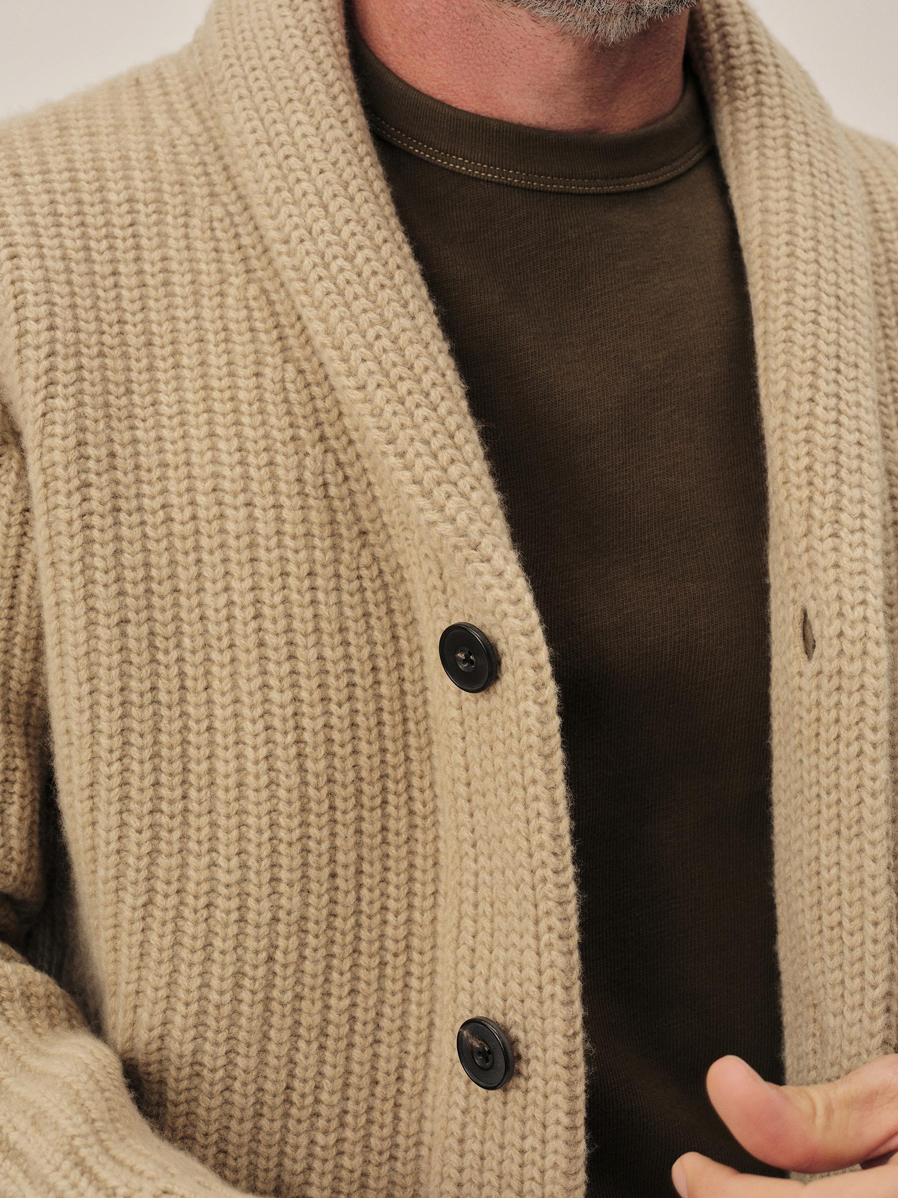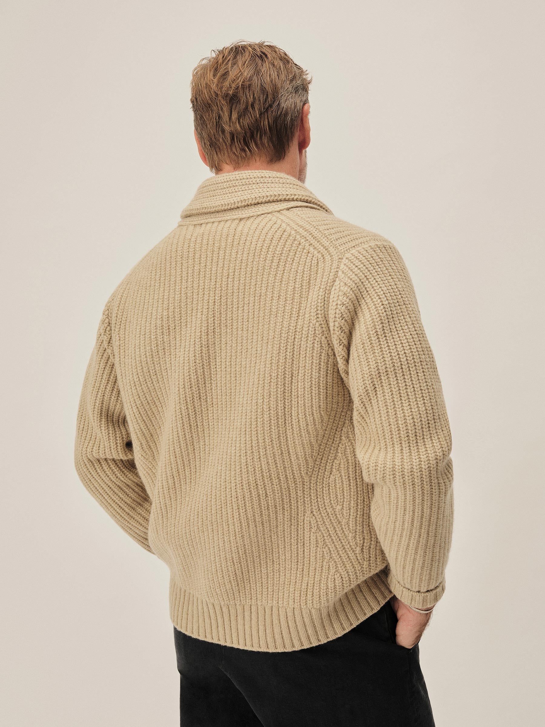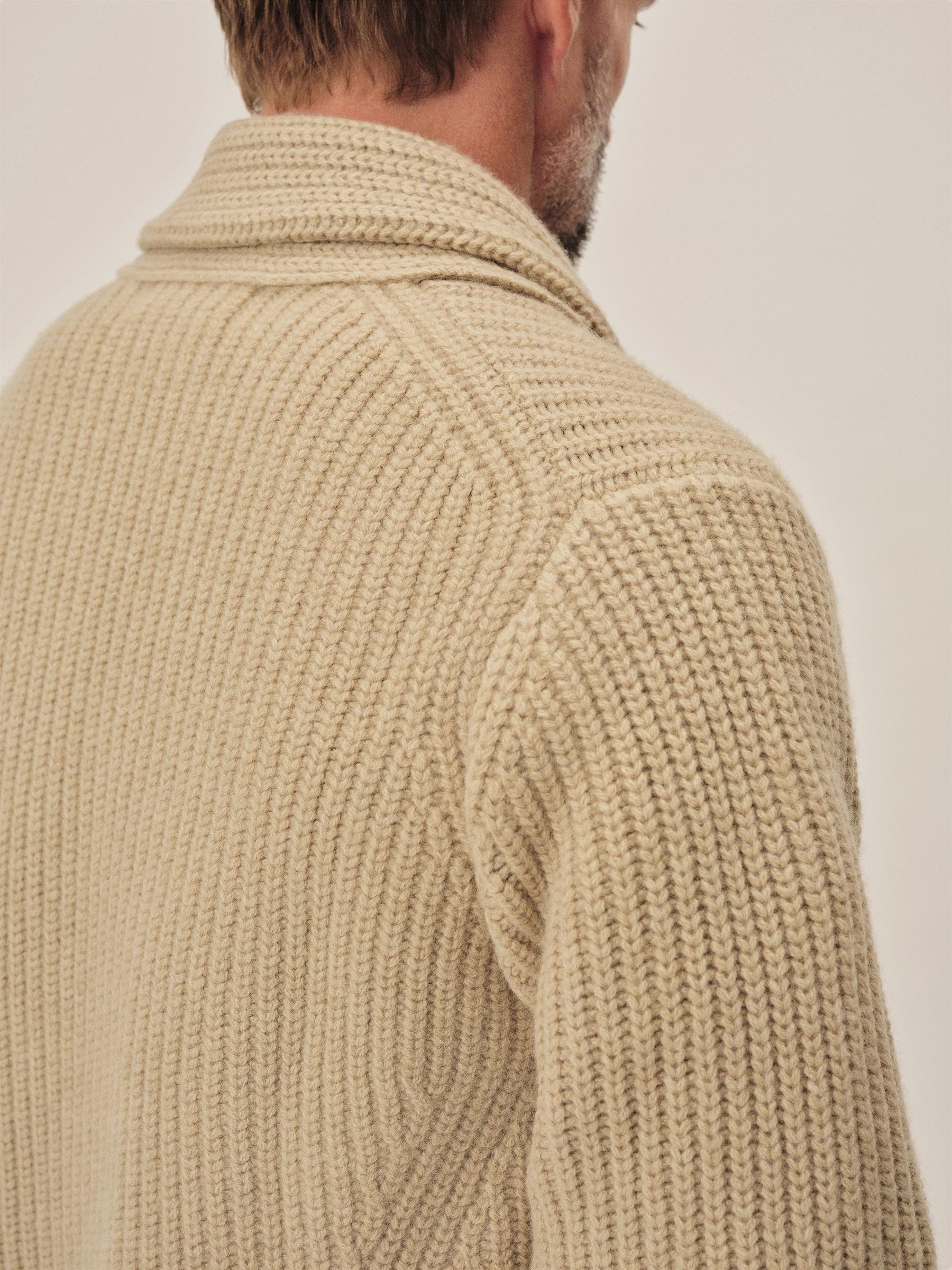 Classic fit shawl cardigan in a three gauge half cardigan rib stitch knit from a yarn-dyed blend of merino wool and cashmere. Details include ribbing at the collar, cuffs, and hem, hip pockets, and branded horn buttons. Constructed with engineered stitch detailing throughout. Garment washed for a lived-in feel.