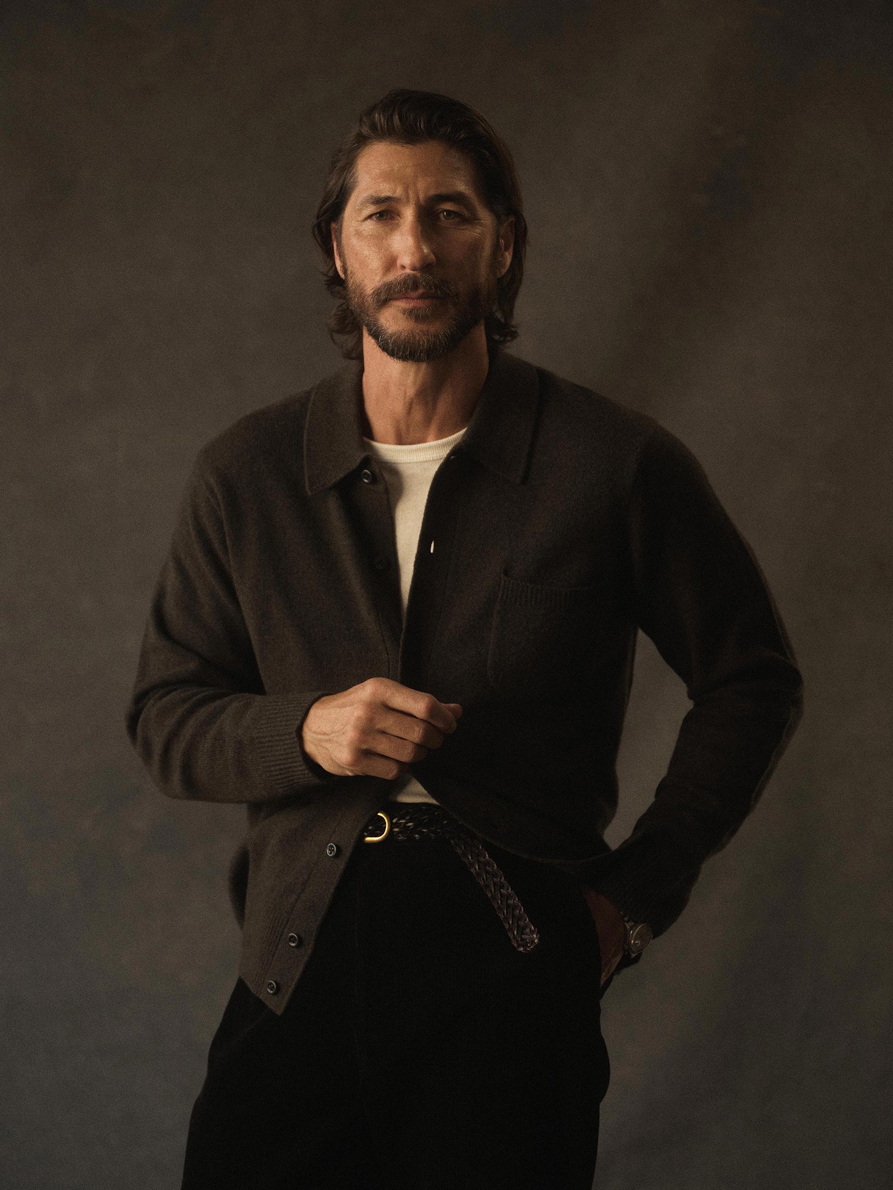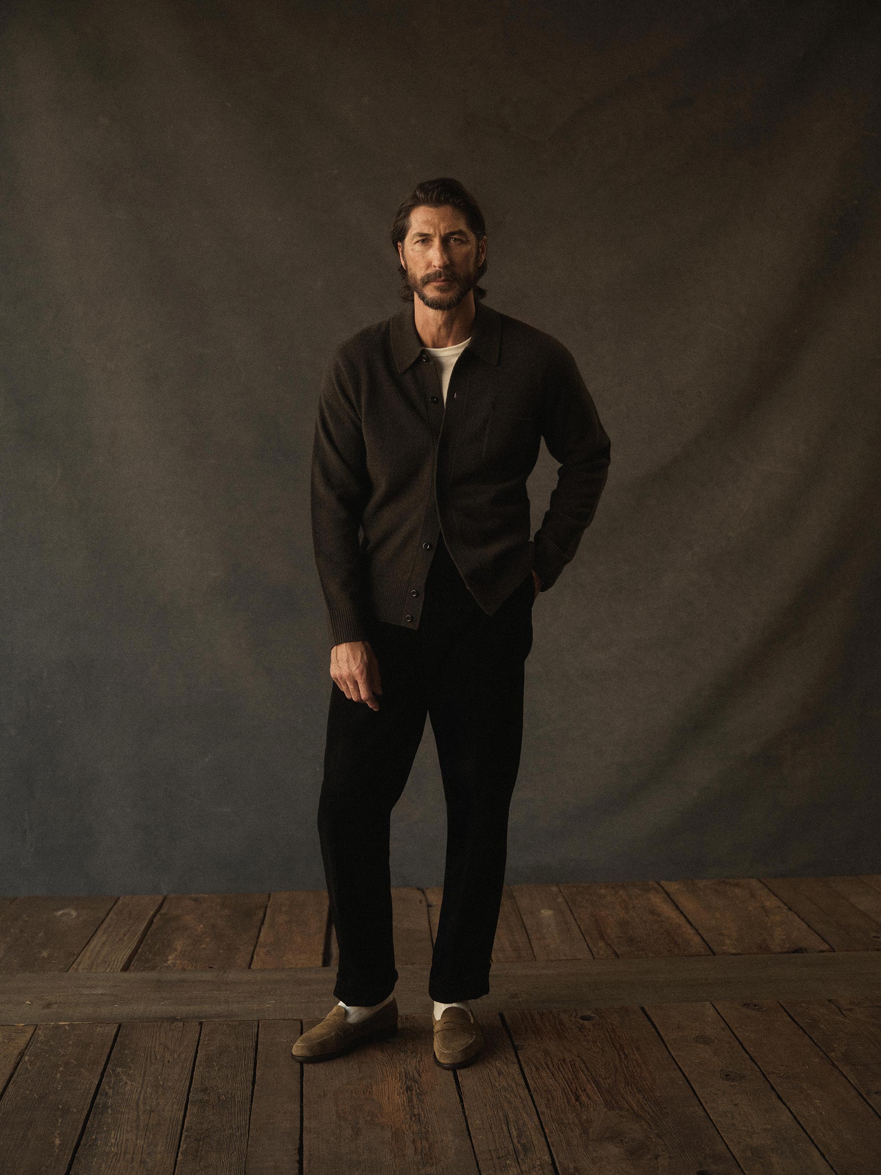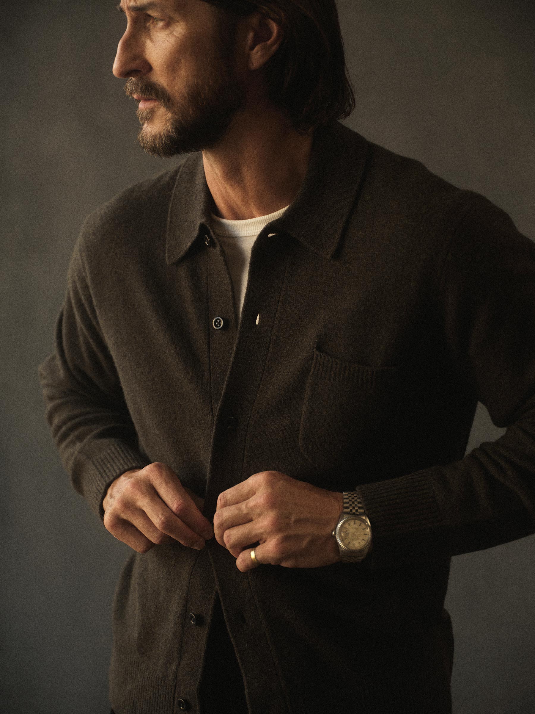 Relaxed fit cardigan that functions as a fully-fashioned jersey-knit overshirt with a ribbed collar, functional sleeve cuffs, and a straight hem. Finished with mother of pearl buttons.
