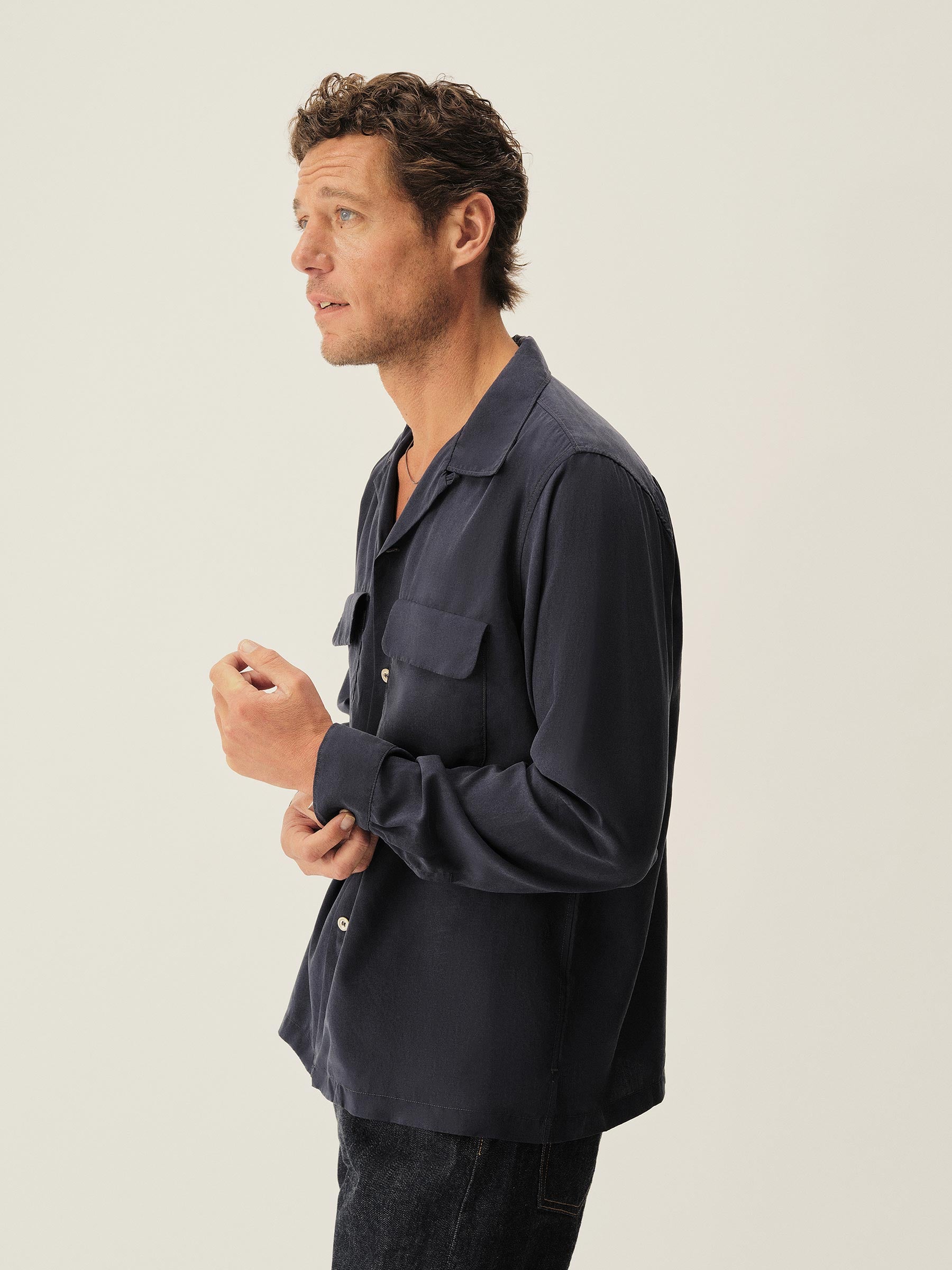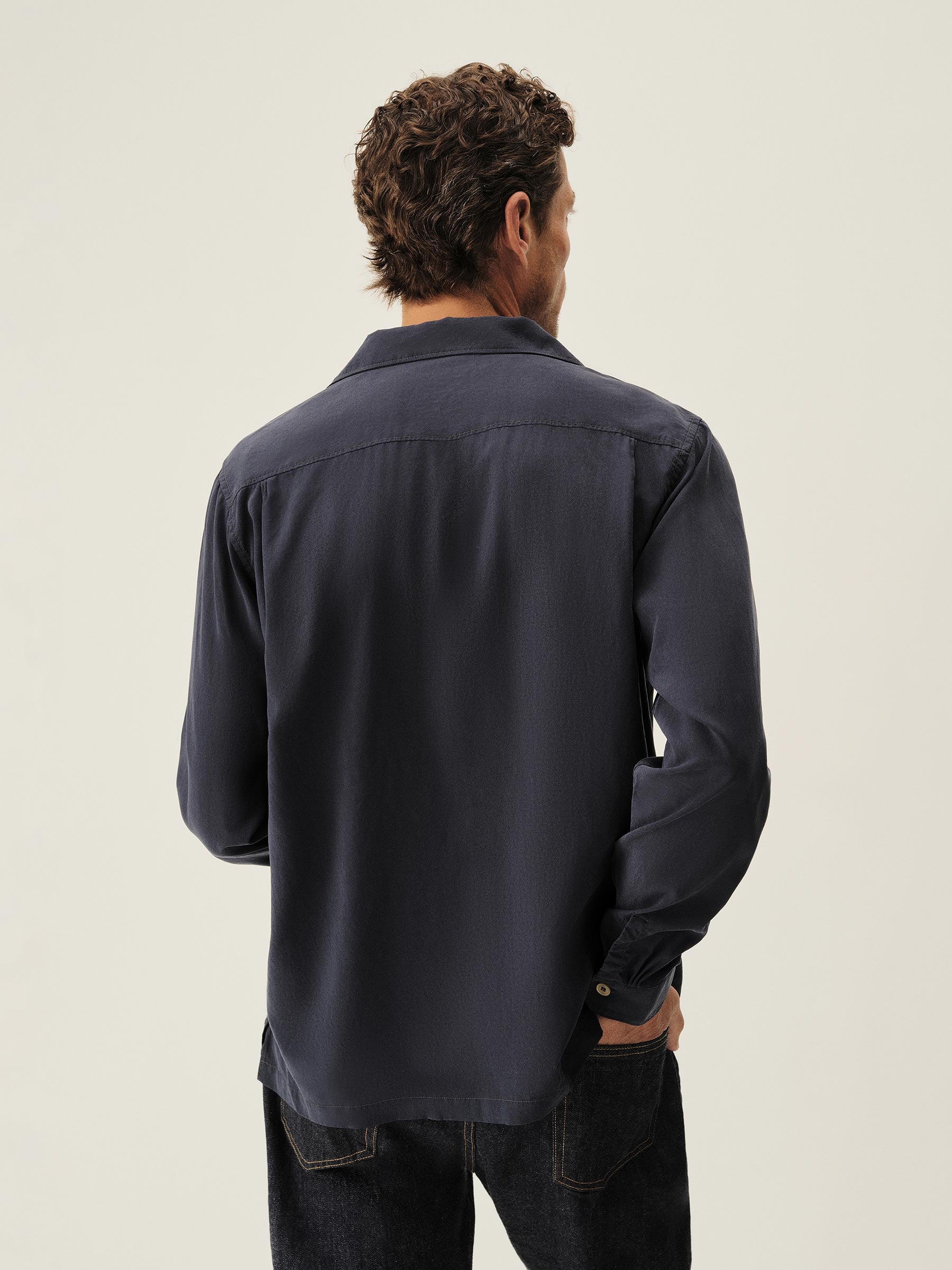 The Casita Camp Shirt channels the casual poise of 1950s and ’60s resort wear. Woven for warmer weather, the ultralight yarn-dyed Tencel brings a smooth, airy drape to cool summer nights. Designed with a period fit, a straight hem, side vents, and authentic details like a collar loop button fastener, patch-and-flap chest pockets, and real troca shell buttons. Finished with single-needle construction, a French placket, and a garment rinse for a soft, lived-in feel.