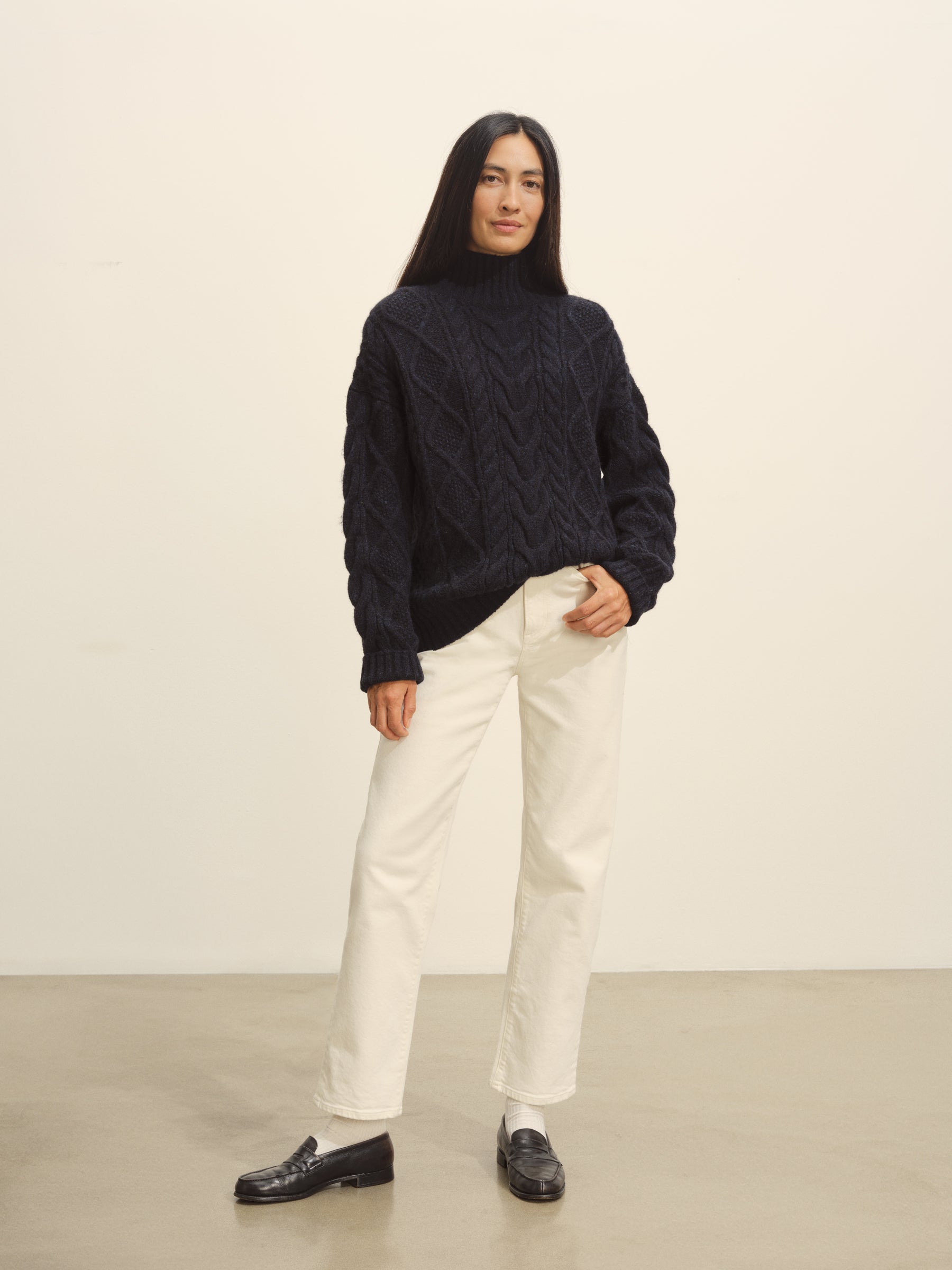 With its lofty 5-gauge cable stitch and cozy ribbed edges, this turtleneck has all the hallmarks of a vintage knit. But it’s the superfine Peruvian alpaca and merino wool blend that elevates it for today, offering incredible softness and midweight warmth. The fit has the perfect amount of ease, draping naturally across the body with a hip-length hem.