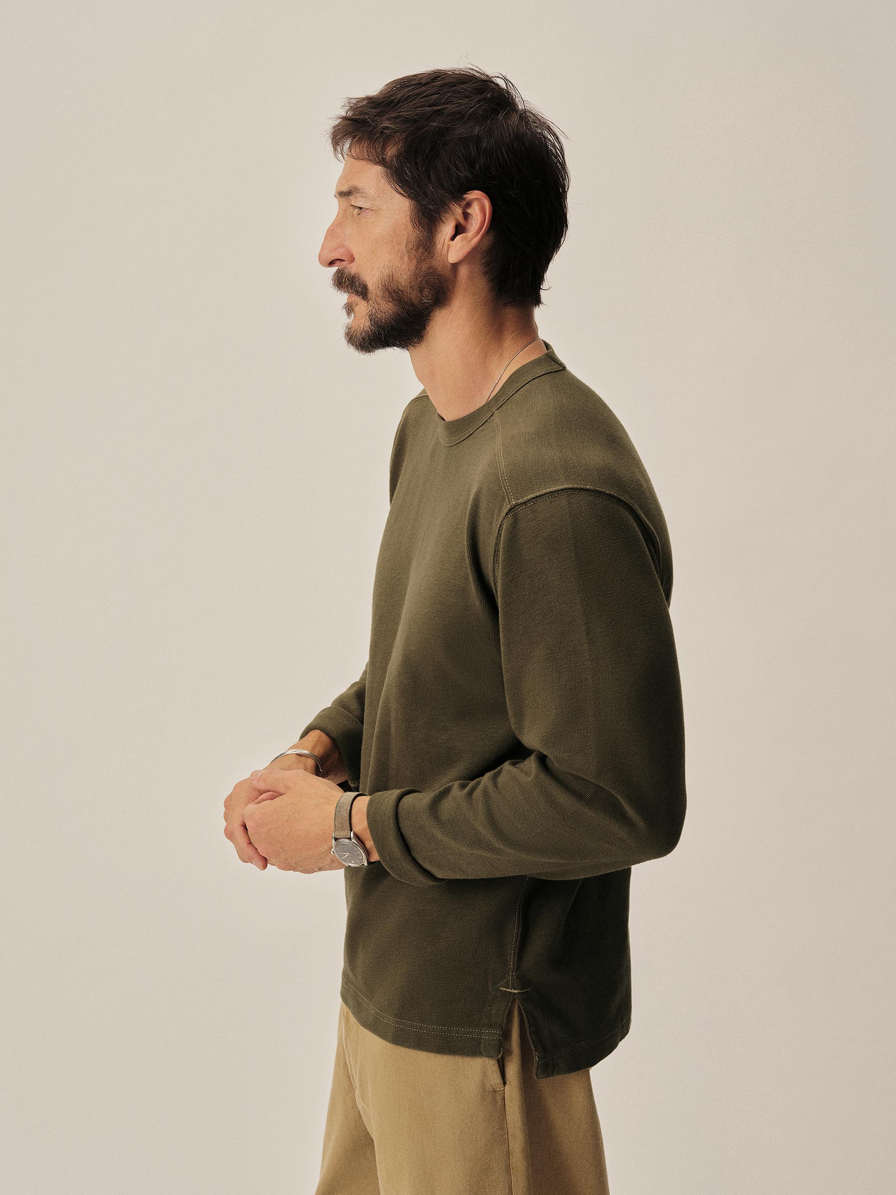 A relaxed, long-sleeved, heavyweight cotton tee modeled after a vintage rugby shirt. The soft cotton jersey is about twice as heavy as our Pima tee, with tiny vertical ribs that gently glide across the skin. This is a solid, substantial stand-alone tee for cold weather.