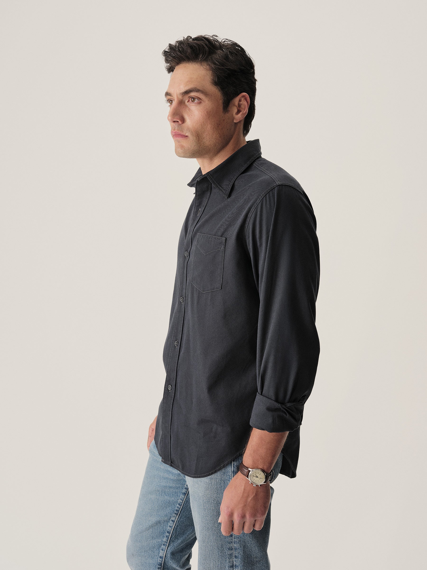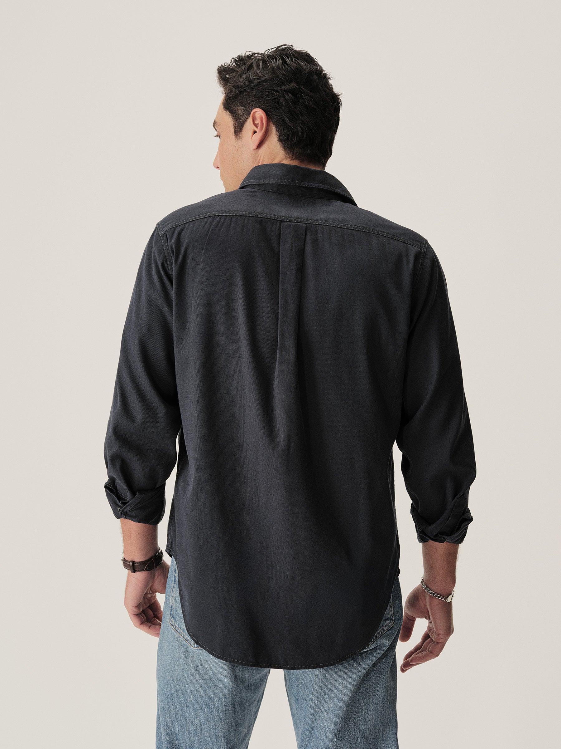 Slim fit long sleeve button up shirt in 5.25 oz. cotton/rayon twill with a subtle luster and an easy drape. Details include mother of pearl buttons, a single spade pocket at the chest, and a box pleat at the back yoke. Constructed with single needle topstitch detailing with double needle stitching at the collar and cuffs. Garment washed with softener for a lived-in feel.