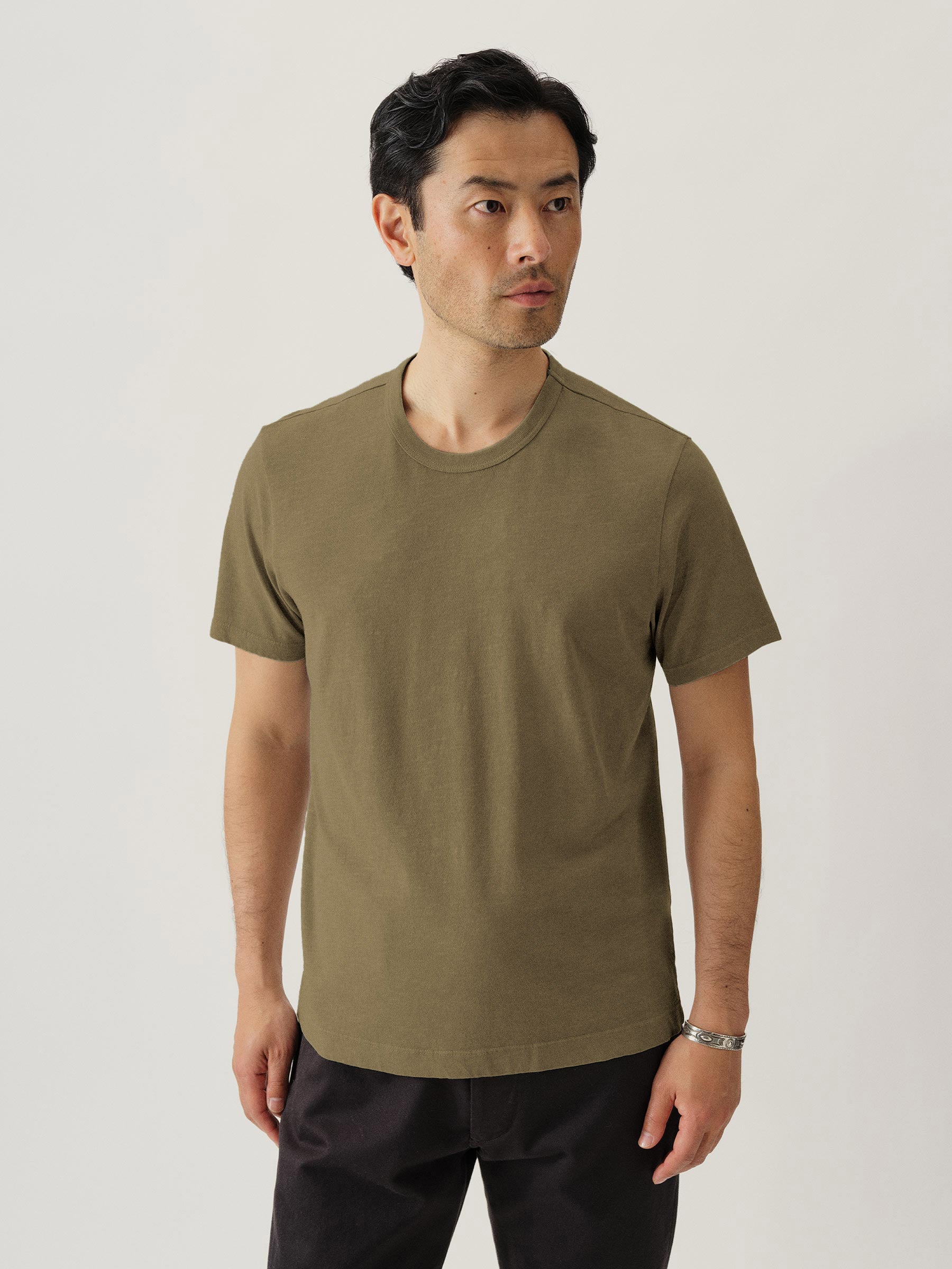 Classic fit short sleeve crewneck tee with our signature curved hem, cut from USA-grown and milled 140 GSM jersey knit from long-staple Supima cotton with a soft, smooth hand and sewn at BM Knitting Mills in Mohnton, PA. Constructed with self-neck binding and a flat stitch finish for comfort. Garment washed with enzymes and softener for a lived-in feel.
