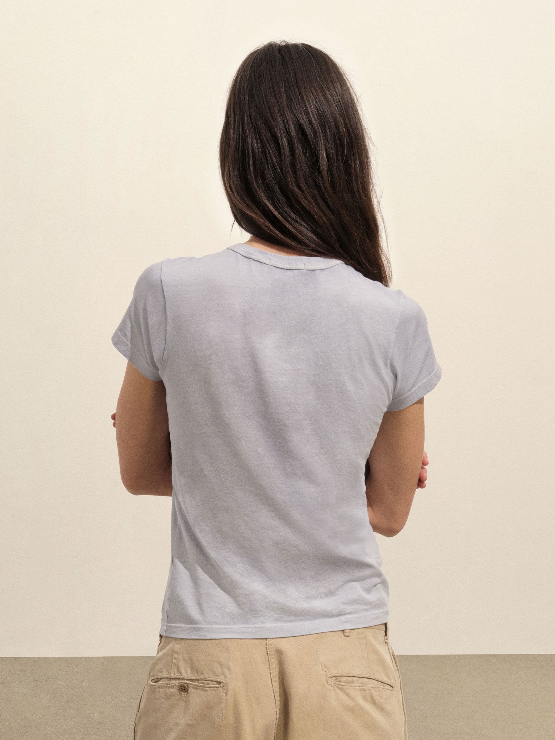 Slim fit short sleeve crewneck tee with a straight hem in 120 GSM jersey, knit from long-staple Supima cotton. Constructed with a durable rib stitch collar and double-needle cover stitch hem. Garment washed with softener for a lived-in feel.
