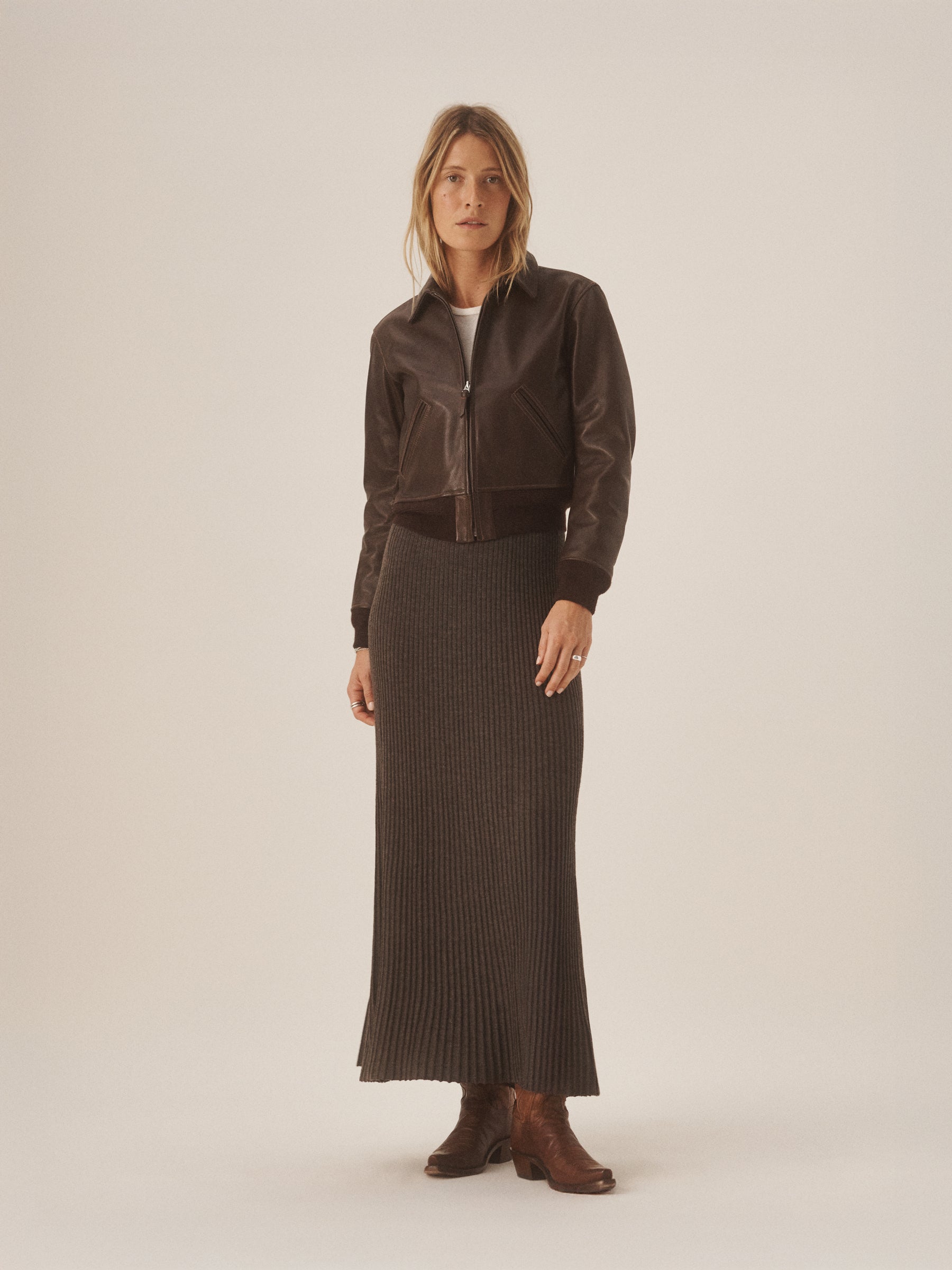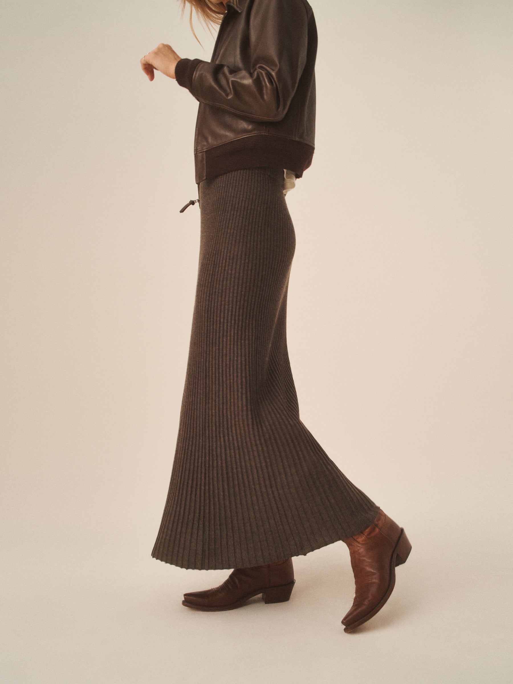 A mid-rise, ankle-length skirt with a flattering fit-and-flare silhouette, built from warm wool yarn with a soft touch and slight sheen. Designed with a variegated rib layout for visual texture and finished with a comfortable elasticated waistband.