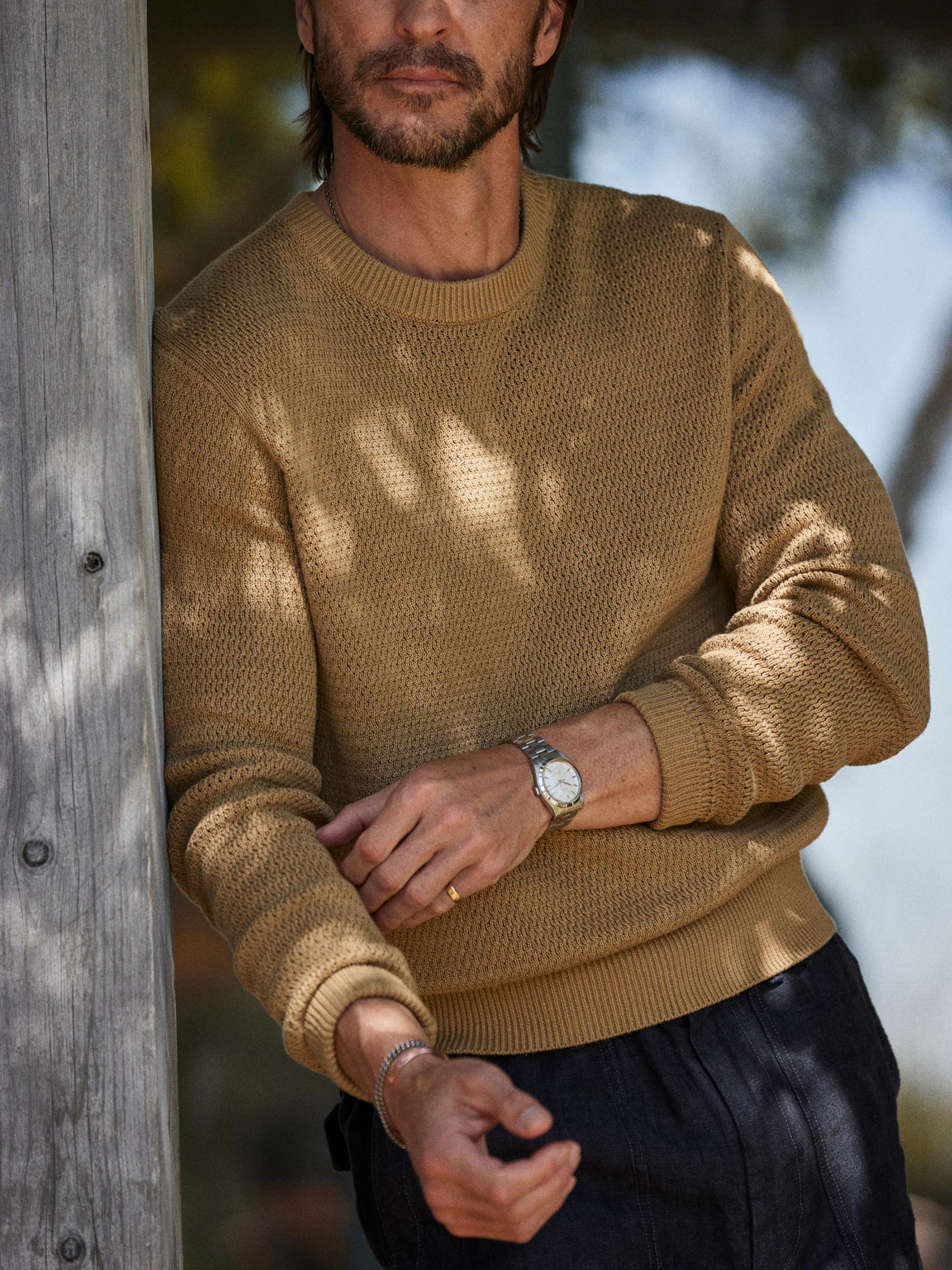 Inspired by WWII-era cut-and-sew thermals, this lightweight crew is knit from 100% slub cotton in a thermal stitch for breathable texture and vintage character. It’s finished with ribbing at the neck, cuffs, and hem, and yarn-dyed and garment-rinsed for a soft hand and broken-in feel.