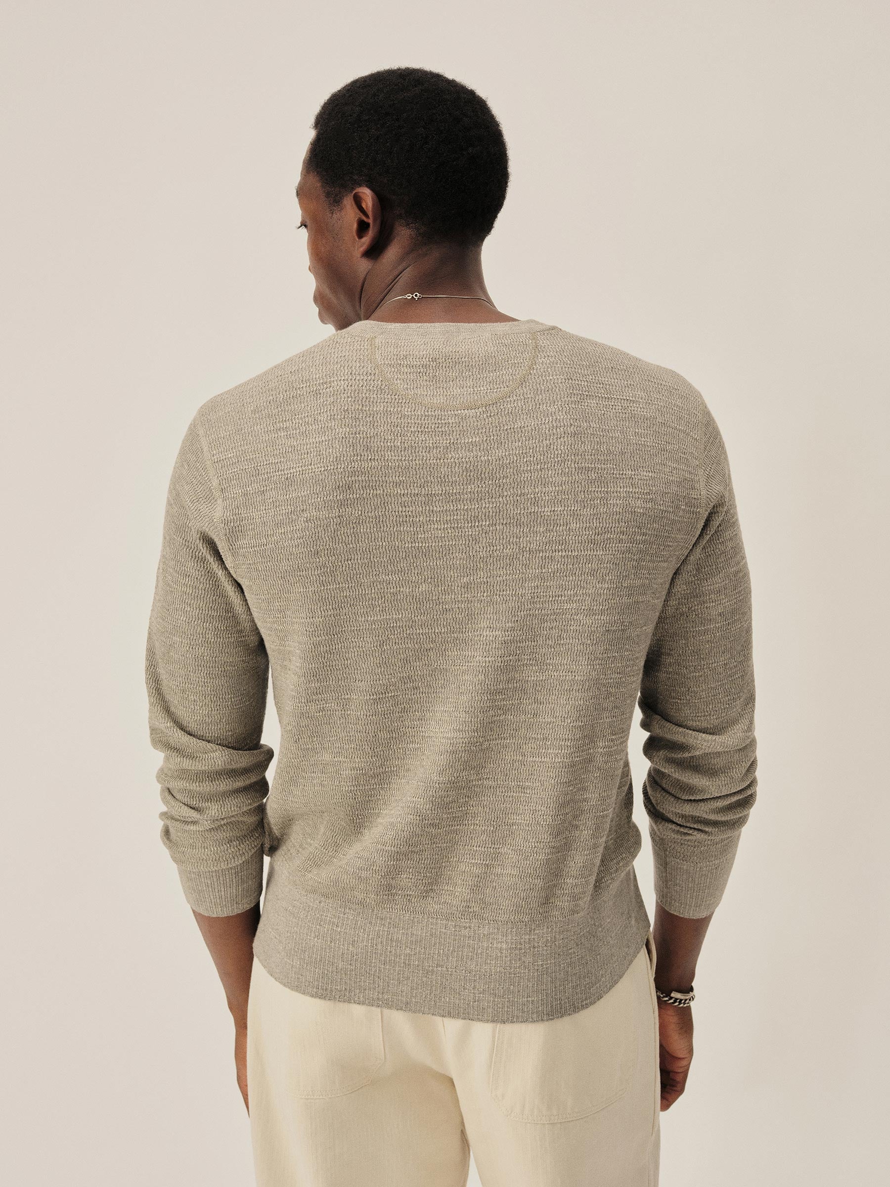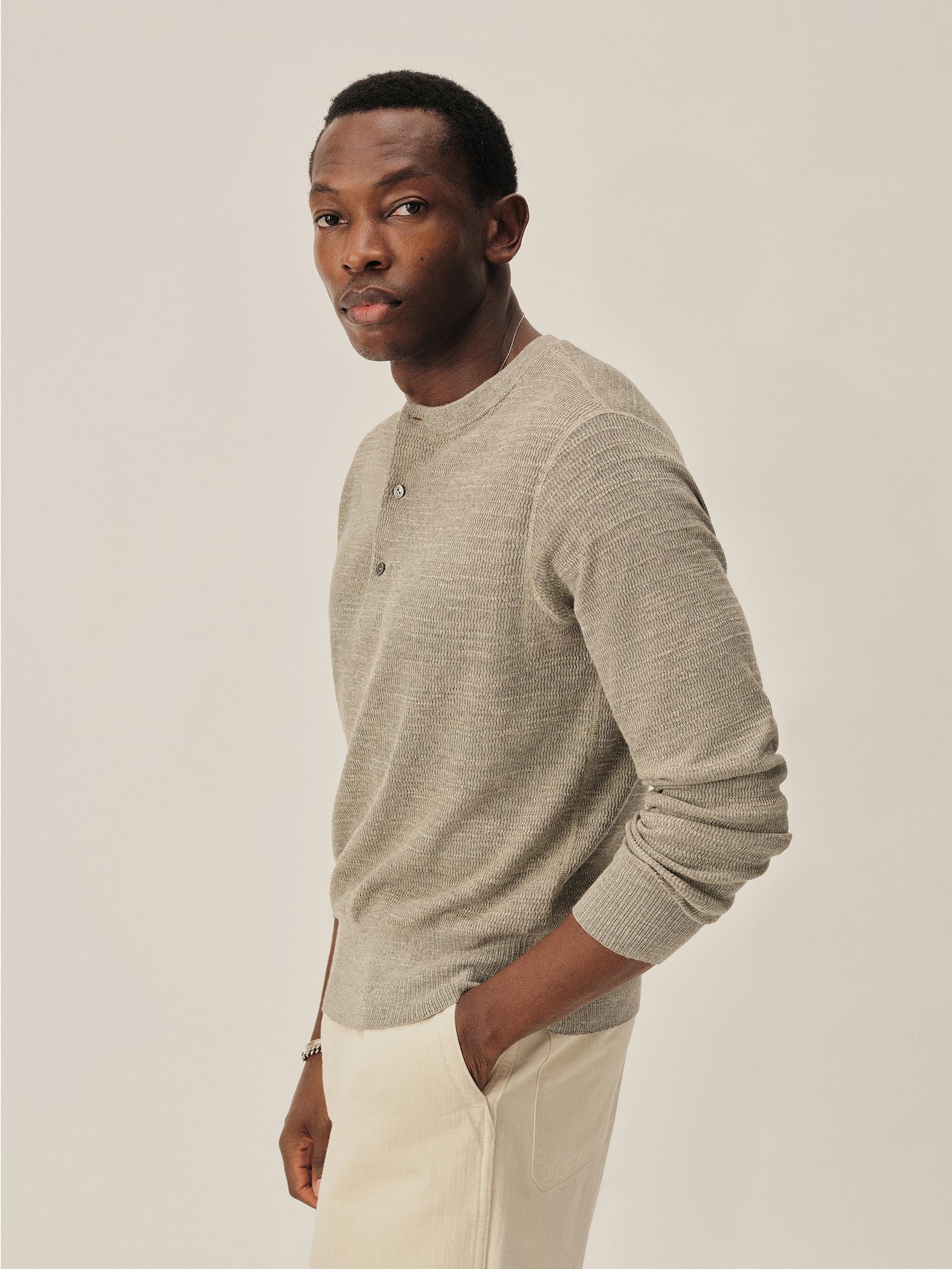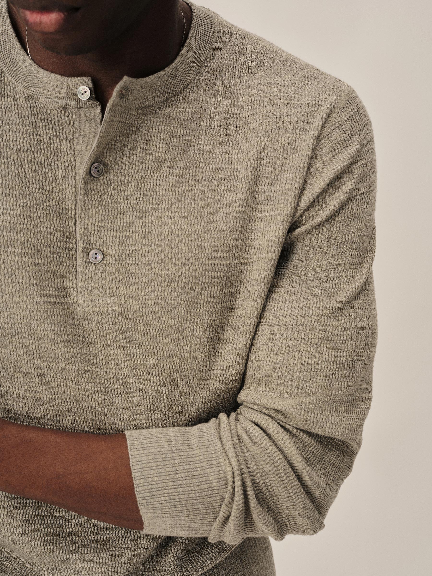 A standard fit, vintage-inspired thermal stitch henley crafted from slubby, yarn-dyed cotton. Featuring variegated rib finishes at the cuffs and bottom hem, and coverstitching along the seams. Finished with a three button shell closure.