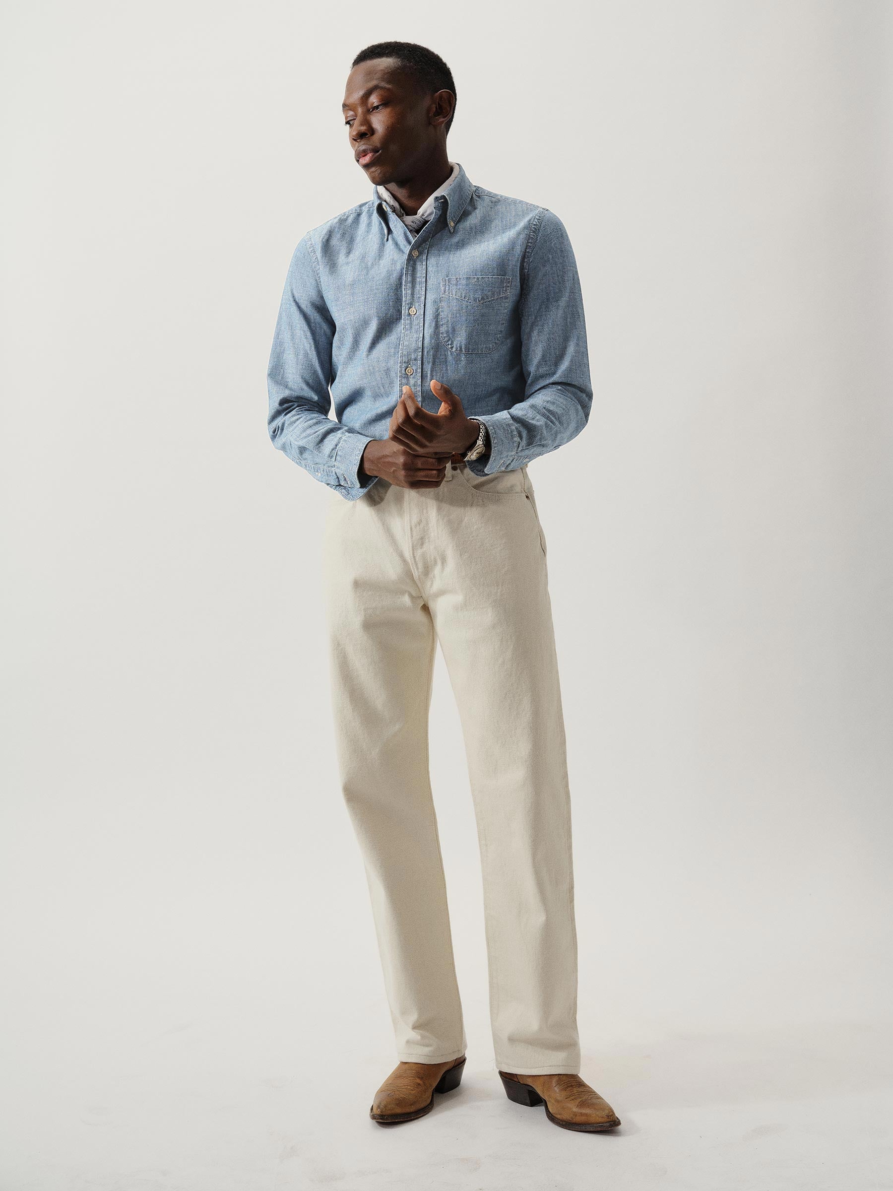 Classic fit button down collar shirt cut from 5 oz indigo yarn-dyed chambray. Details include mother of pearl buttons, a single scallop pocket, and a box pleat at the back. Constructed with clean finished seams. Garment washed for a lived-in look and feel.