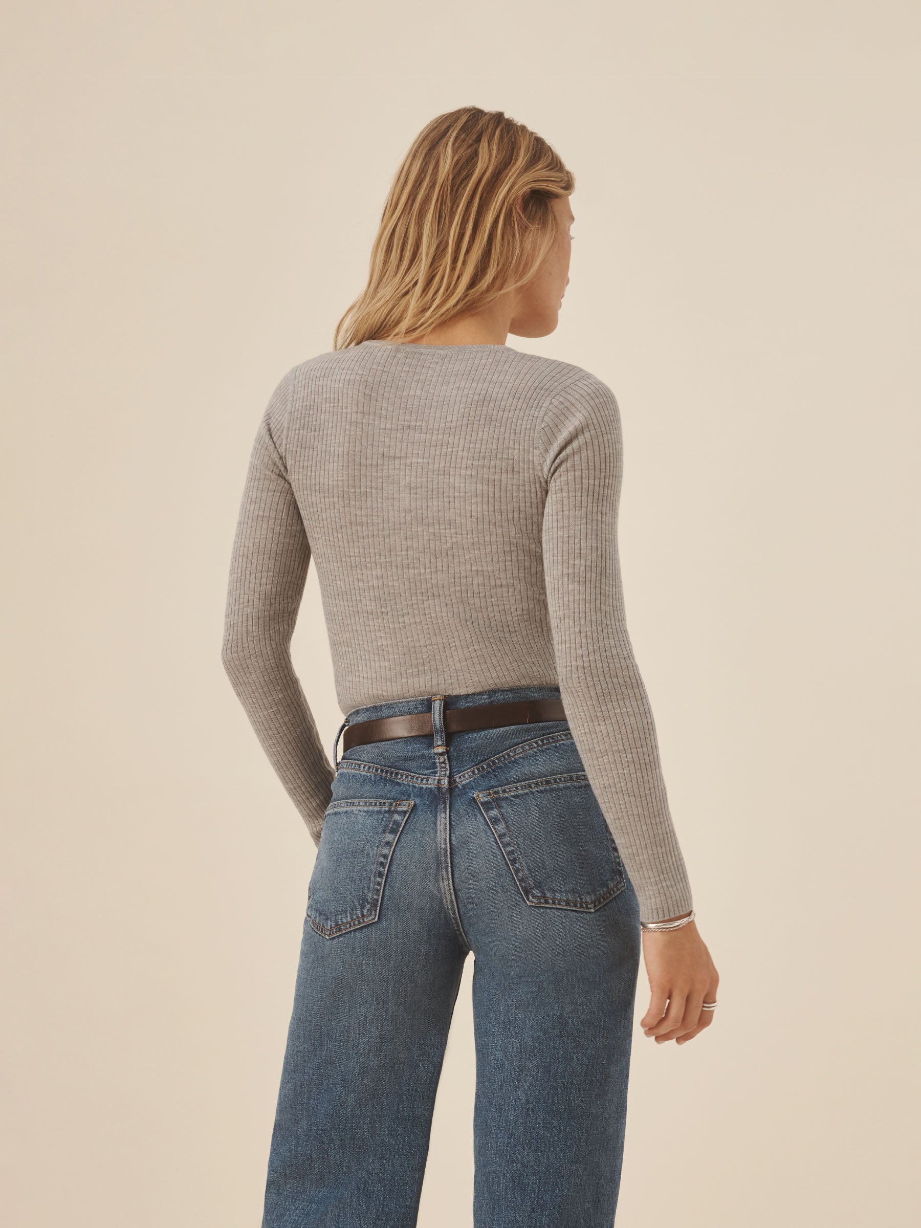A slim and fitted top made for layering, knit from an ultra-soft blend of extrafine merino wool, silk, and cashmere. Designed with an open neckline and functional center front placket with genuine shell buttons. Finished in a classic 4×2 rib stitch with natural stretch and a lightweight hand.