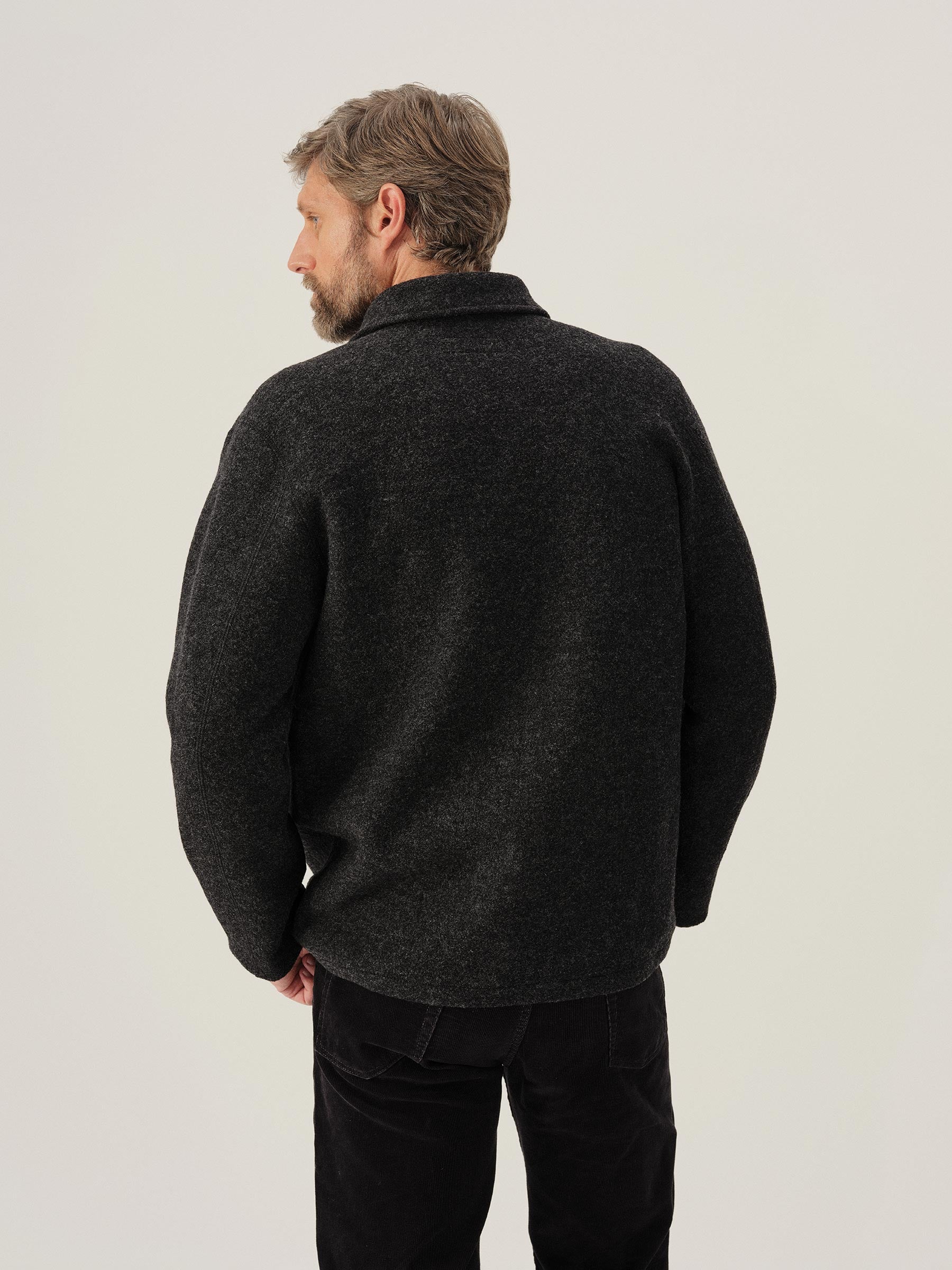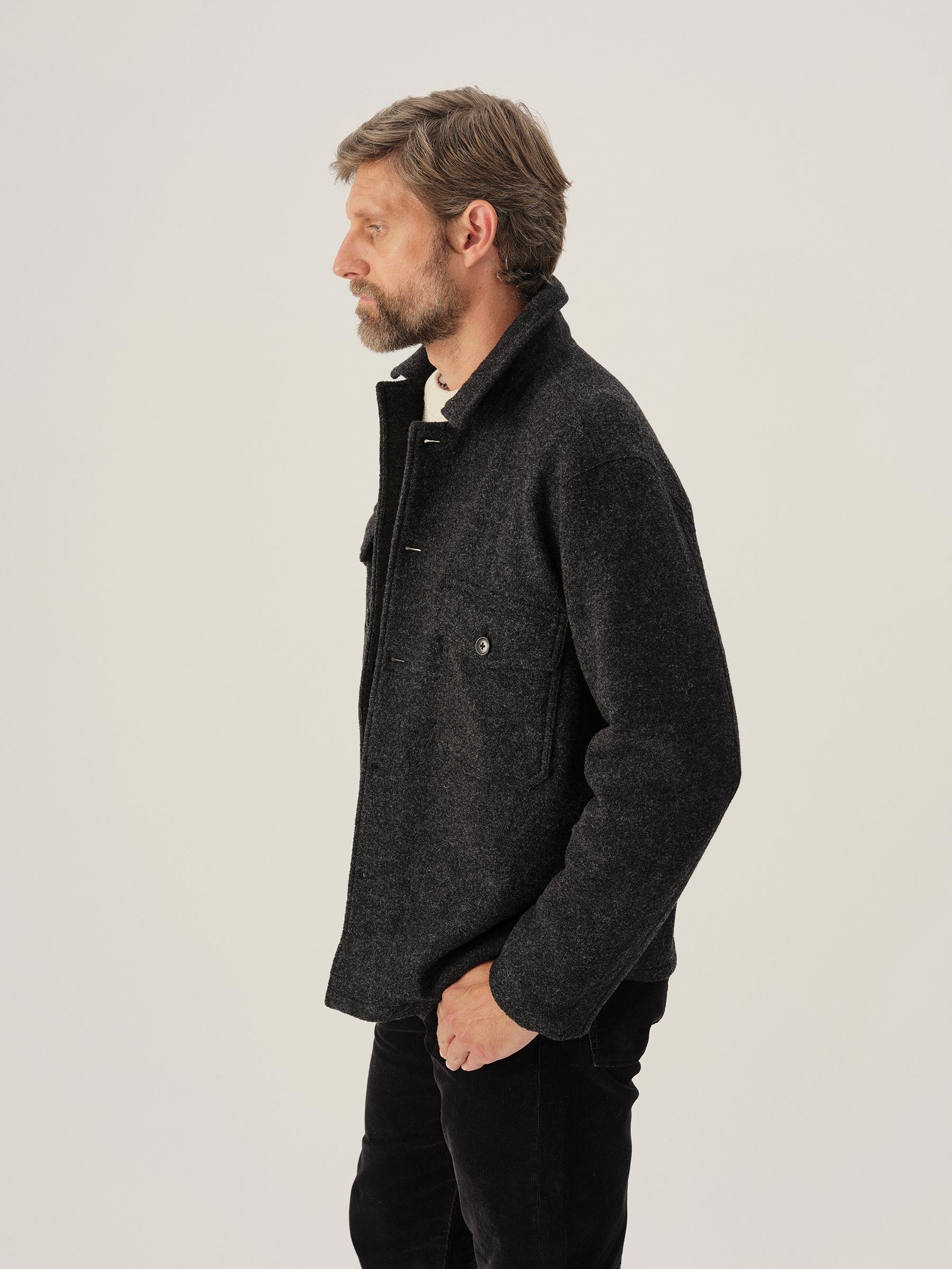 Classic fit field shirt in 340 GSM felted merino wool, twice boiled for improved insulation and durability. Details include patch-and-flap chest pockets and a button front closure. Constructed with hand-sewn facings and cover-stitching with flat seams for comfort.