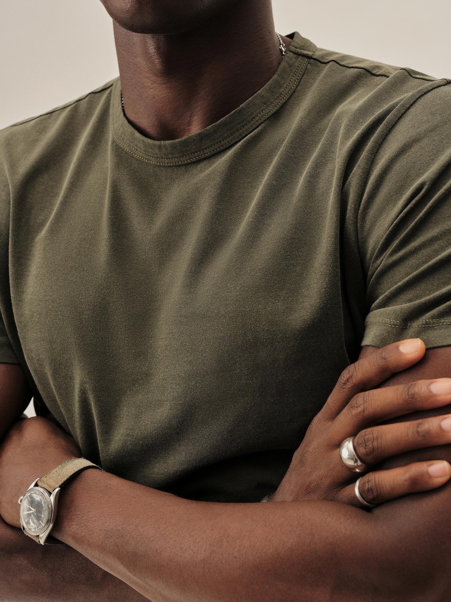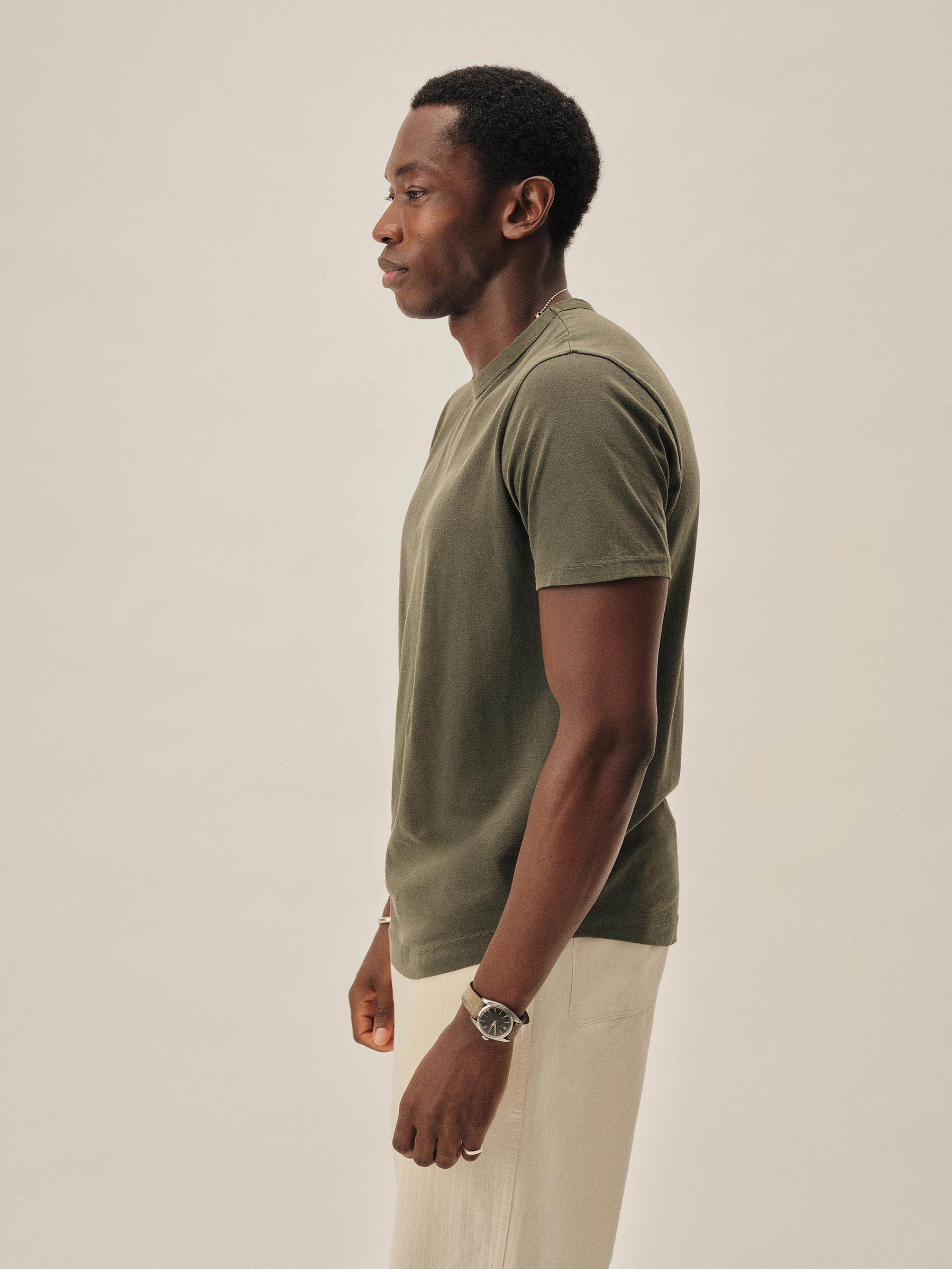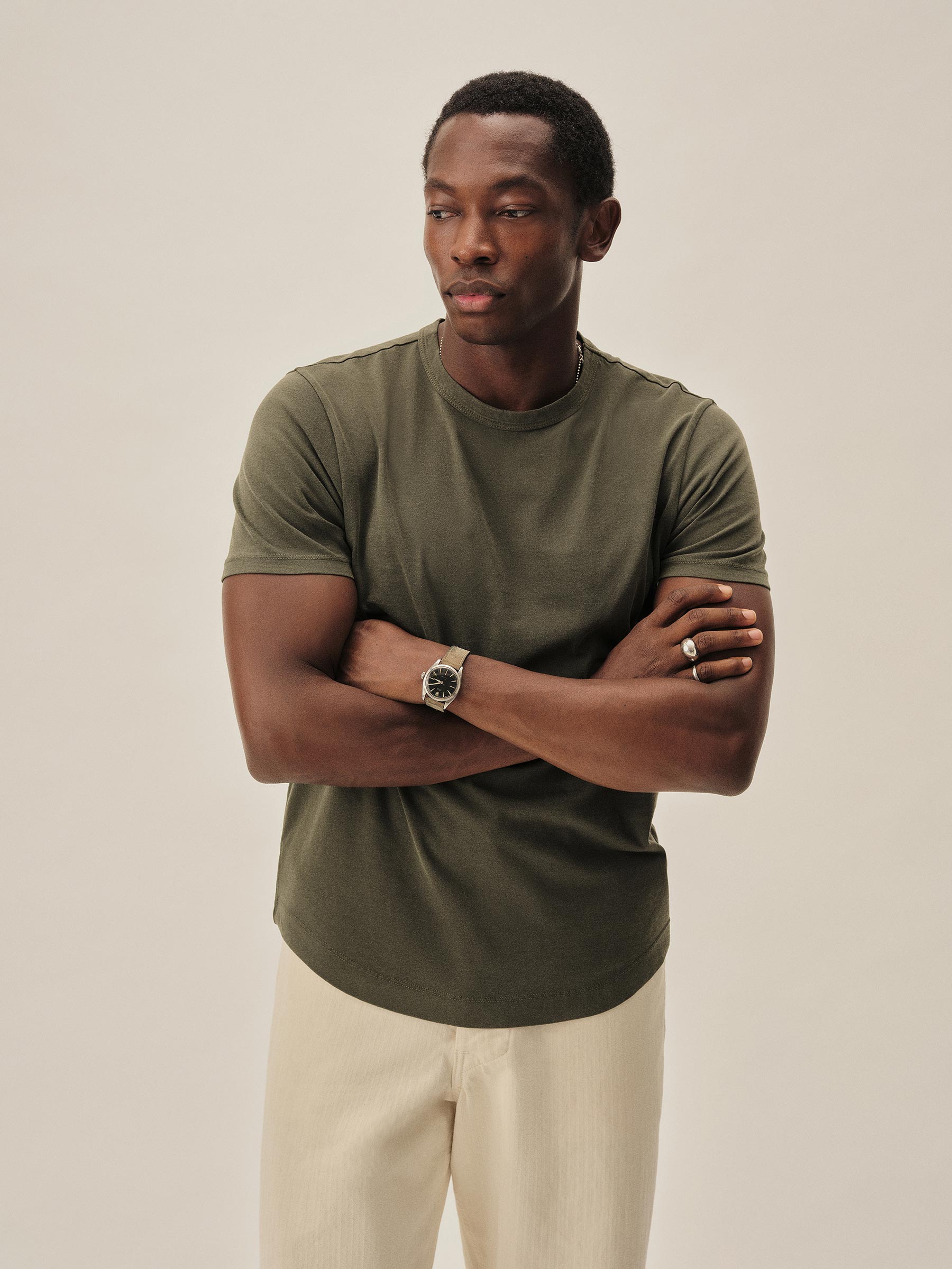 Classic fit short sleeve crewneck tee with our signature curved hem, cut from USA-grown and milled 140 GSM jersey knit from long-staple Supima cotton with a soft, smooth hand and sewn at BM Knitting Mills in Mohnton, PA. Constructed with self-neck binding and a flat stitch finish for comfort. Garment washed with enzymes and softener for a lived-in feel.