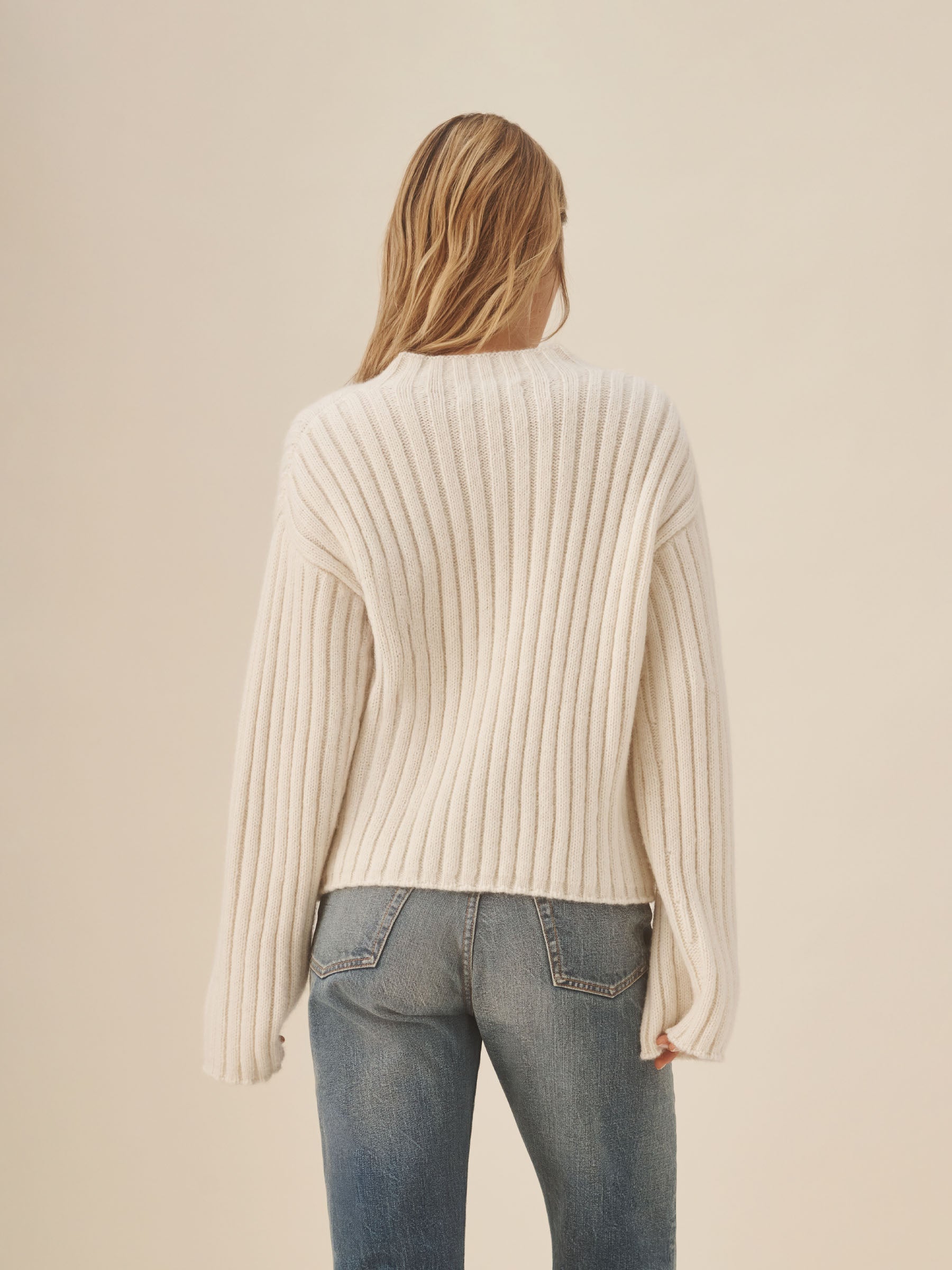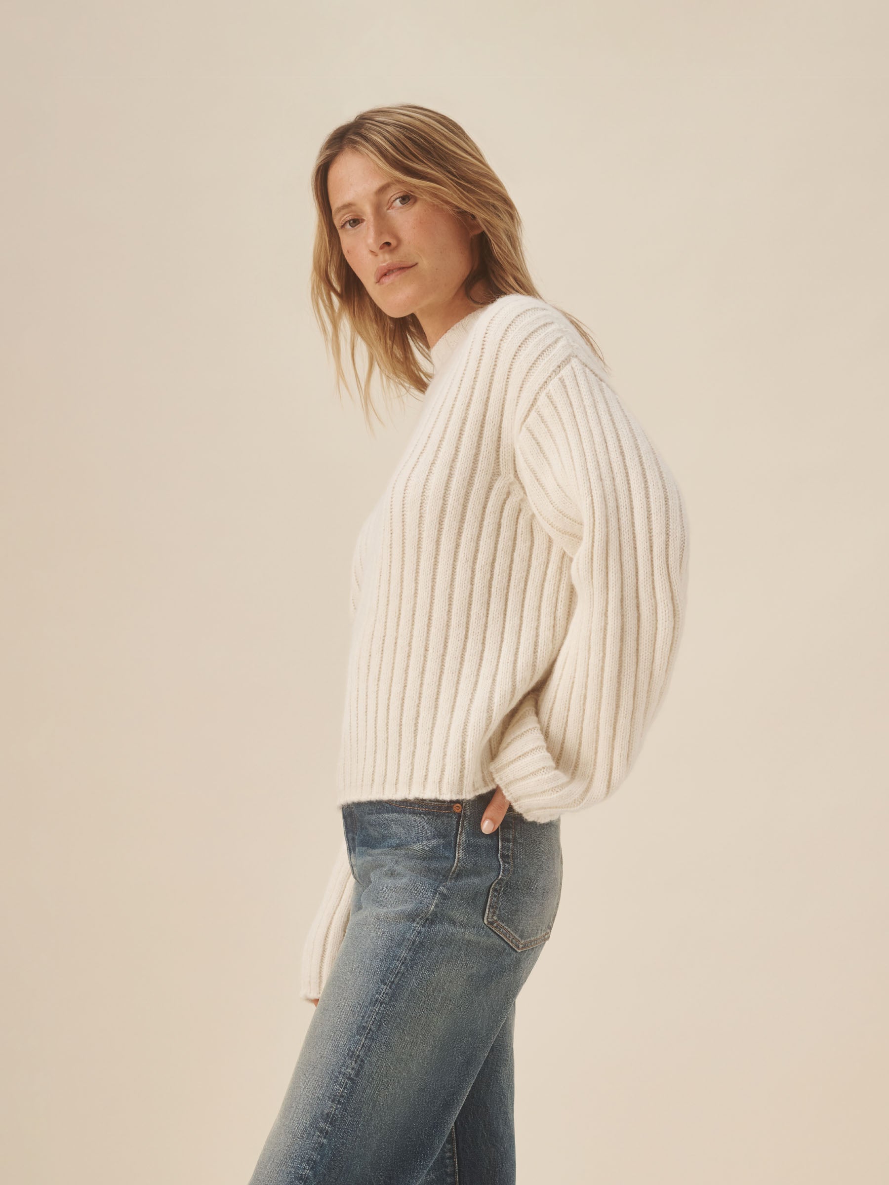 A cozy knit inspired by vintage fisherman sweaters, built with wide rib stitch and shifting rib textures along the armholes and neckline. Crafted from soft, warm alpaca yarn, it’s cut oversized through the body with a relaxed mock neck for easy layering.