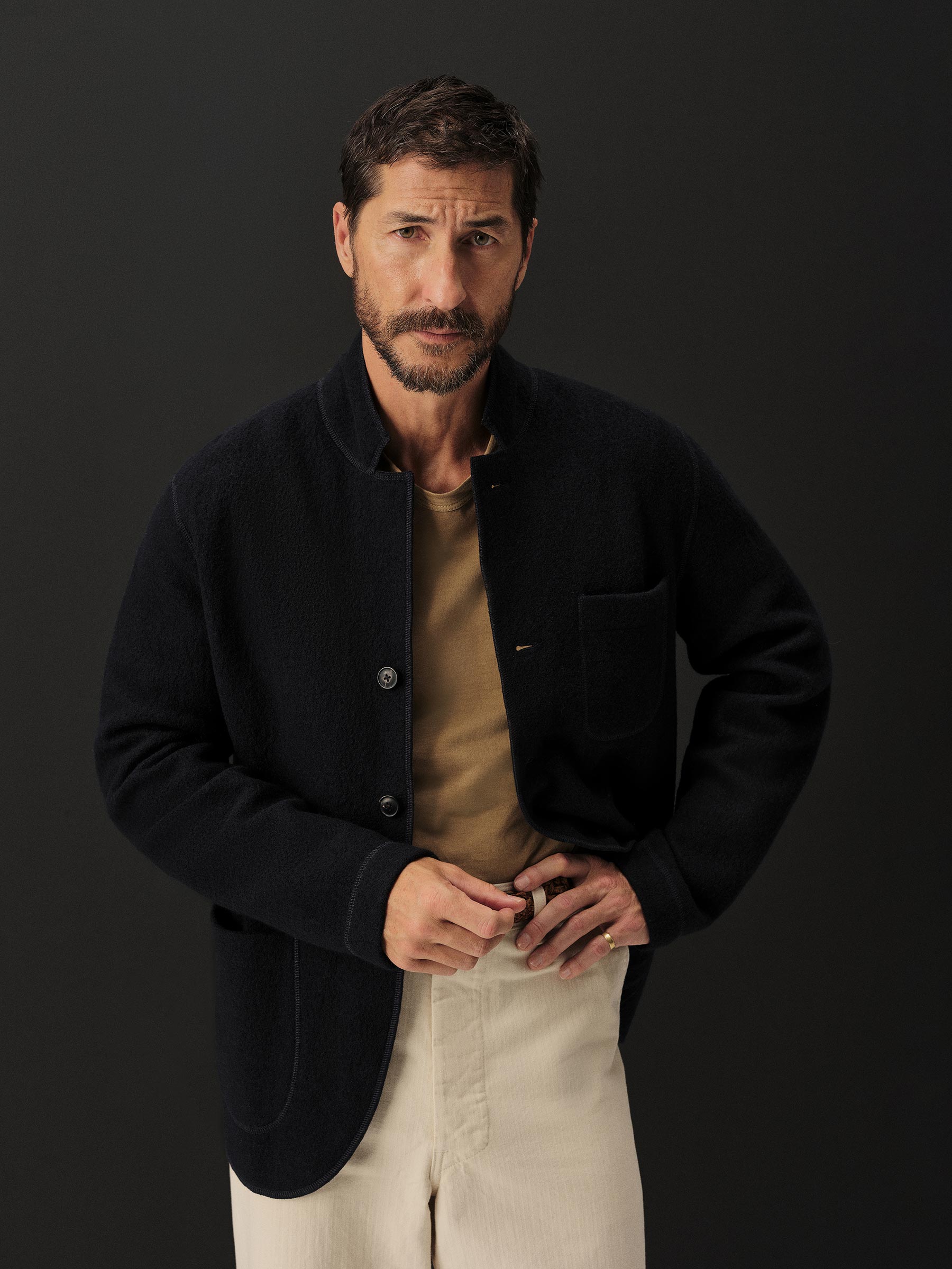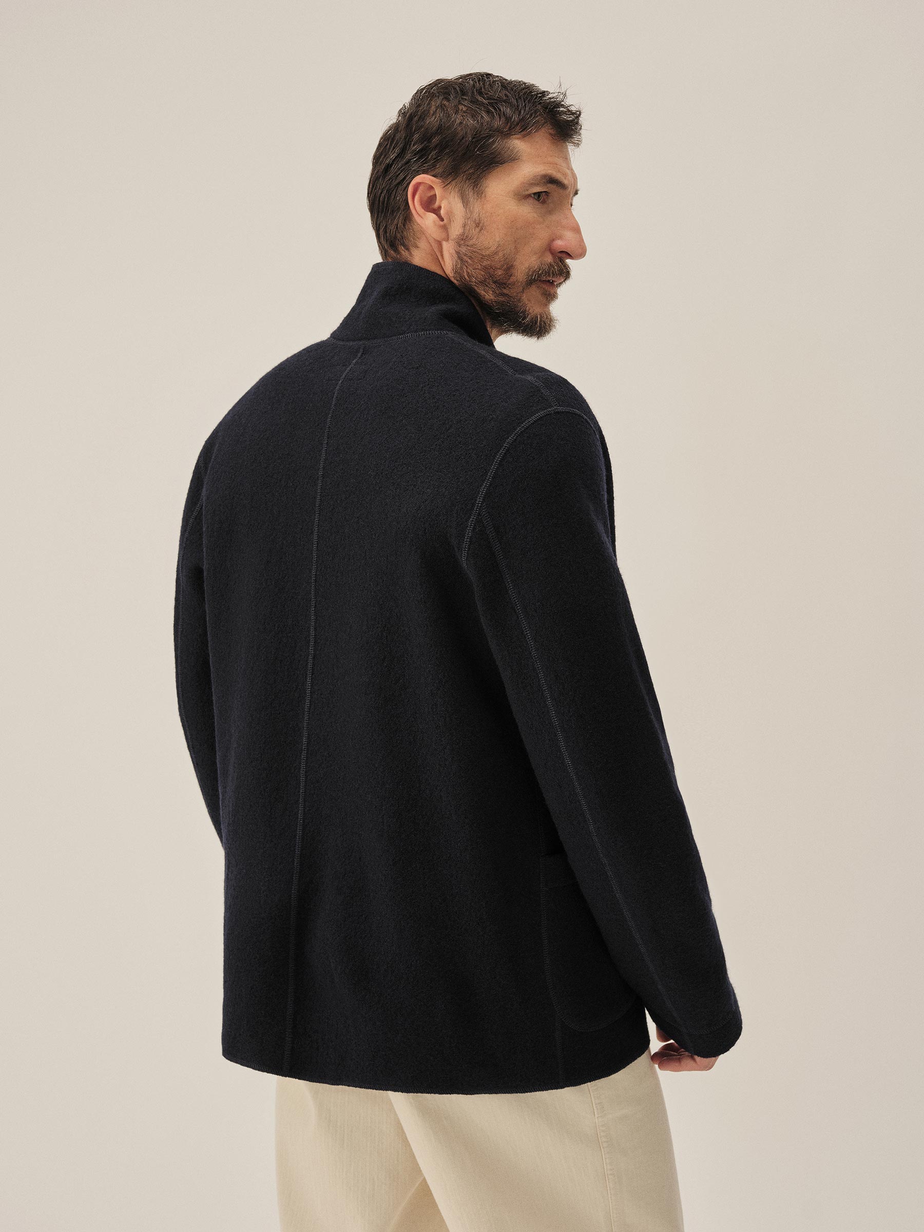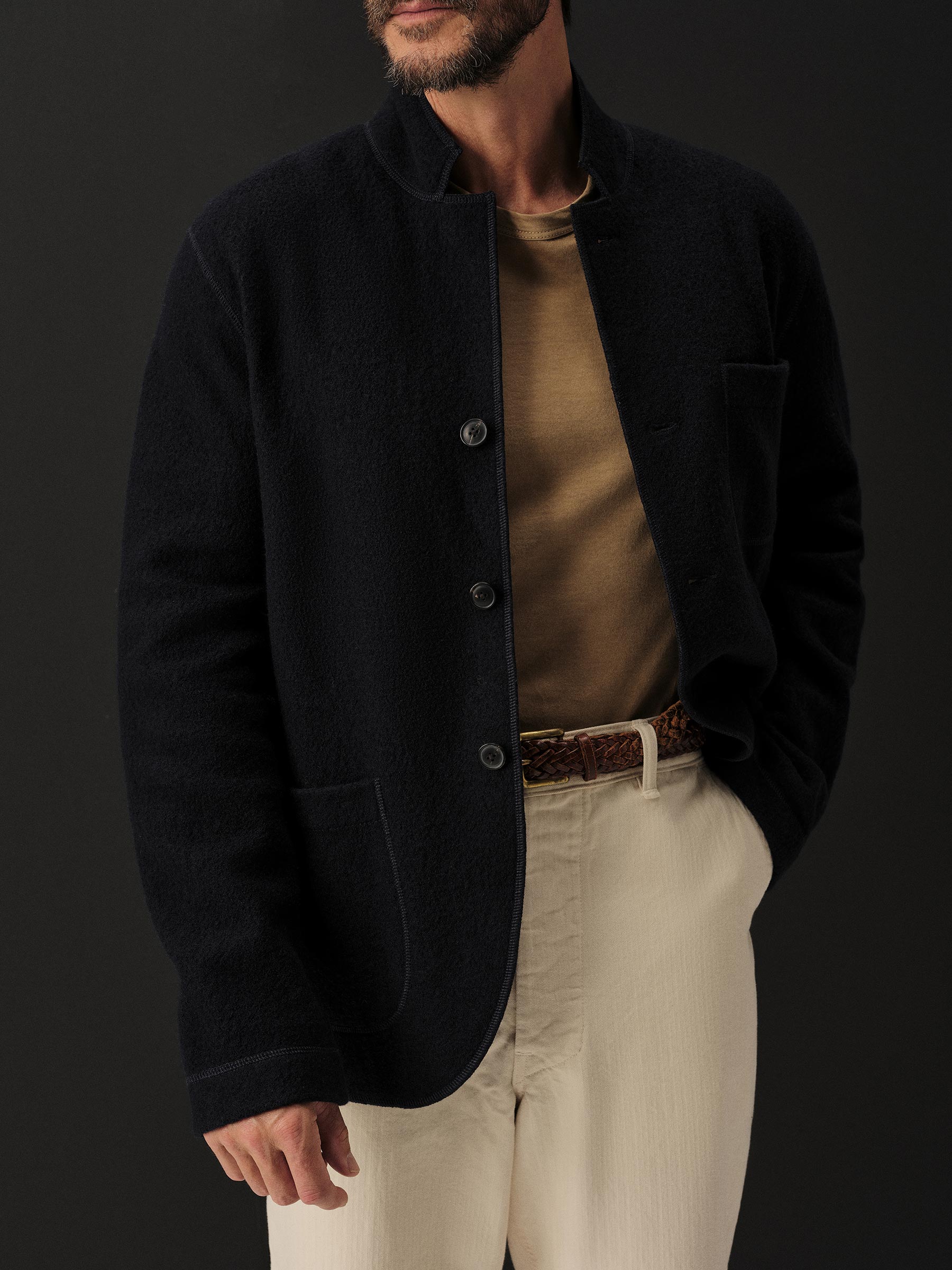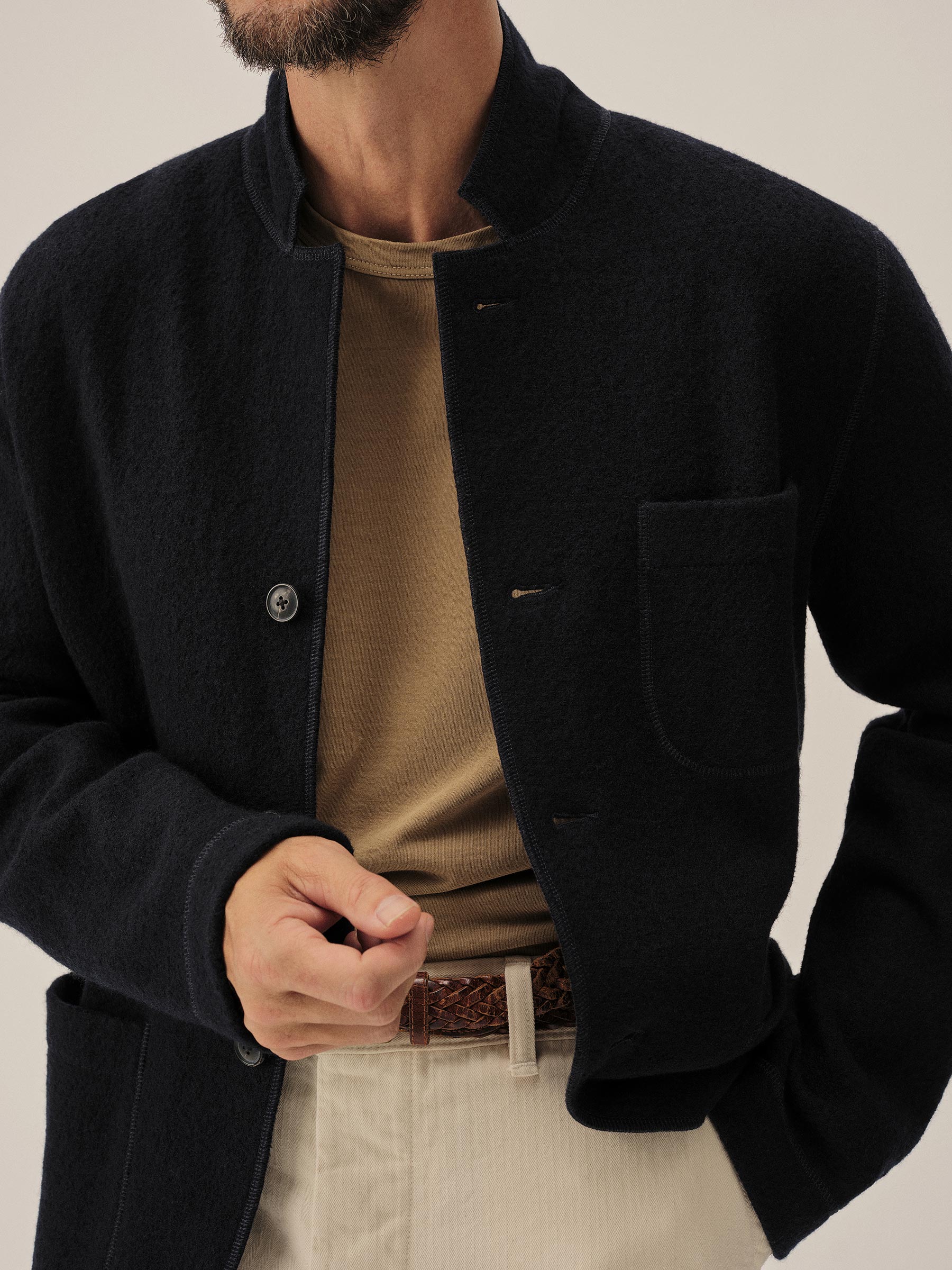 Classic fit chore coat with a slimmer cut through the arms and room in the torso for layering. This 340 GSM felted merino wool has been twice boiled for improved insulation and durability. Details include three patch pockets, real horn buttons, and a notch collar. Constructed with hand-sewn facings and cover-stitching throughout.