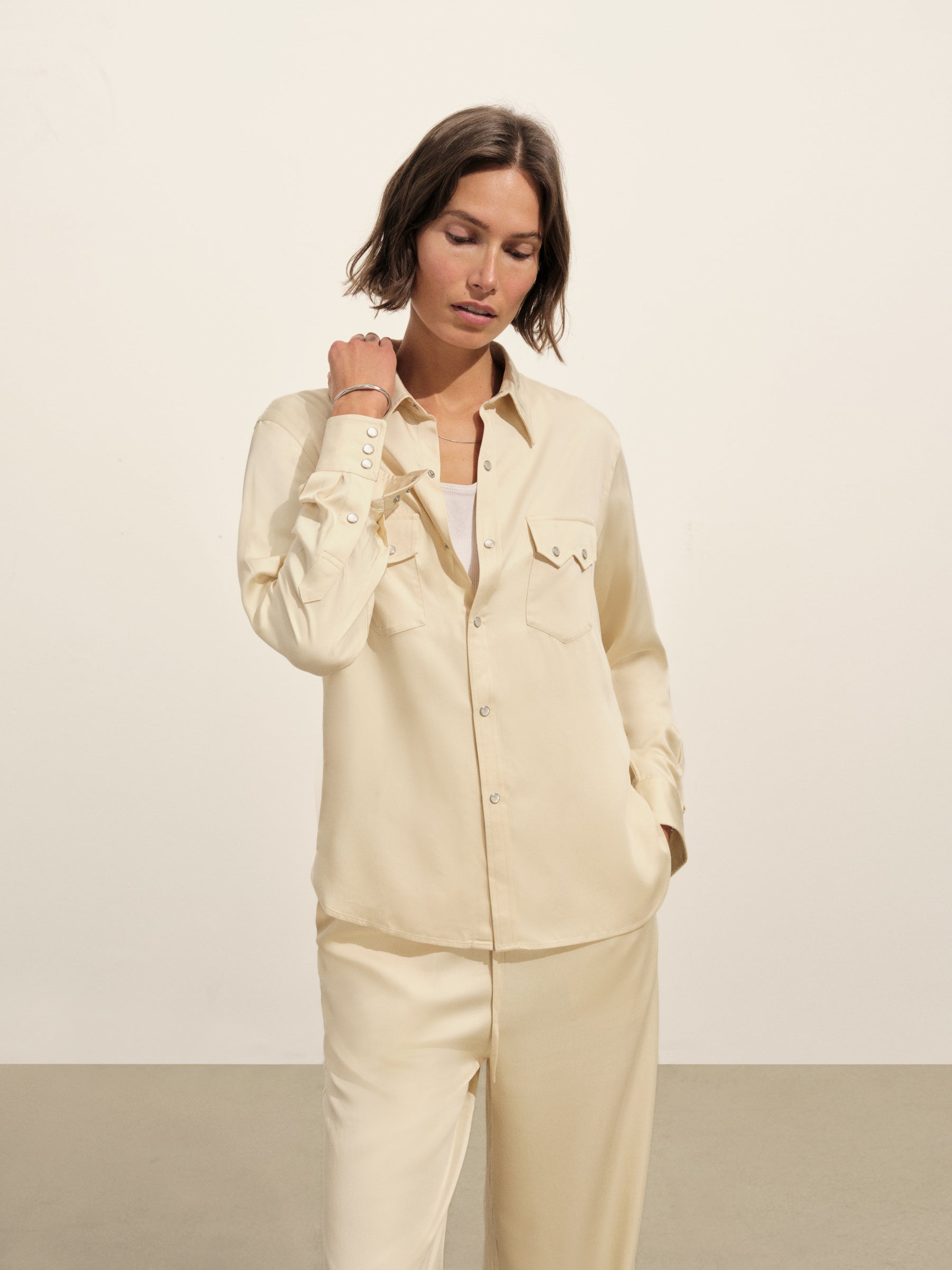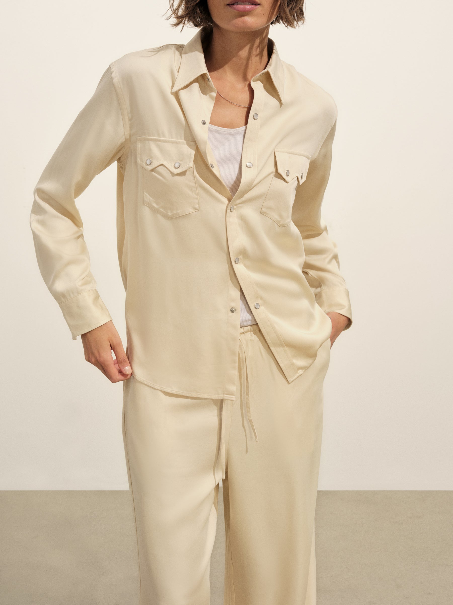 A silky, mid-century-inspired Western shirt with a relaxed body, distinct sawtooth pockets, and an arched back yoke with pleats. Cut from rayon modal and finished with French seams and pearl snaps.