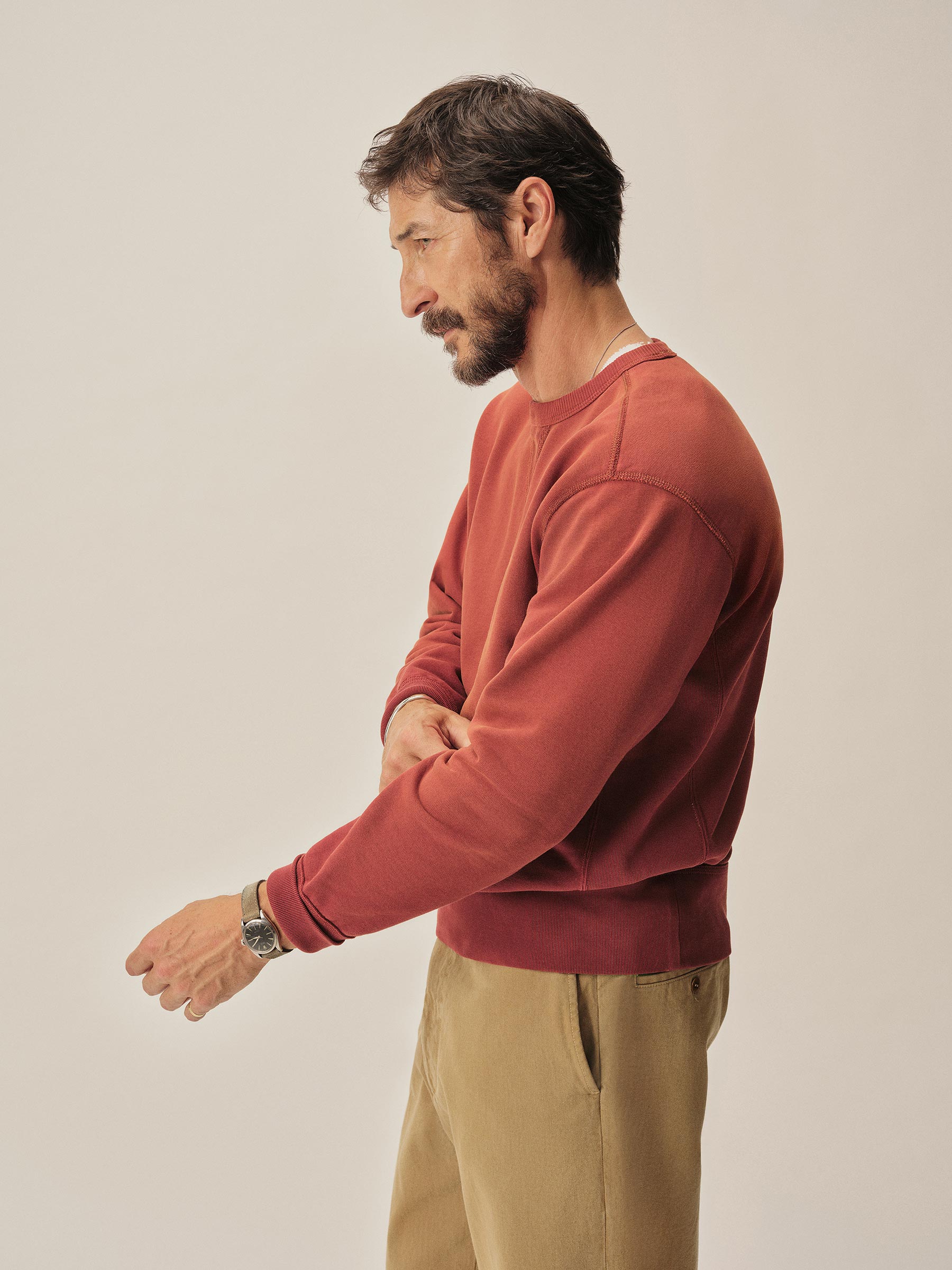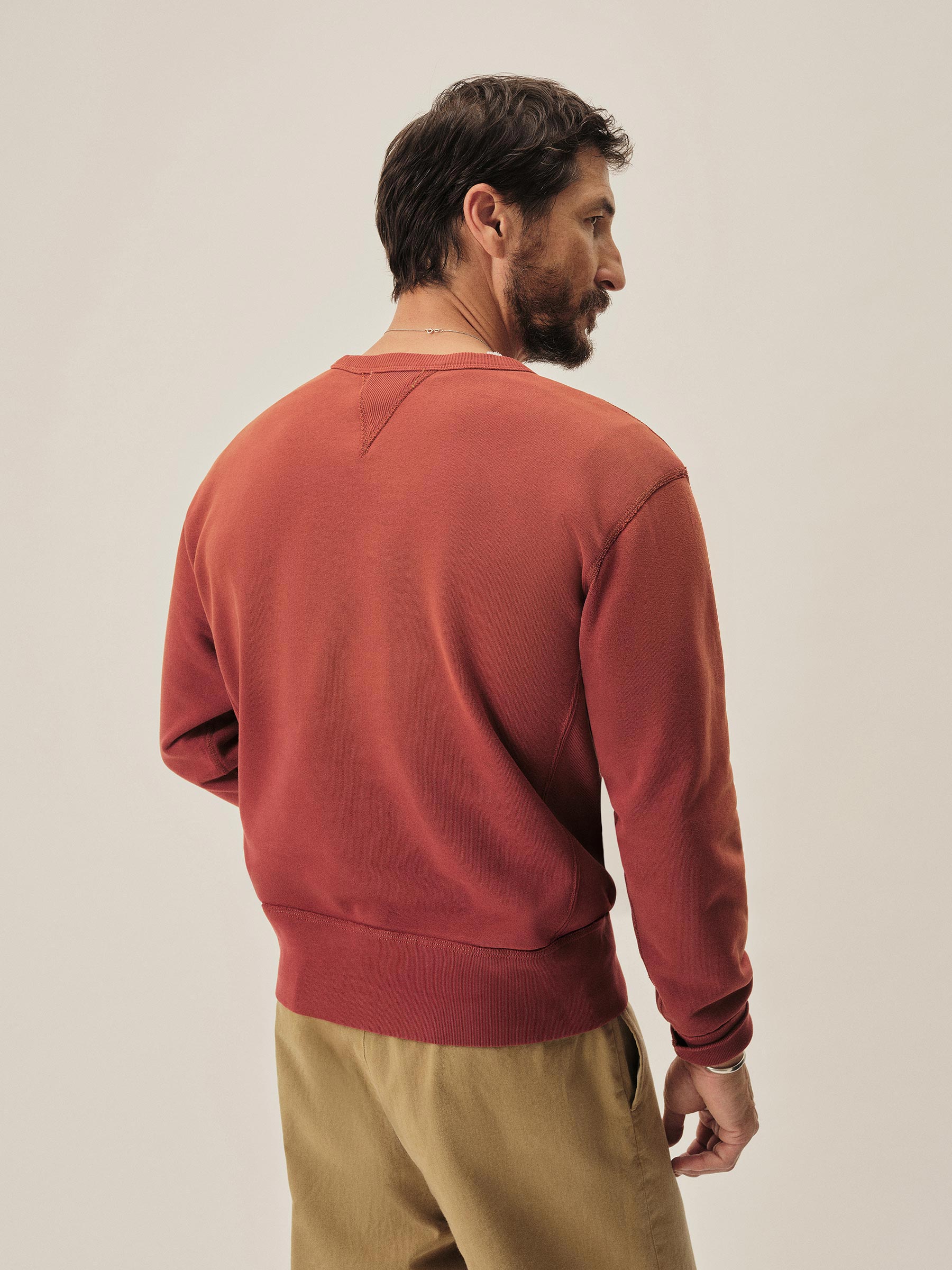 A midcentury-inspired crewneck sweatshirt made from plush, not-too-heavy, not-too-light, welterweight French terry. Features a “V” detailing at the front and back neck opening that was commonly found on sweatshirts from the 1940s and 50s.