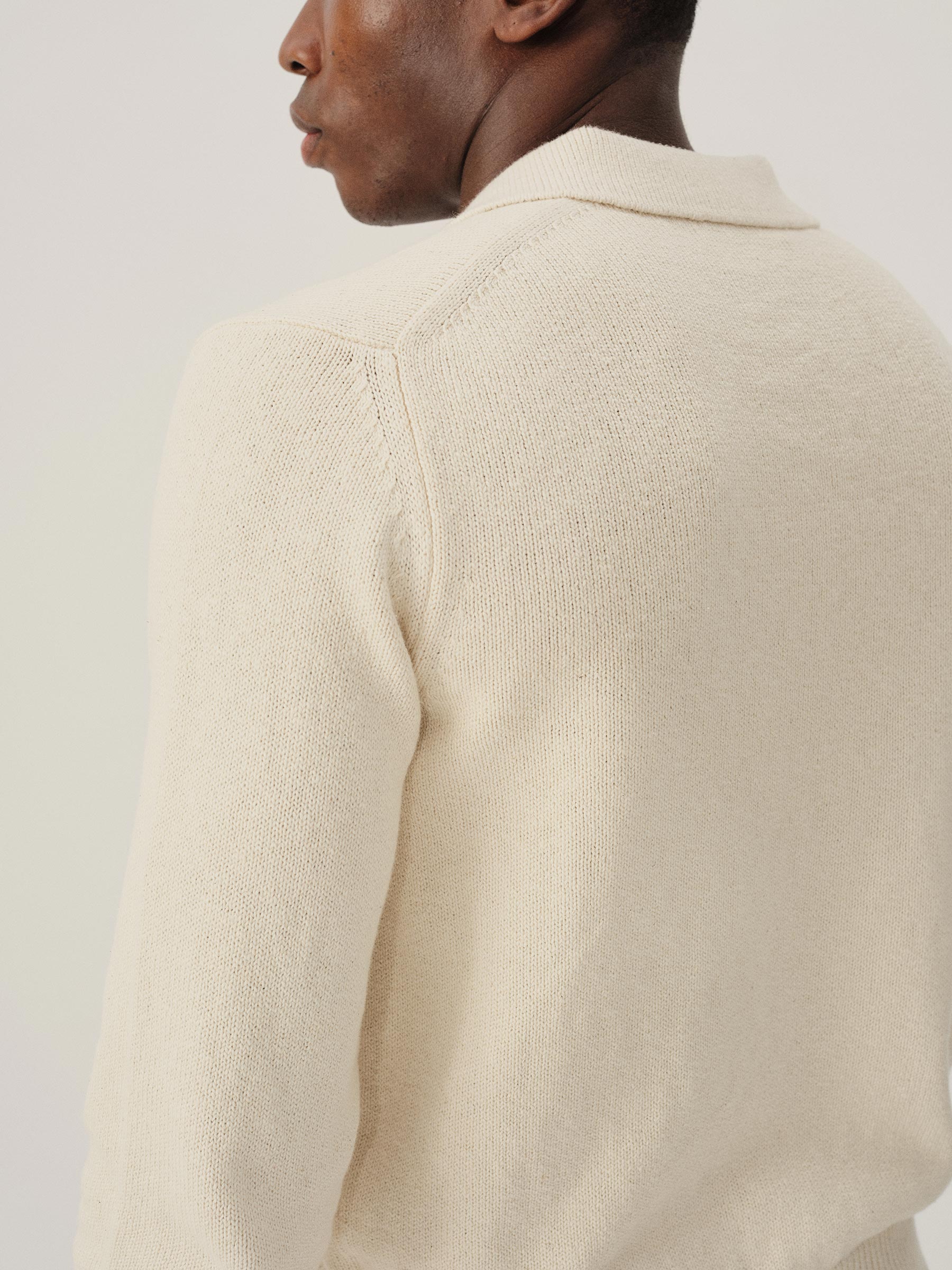 Classic fit polo sweater in a 7 gauge jersey knit from our homespun yarn-dyed cotton. Features a 3-button rib center front placket with nacre buttons and a rib collar designed to lay flat. Constructed with hand-linked seams and racking stitch detailing at the cuffs.