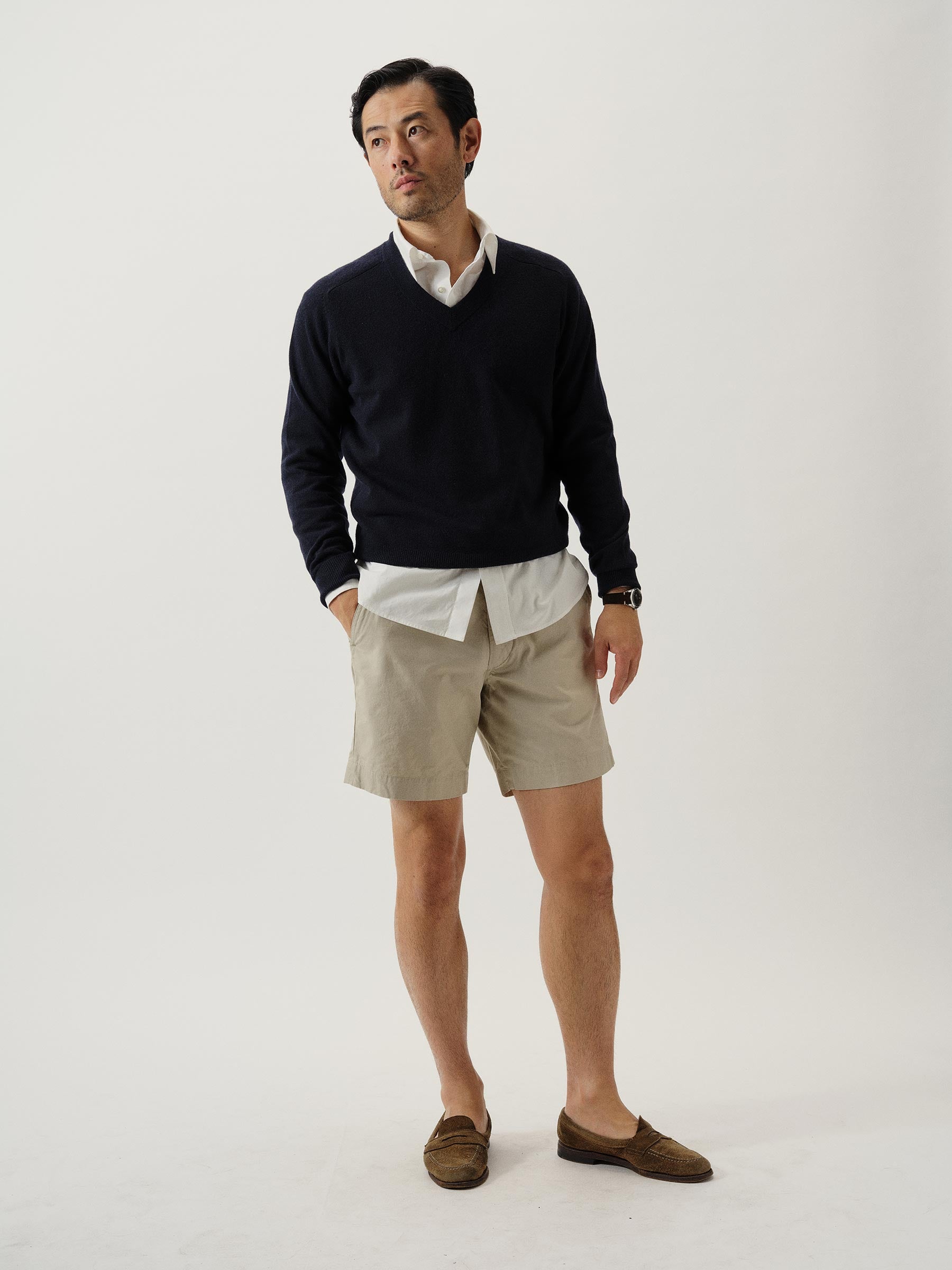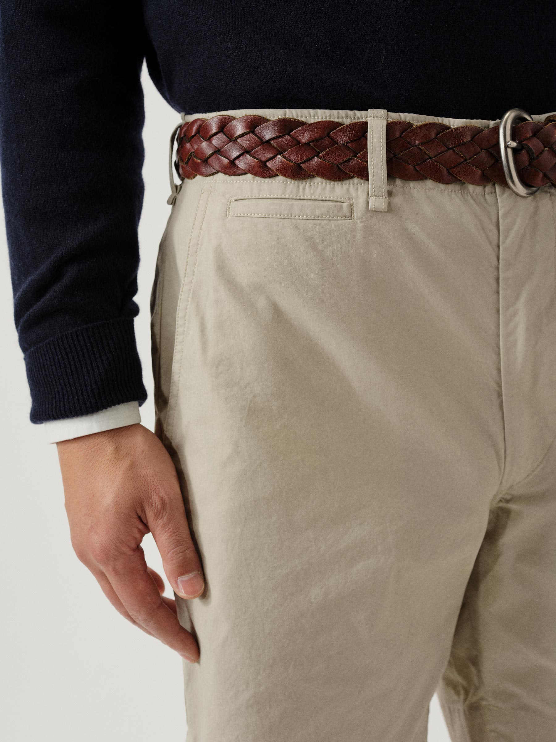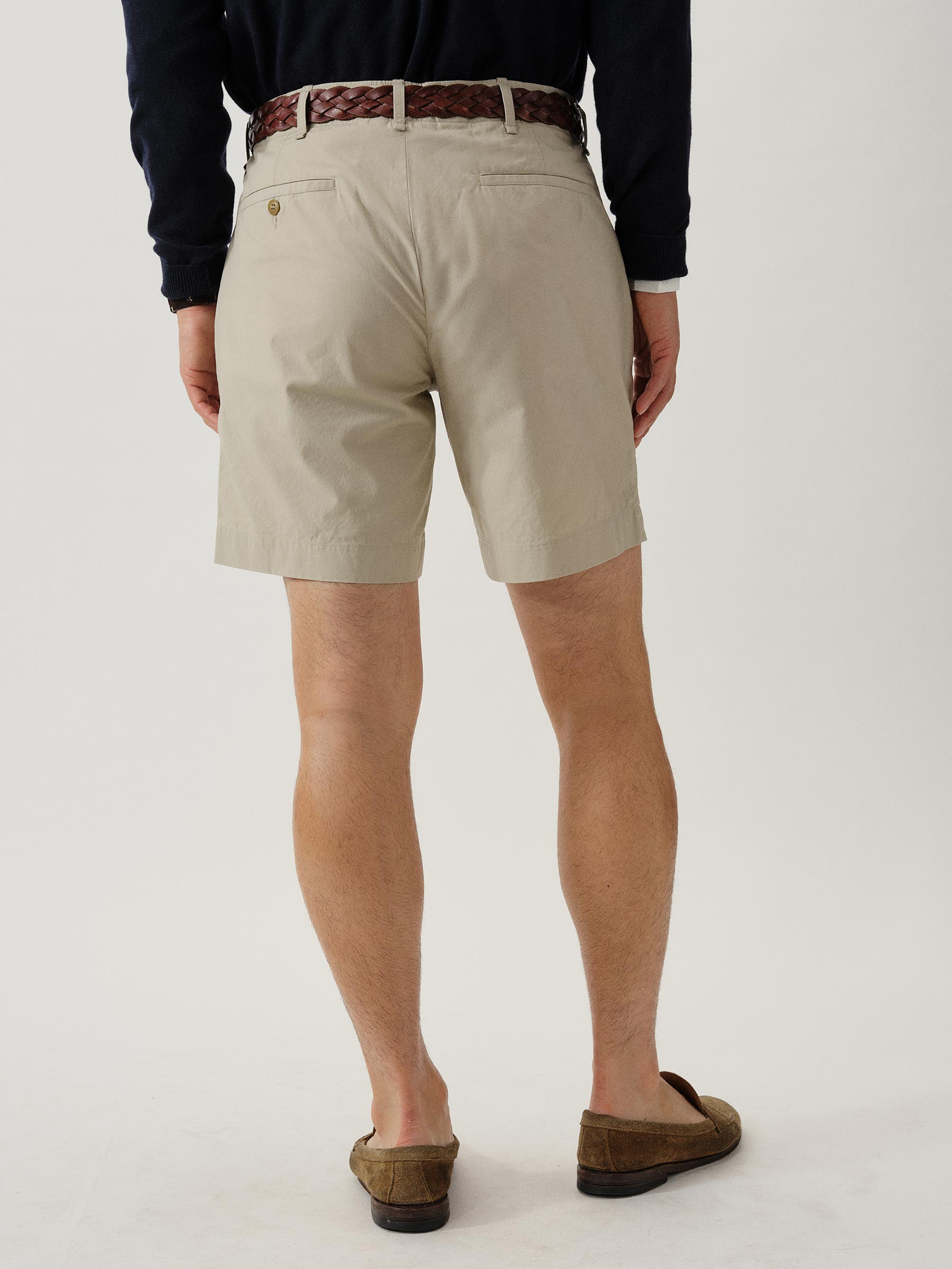 Easy tailored officer short with a tapered leg and 6.5″ inseam. This 5.5 oz. cotton poplin has a crisp hand and light structure suitable for warmer climates. Vintage army chino-inspired details include a Hollywood waistband, slash hip pockets, two single welt back pockets (one of which has a button closure), and a single welt coin pocket. Garment washed with enzymes and softener for a lived in feel. Zip fly with waist button closure.