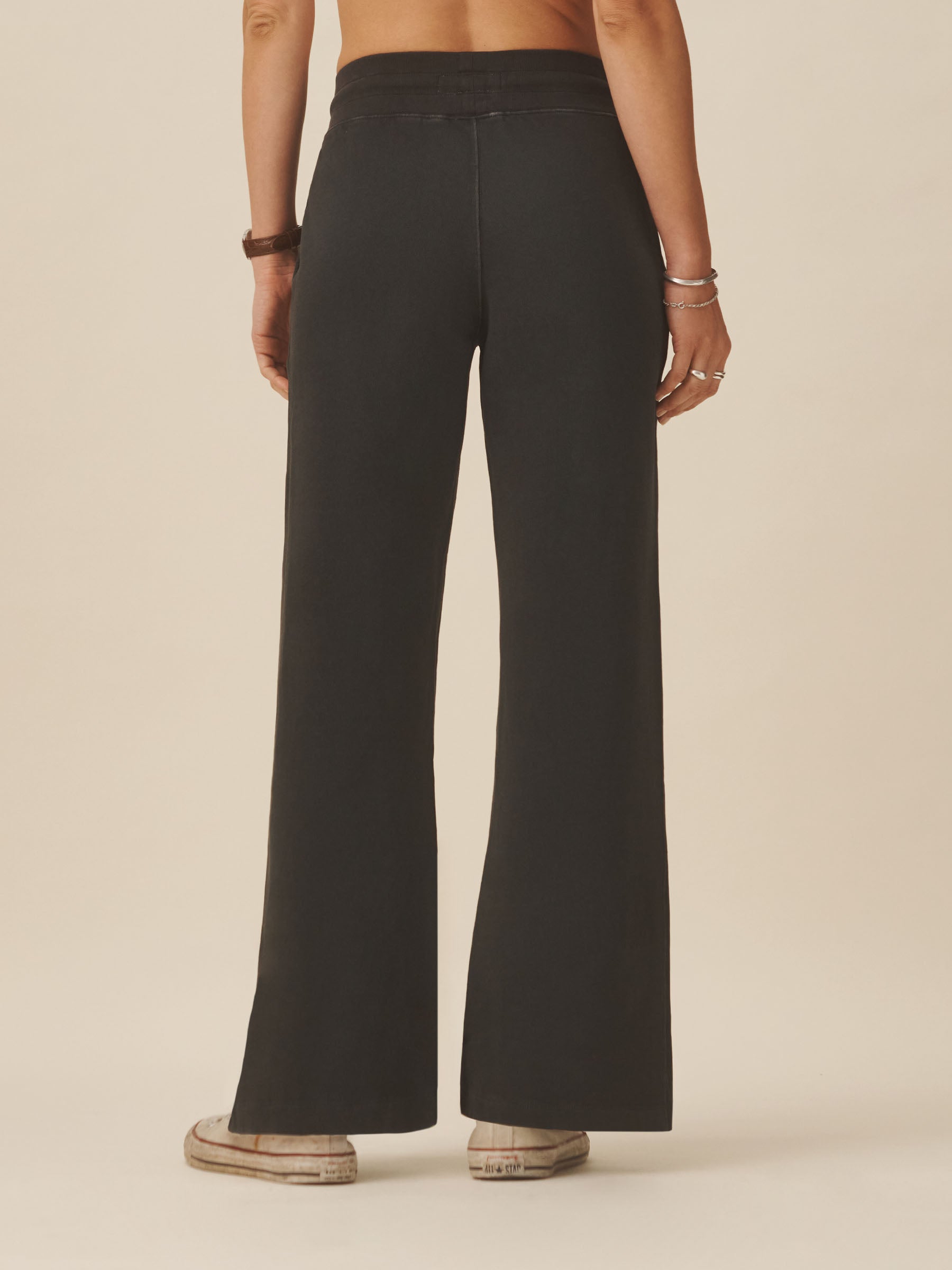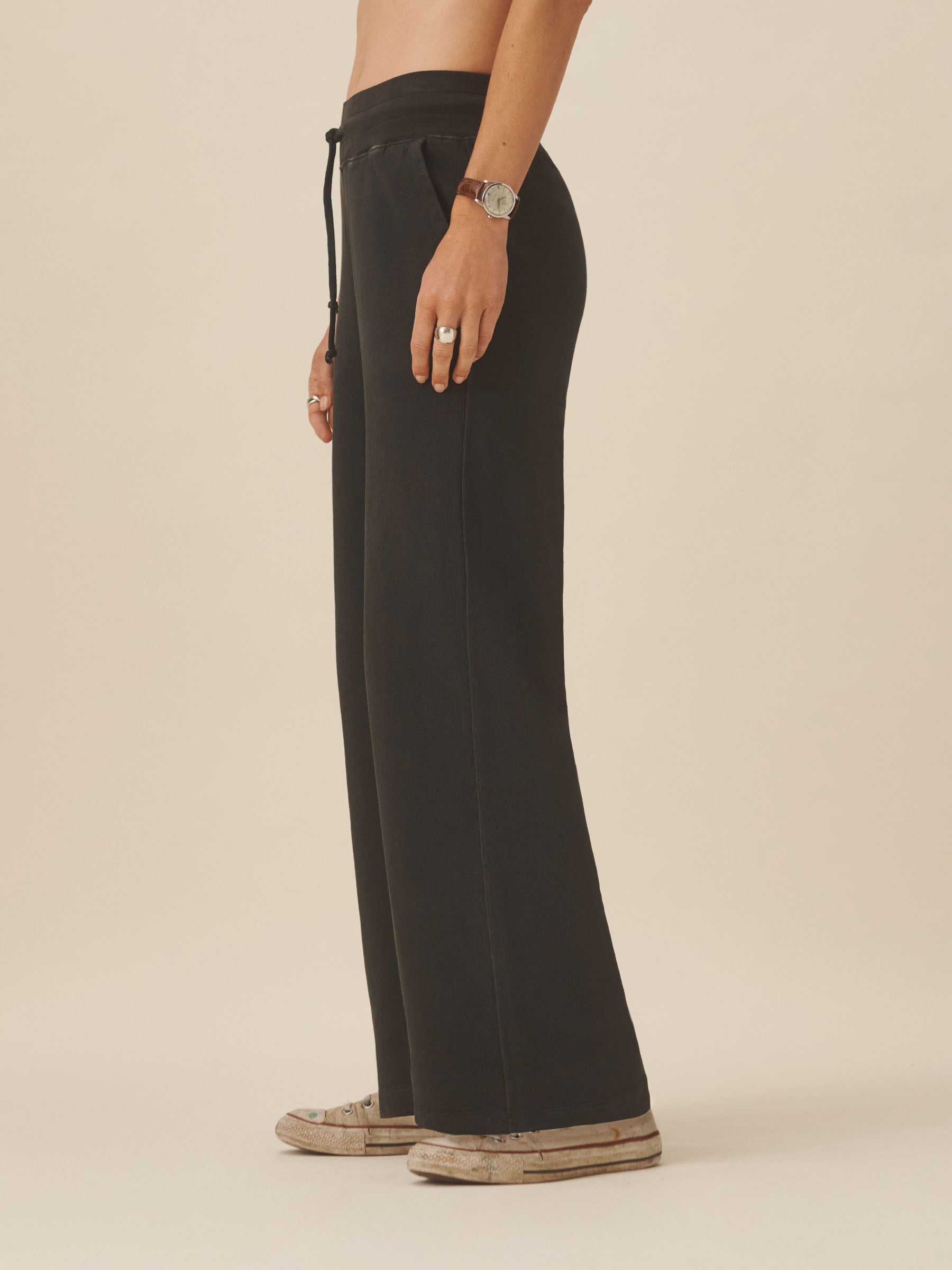 Wide leg, high-waisted sweatpants with a 28″ inseam. Can be worn at the natural waist or lower for a more relaxed fit. Cut from 290 GSM cotton French terry with a semi-brushed back. Features a wide, ribbed waistband with drawcord for fit adjustments. Constructed with straddle stitching at seams for durability. Garment dyed and washed for a lived-in feel. Pair with our Vintage Overloop Crew.