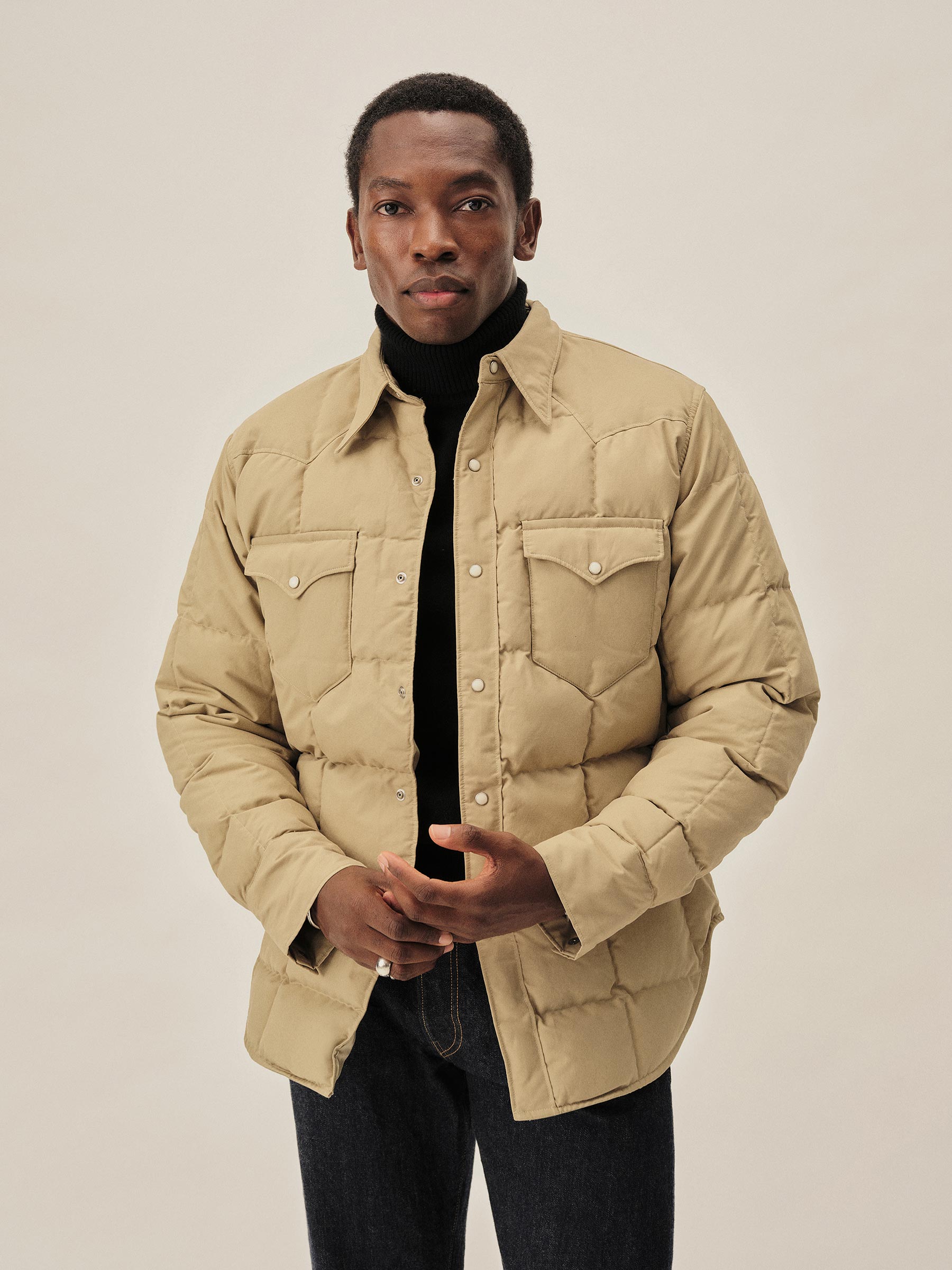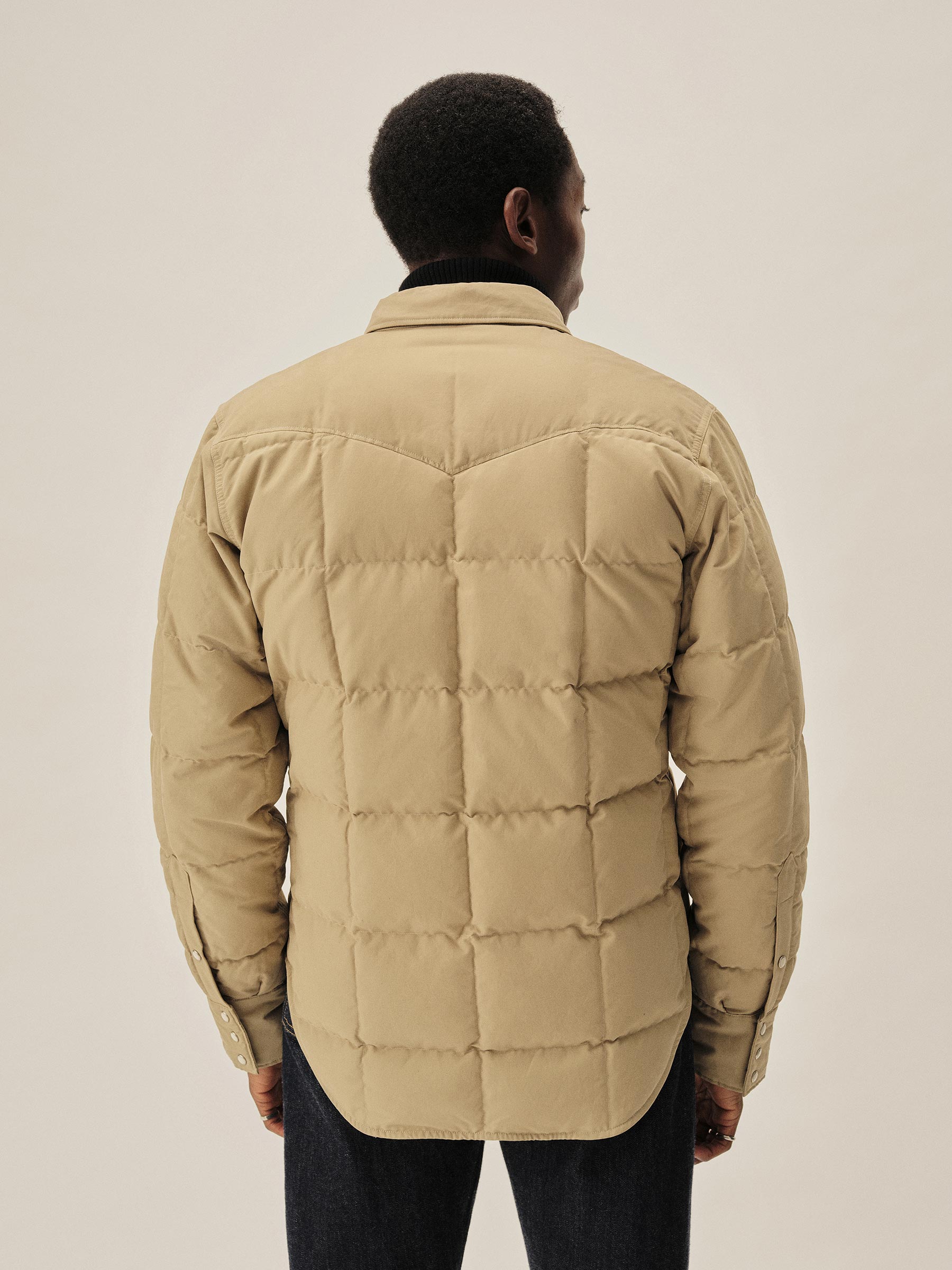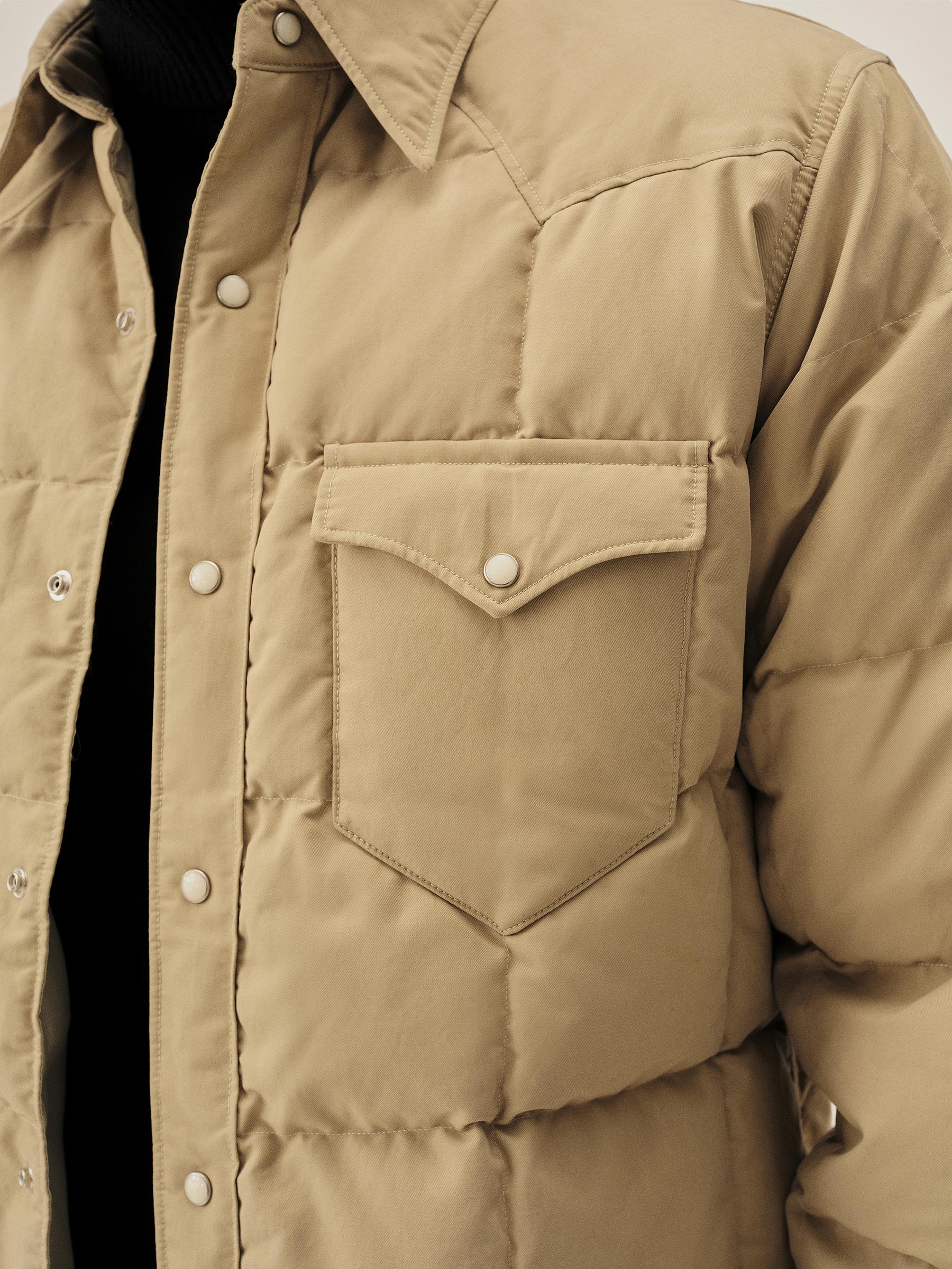A down-filled, quilted shirt in a 190 GSM cotton-nylon blend, designed with classic western details including a pointed yoke, five-point flap chest pockets, and vintage-inspired pearl snaps. Fully lined for comfort and warmth.