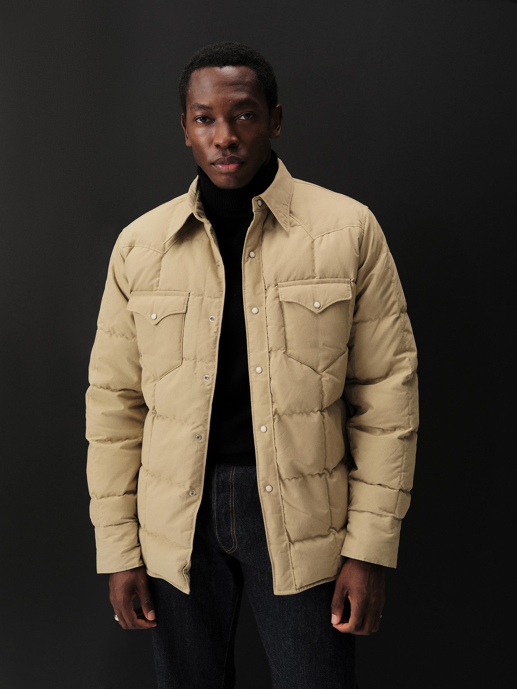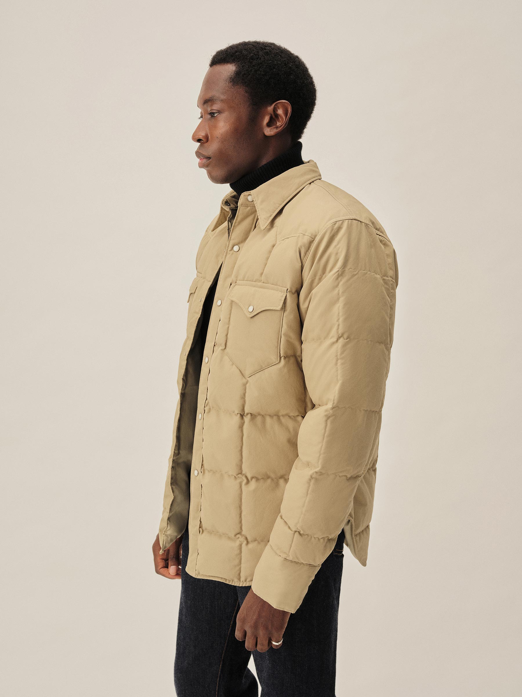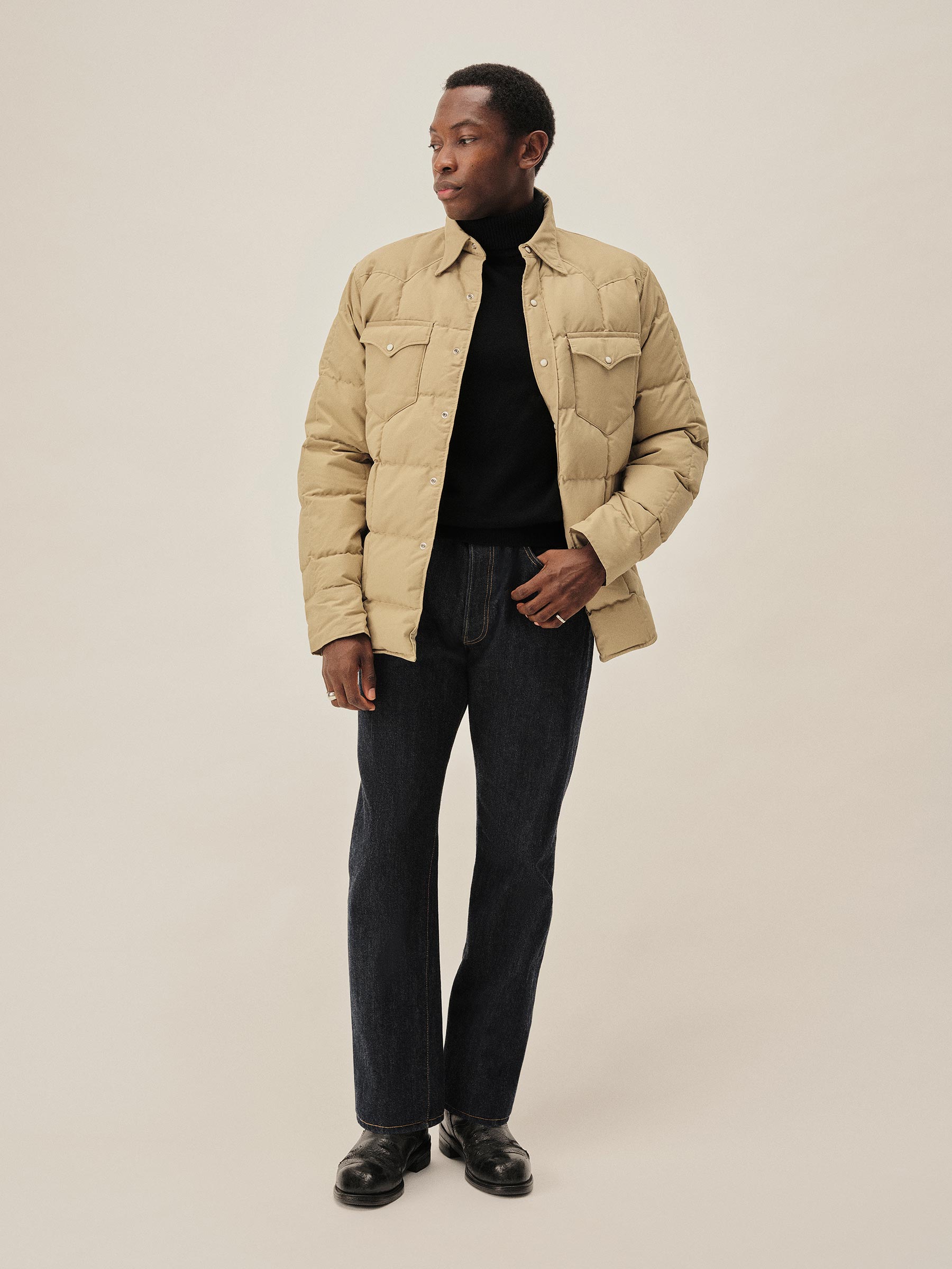 A down-filled, quilted shirt in a 190 GSM cotton-nylon blend, designed with classic western details including a pointed yoke, five-point flap chest pockets, and vintage-inspired pearl snaps. Fully lined for comfort and warmth.