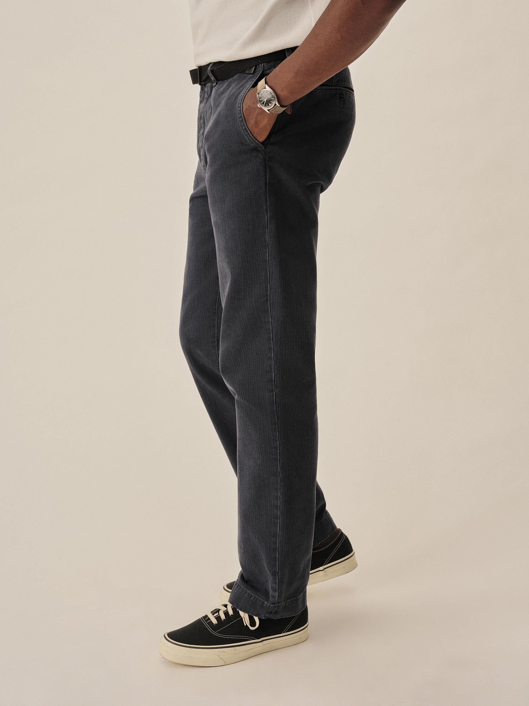 The classic officer’s pant in our Maverick Slim Fit: mid-rise, slim through the thighs with a taper below the knee. Cut from a midweight cotton HBT that’s been washed to achieve the same look and feel of vintage service uniforms. Featuring a one-piece “Hollywood” waistband, slash front pockets, welted back pockets, and a welted coin pocket. Finished with real corozo buttons. Garment washed for a lived-in feel. Button fly.