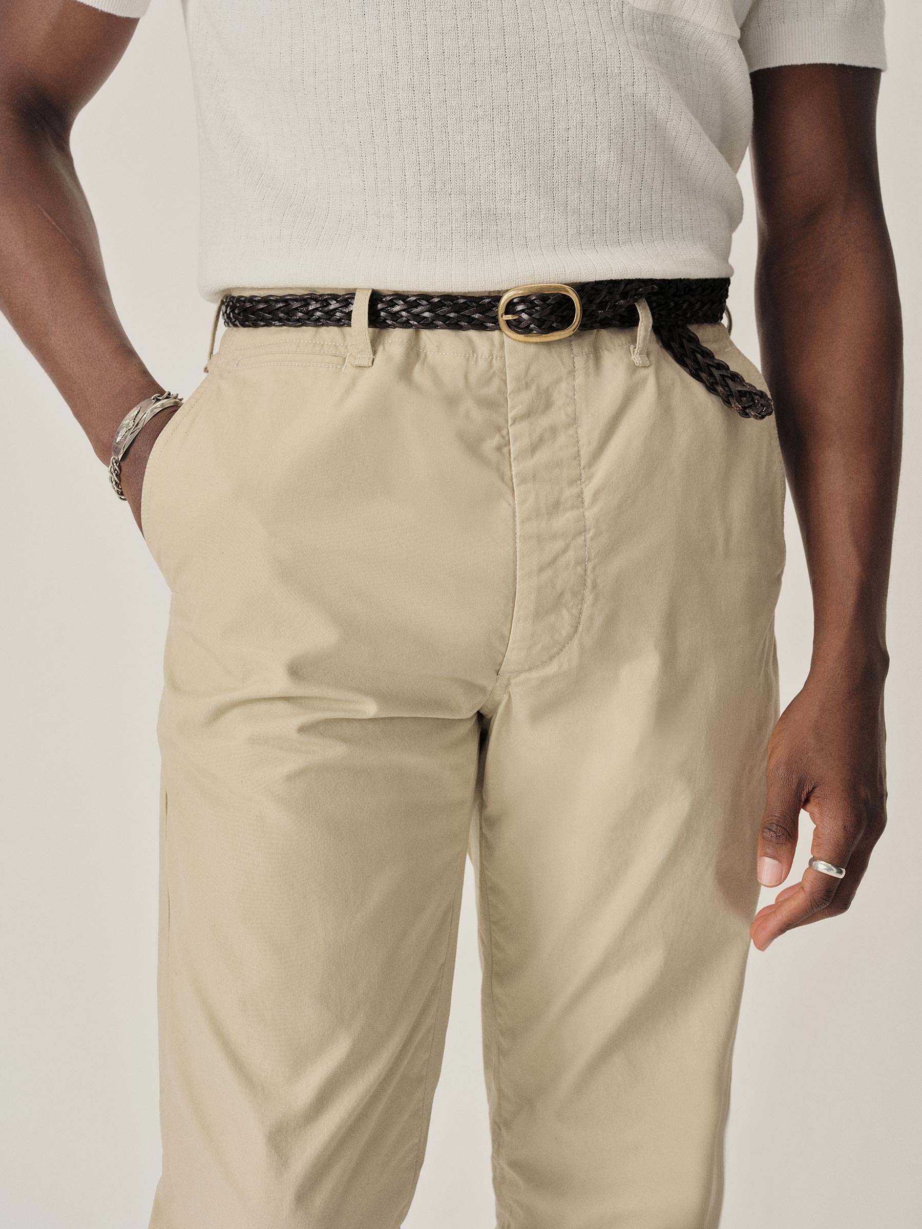 The classic officer’s pant in our Maverick Slim fit: mid-rise, slim through the thighs with a taper below the knee. Cut from 5.5 oz. cotton poplin with a crisp hand and light structure that’s suitable for warmer climates. Features a “Hollywood” one-piece waistband, slash front pockets, welted back pockets, and a welted coin pocket. Lined with a natural canvas interior and finished with corozo buttons. Garment-washed for a lived-in feel. Button fly.