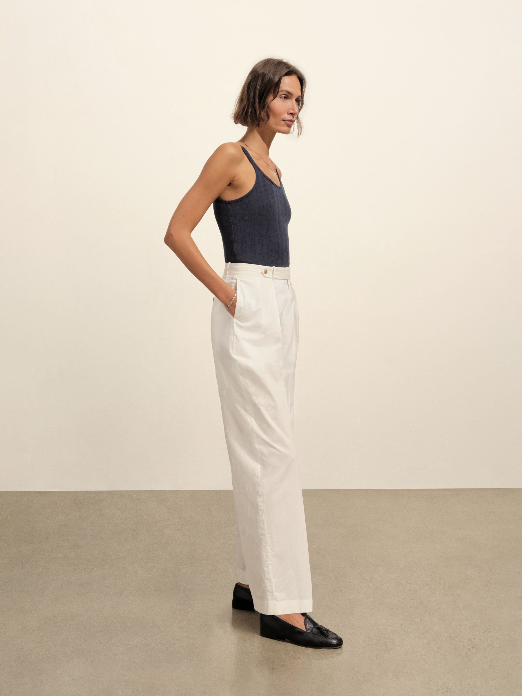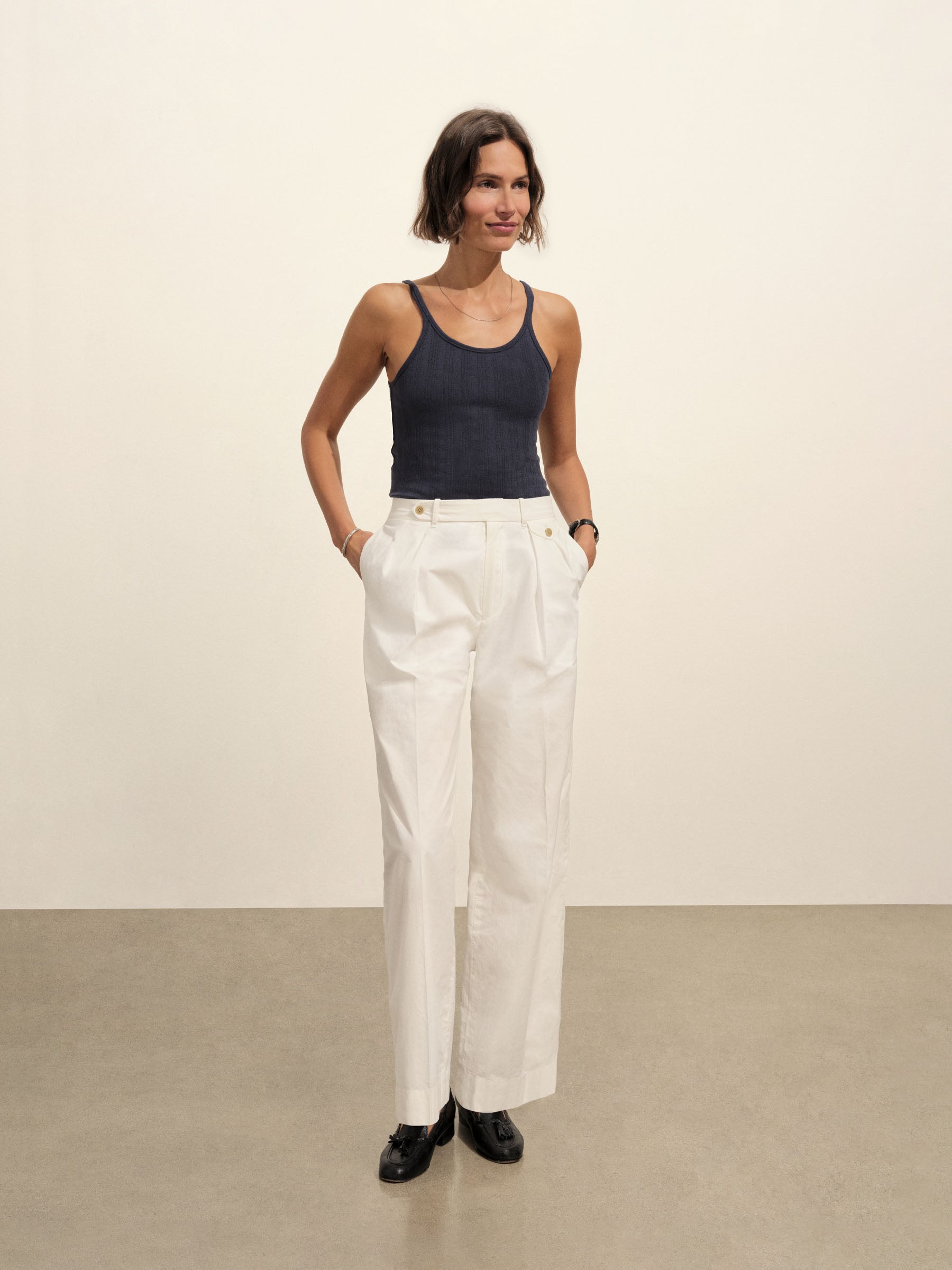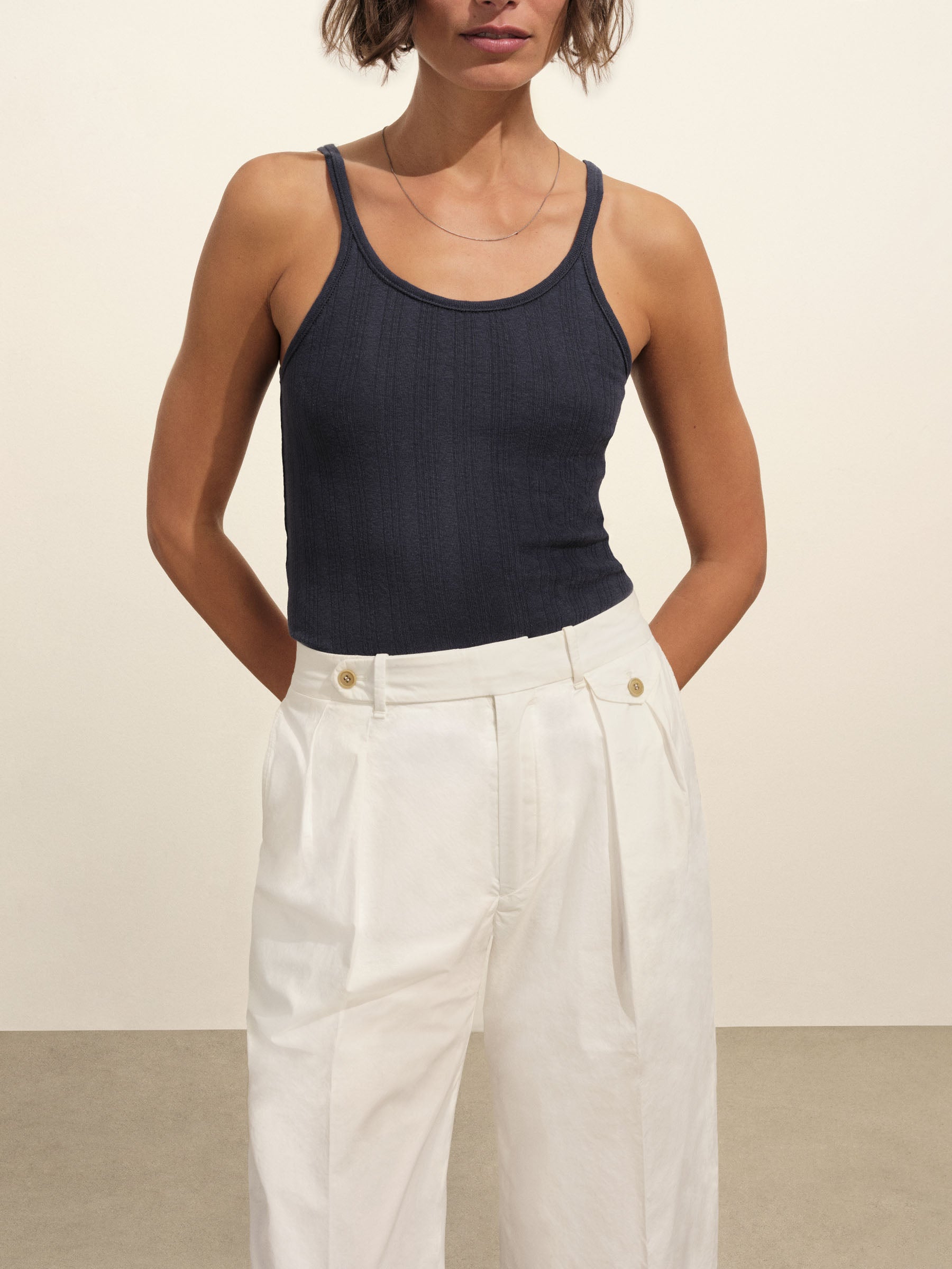 Slim-fit, vintage-inspired base tank made from a textured blend of 60% recycled cotton and 40% cotton. Features a scalloped scoop neckline, contrast rib binding, and discreet baby snaps at the shoulders to keep bra straps in place.