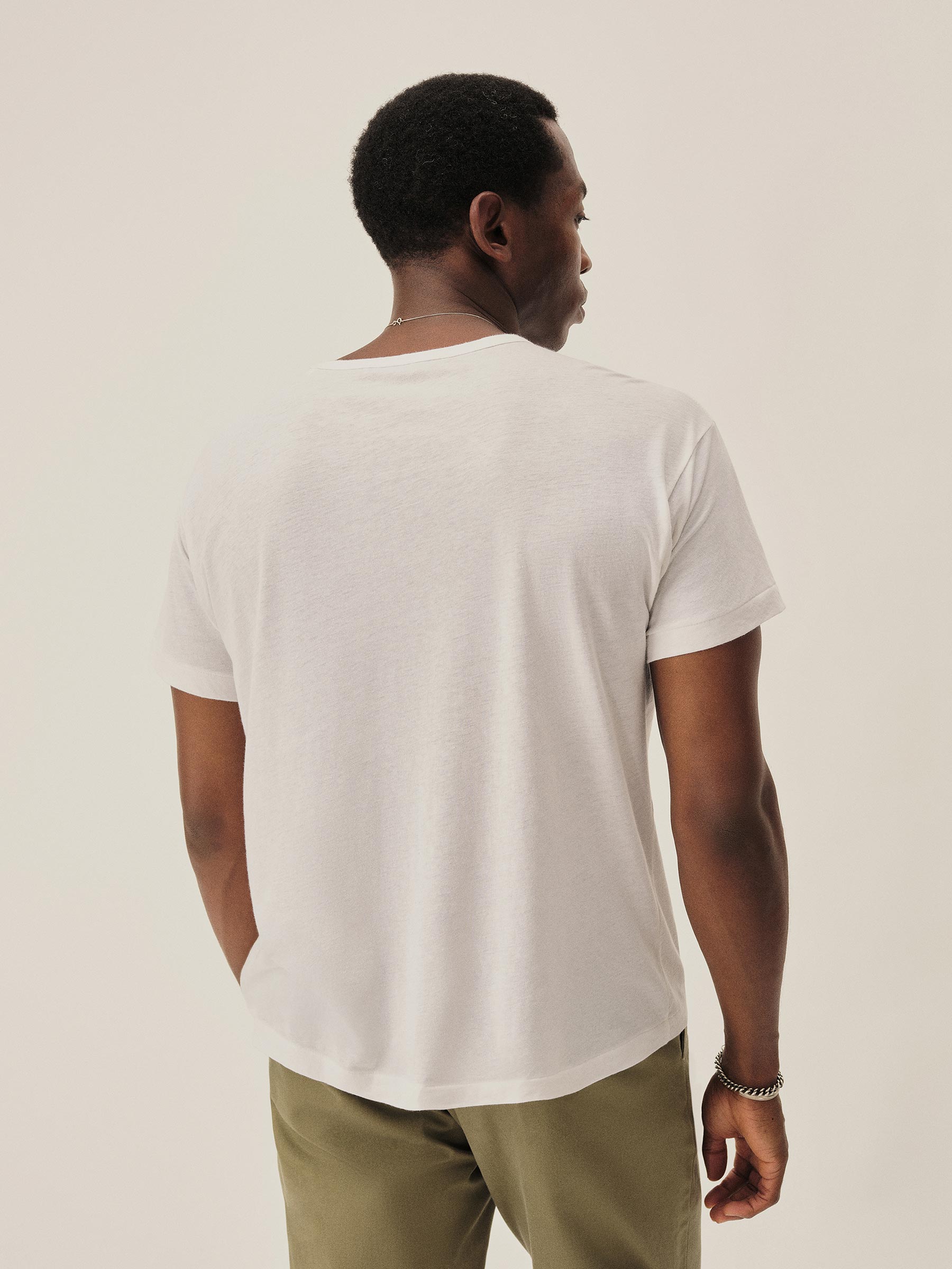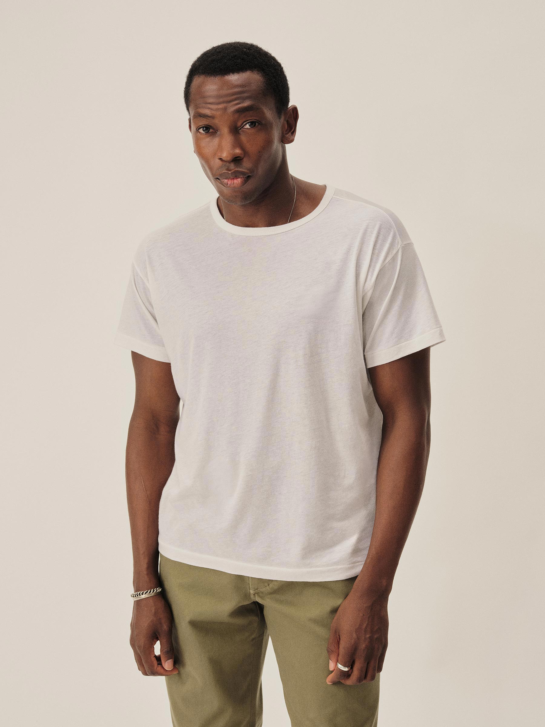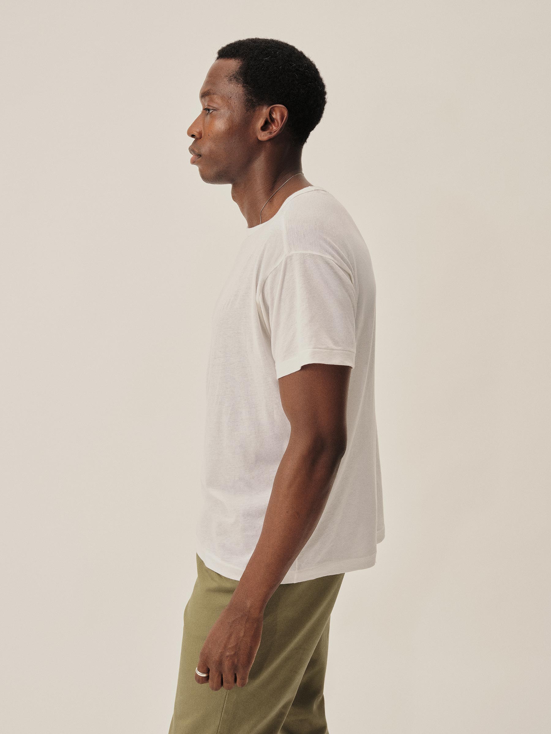 Crafted from a custom-spun, super fine 56 singles blended cotton-linen yarn, spun and knit exclusively in Japan. This fabric is designed to combine the smoothness of a premium yarn with the subtle texture of something more rugged. The result is a tee that’s smooth, cool, and light as air with a subtle silky hand feel. Finished with a rib-bound crewneck, blind hems at the sleeves and bottom, and overlocked seams.