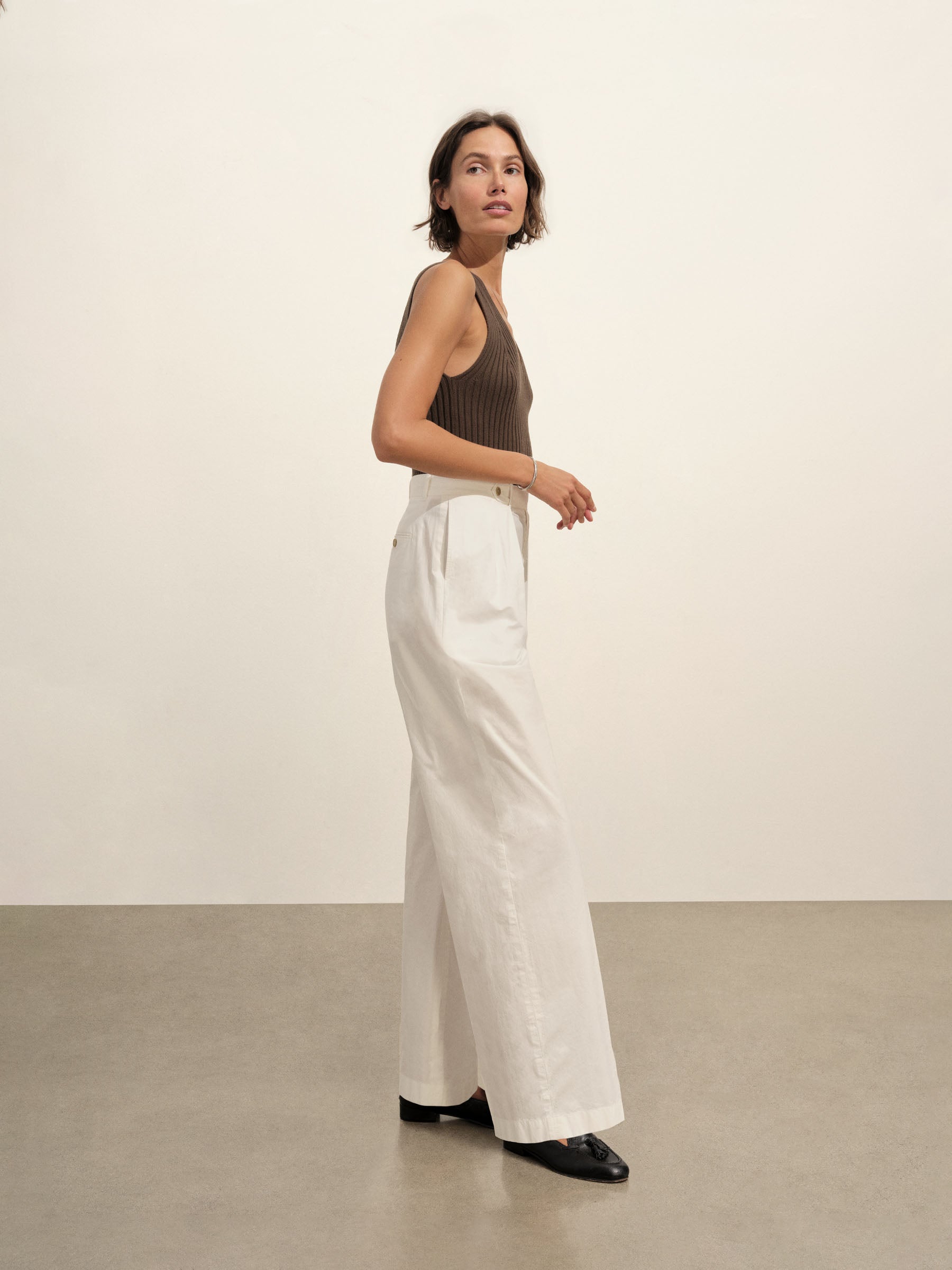 Taking inspiration from 1940s men’s trousers, a wide-leg pleated pant reimagined for modern wear. Cut from lightweight cotton poplin and framed with a 32″ inseam and a high-rise. Featuring a button-through waistband extension, a single front coin pocket with button-down flap, and back welt pockets with a single button closure. Finished with corozo buttons and a zipper fly. Garment-washed for a vintage look and feel.