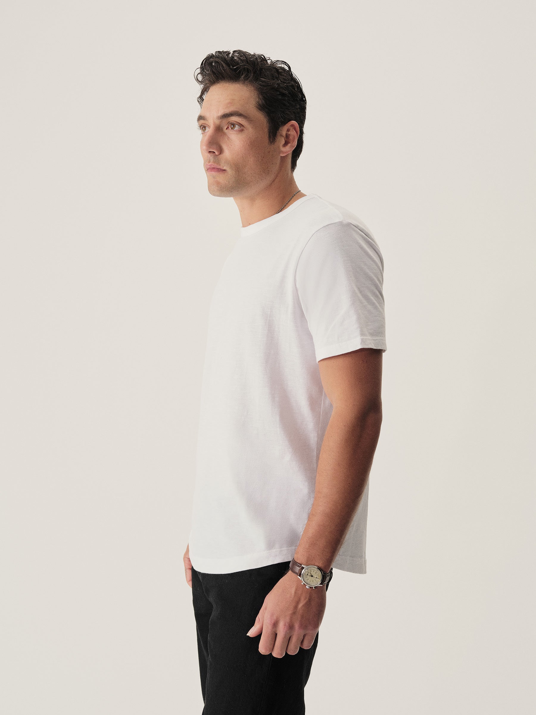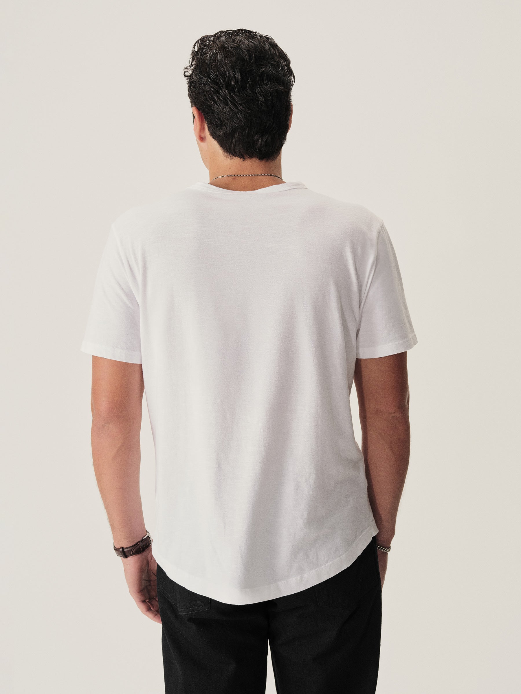 Classic fit short sleeve crewneck tee with our signature curved hem, cut from USA grown 145 GSM cotton with a light slub texture and sewn at BM Knitting Mills in Mohnton, PA. Constructed with self-neck binding and a flat stitch finish for comfort. Garment washed with enzymes and softener for a lived-in feel.