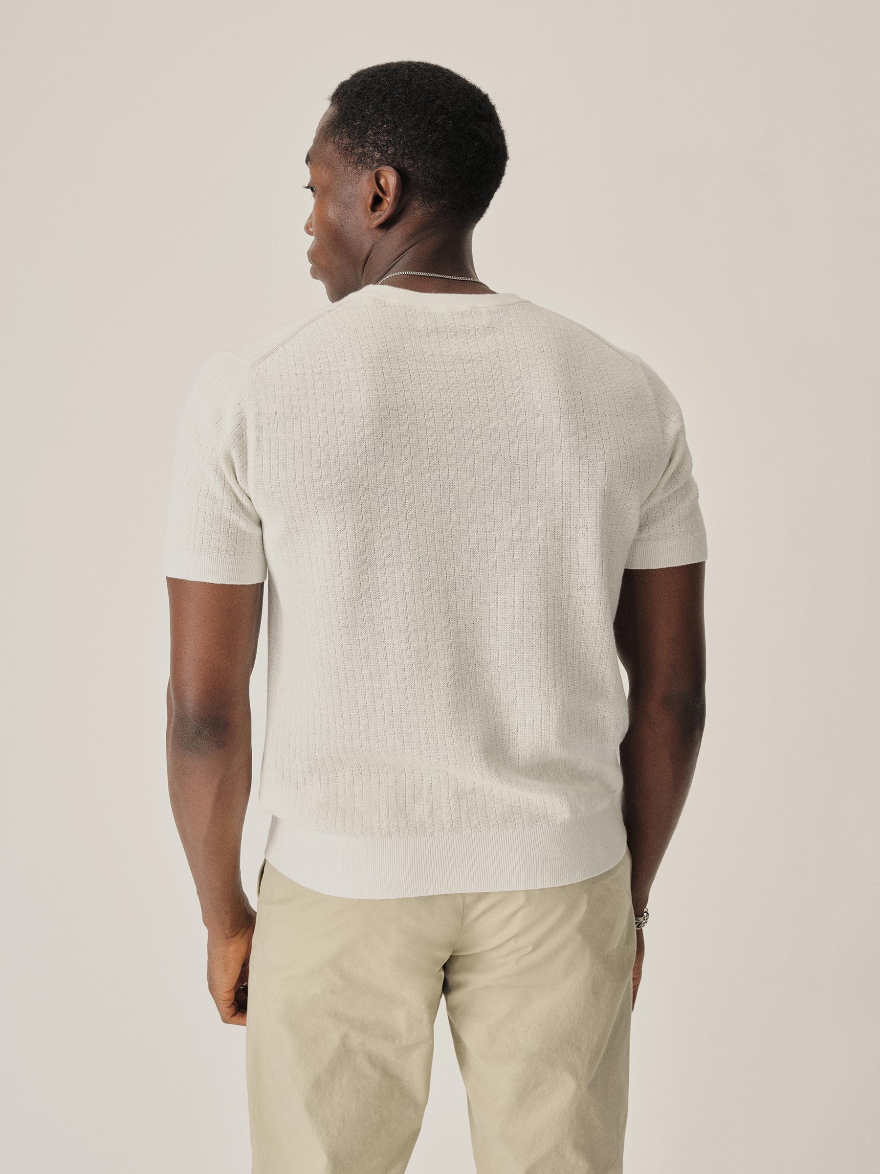 A classic fit tee in a fine knit drop-needle rib construction. Made from 12 gauge yarn-dyed hemp/cotton blend that wicks moisture and breathes easily. Chest pocket with ribbed opening. Finished with a 1×1 rib at collar, cuffs and waistband. A versatile summer layer inspired by vintage rib tees.