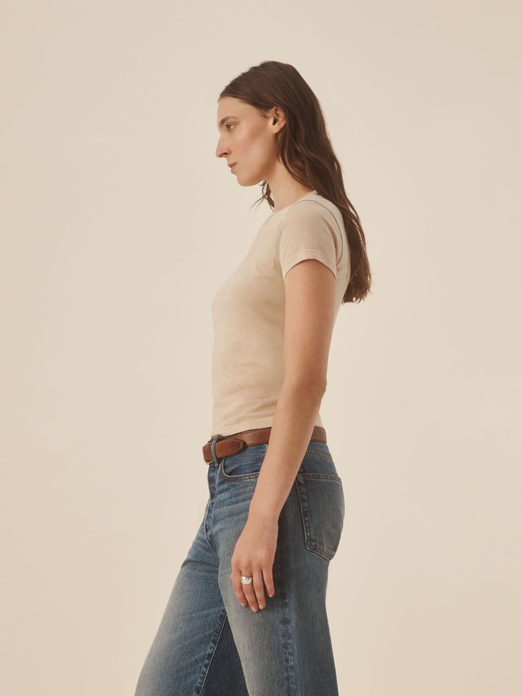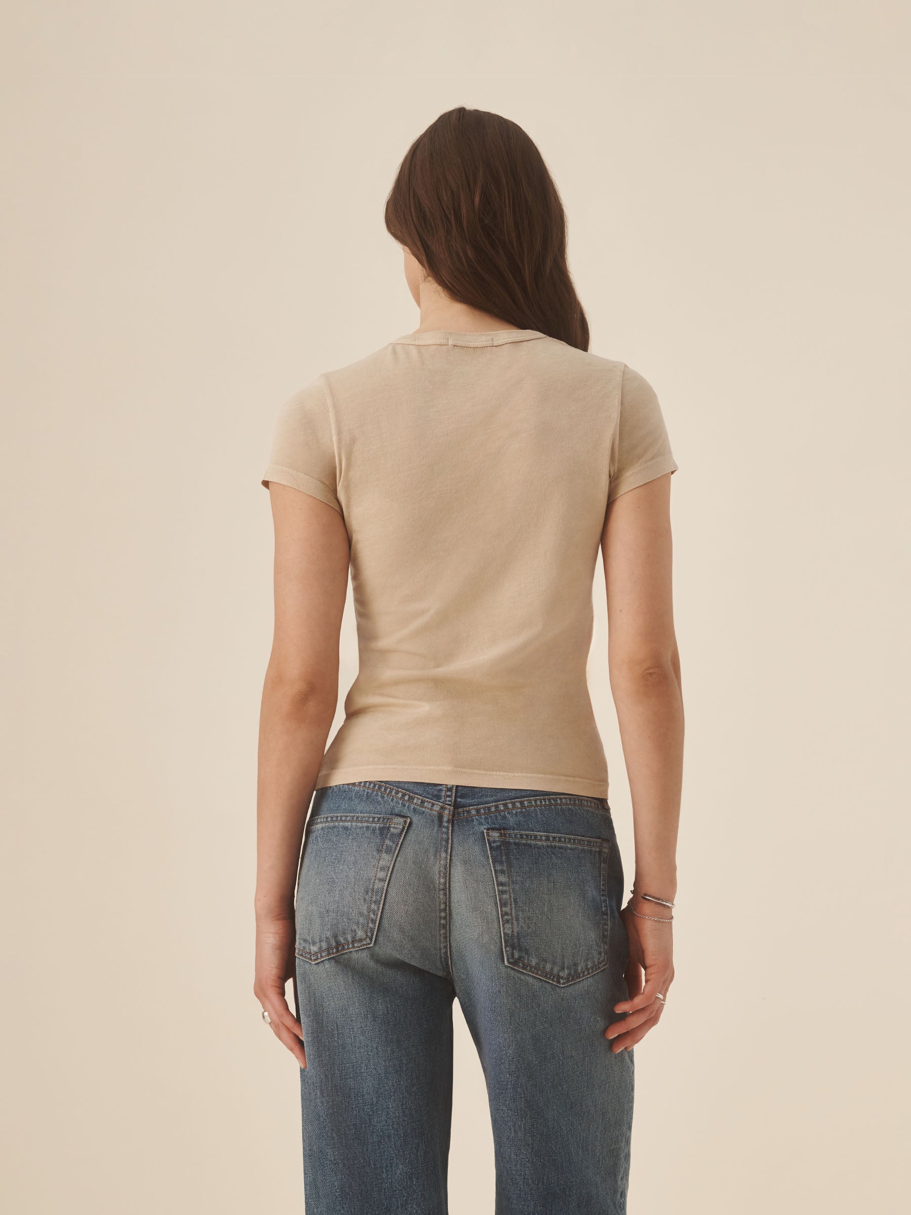 Slim fit short sleeve crewneck tee with a straight hem in 120 GSM jersey, knit from long-staple Supima cotton. Constructed with a durable rib stitch collar and double-needle cover stitch hem. Garment washed with softener for a lived-in feel.
